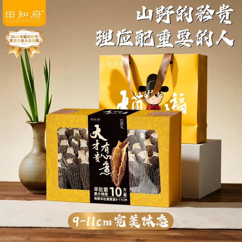 田知府品牌荣获国宾礼称号;京东自营评论1000+;源头厂家;支持授权;项目保护;可定制;邮政上架。;来自云南9-11cm羊肚菌,珍稀品质,高端养生。