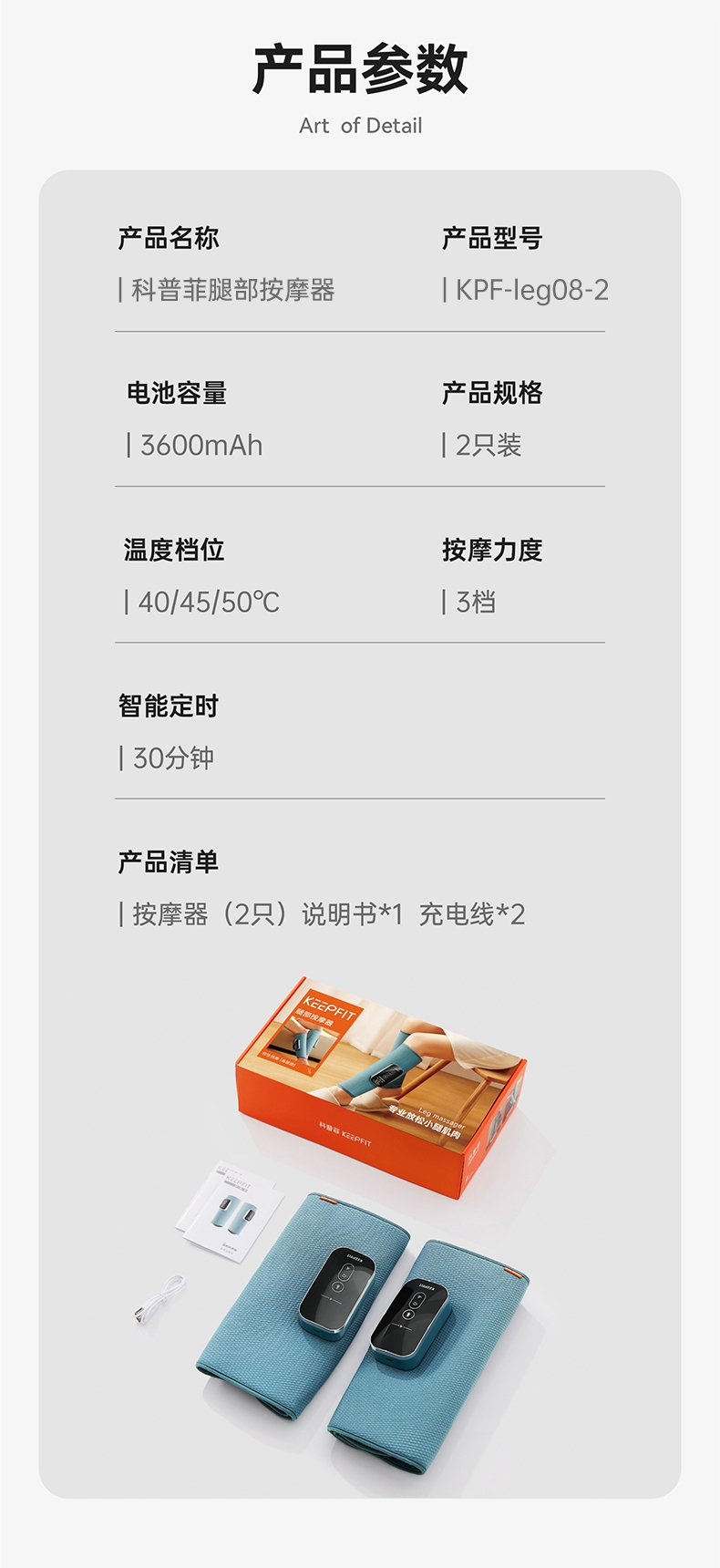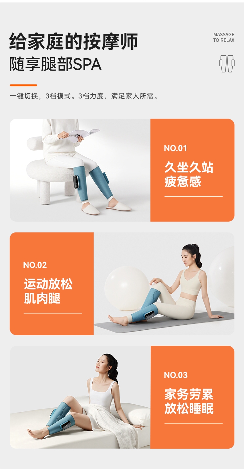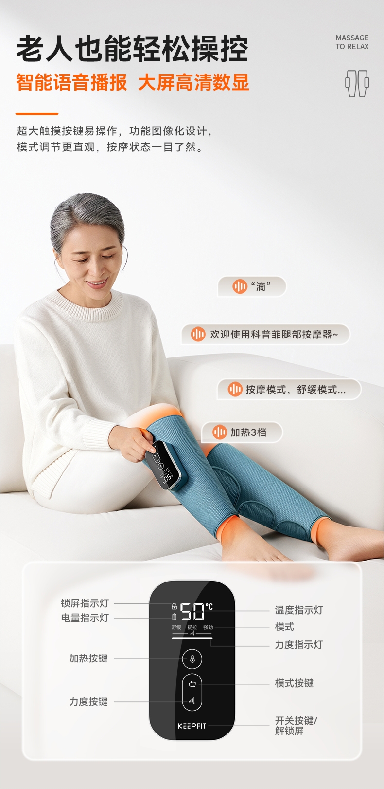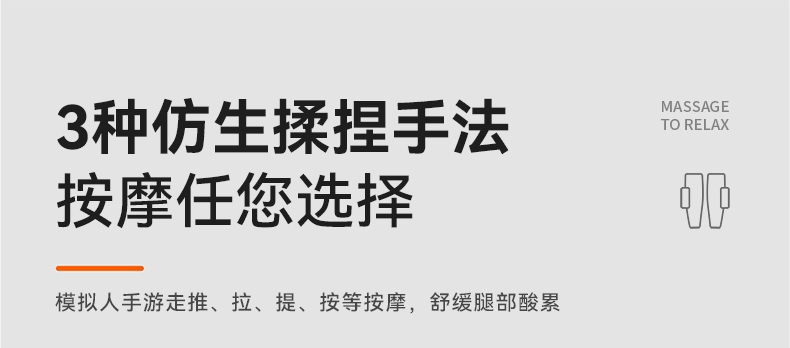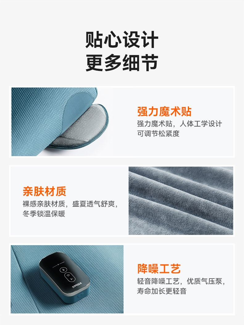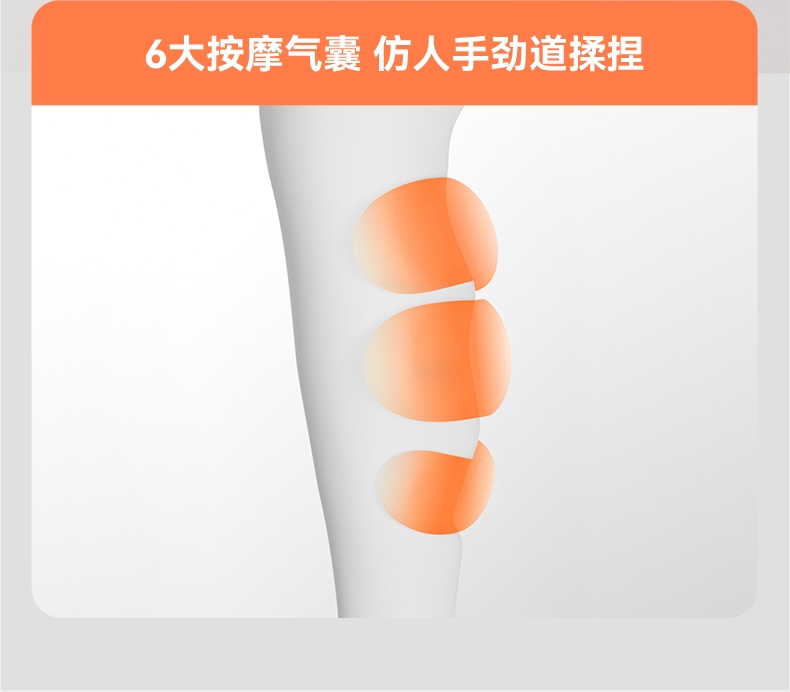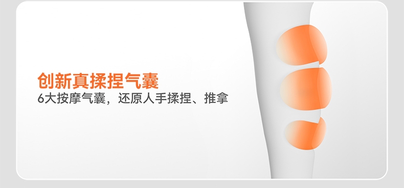 三段式气囊,采用科普菲自研2.5L大充气泵;多样化的揉捏方式:组合方式7种;大屏液晶显示屏+语音播报;三种按摩模式,3档温度调节,3档按摩强度;面层:菱形提花格子布,内侧:丽丝绒亲肤面料