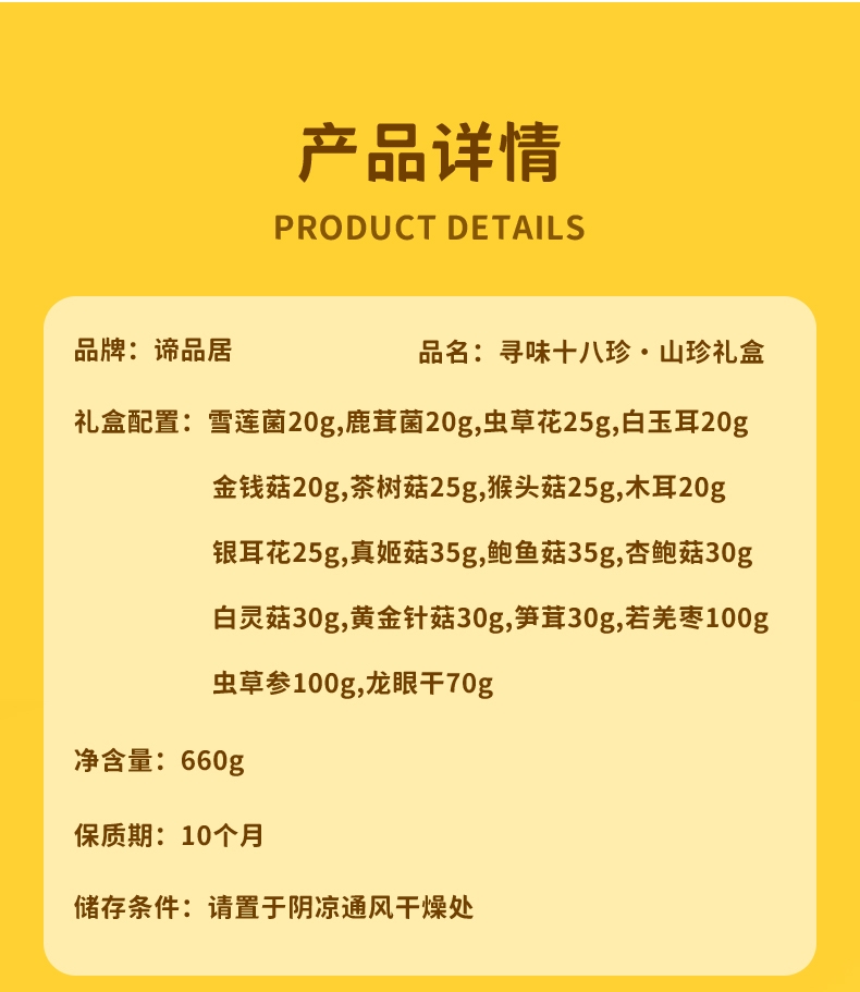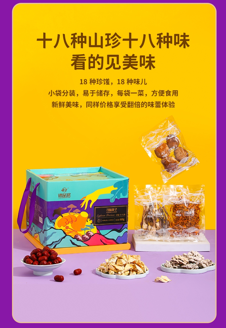 礼盒包装;18种珍馐,18种味儿;小袋分装,易于储存