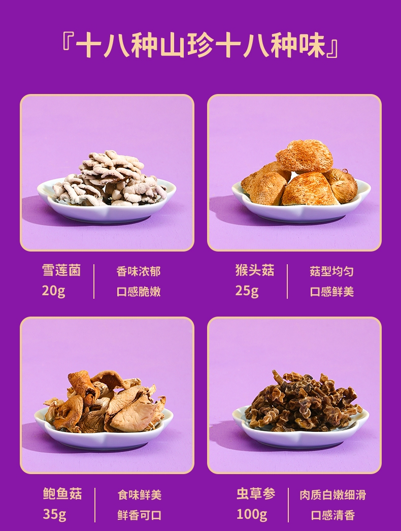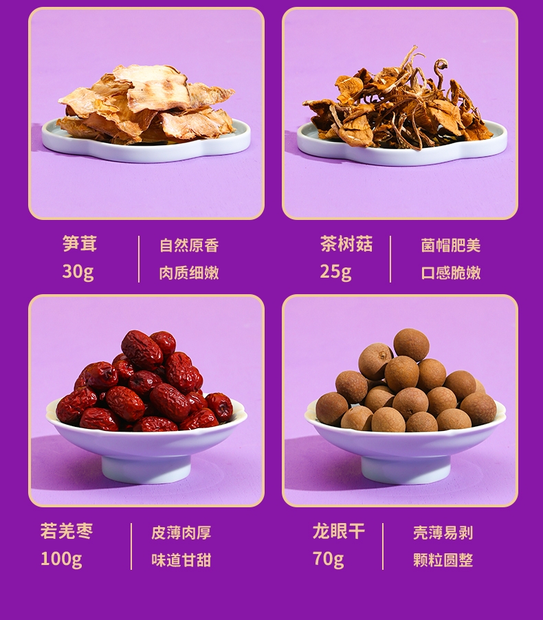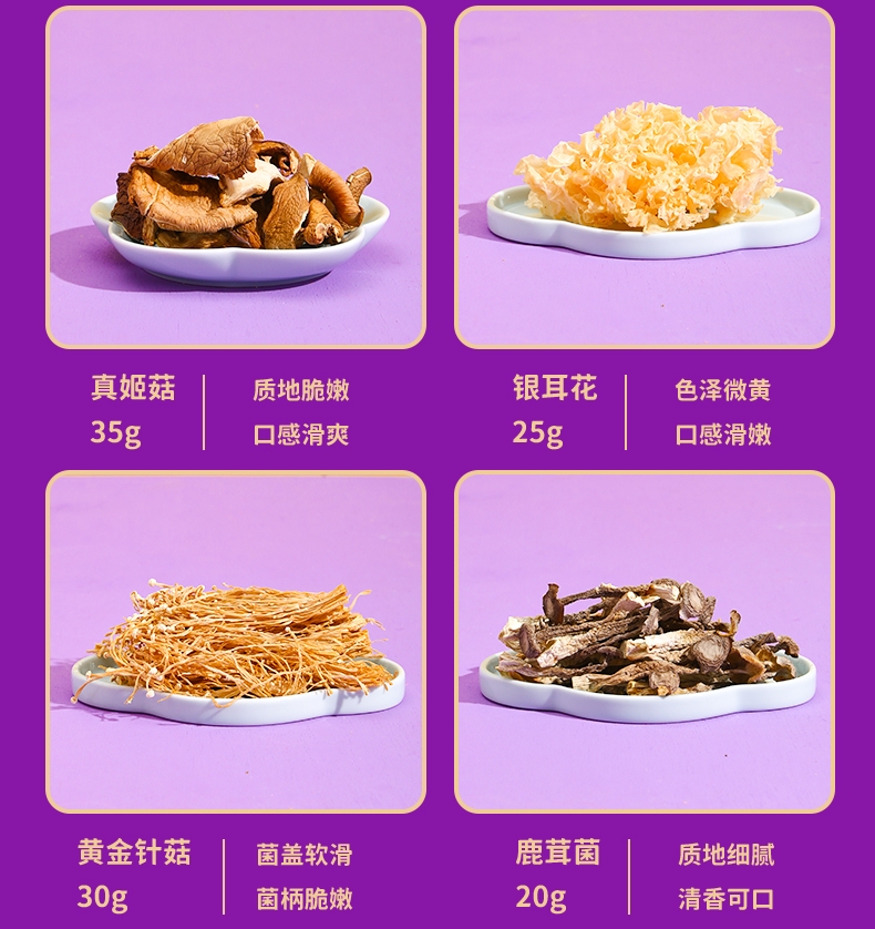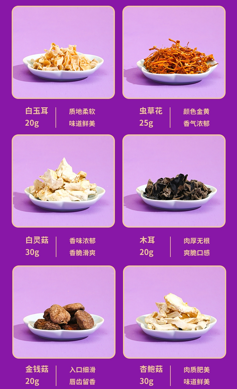 配置:雪莲菌20g鹿茸菌20g虫草花25g白玉耳20g金钱菇20g茶树菇25g猴头菇25g木耳20g银耳花25g真姬菇35g鲍鱼菇35g杏鲍菇30g白灵菇30g金针菇30g笋茸30g若羌枣100g虫草参100g龙眼70g