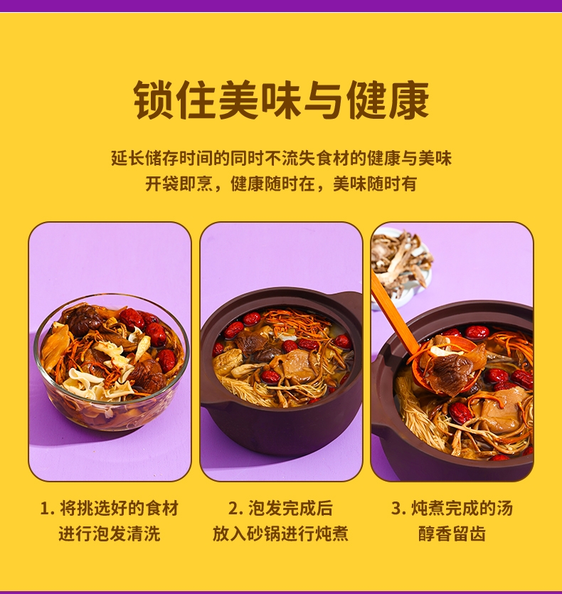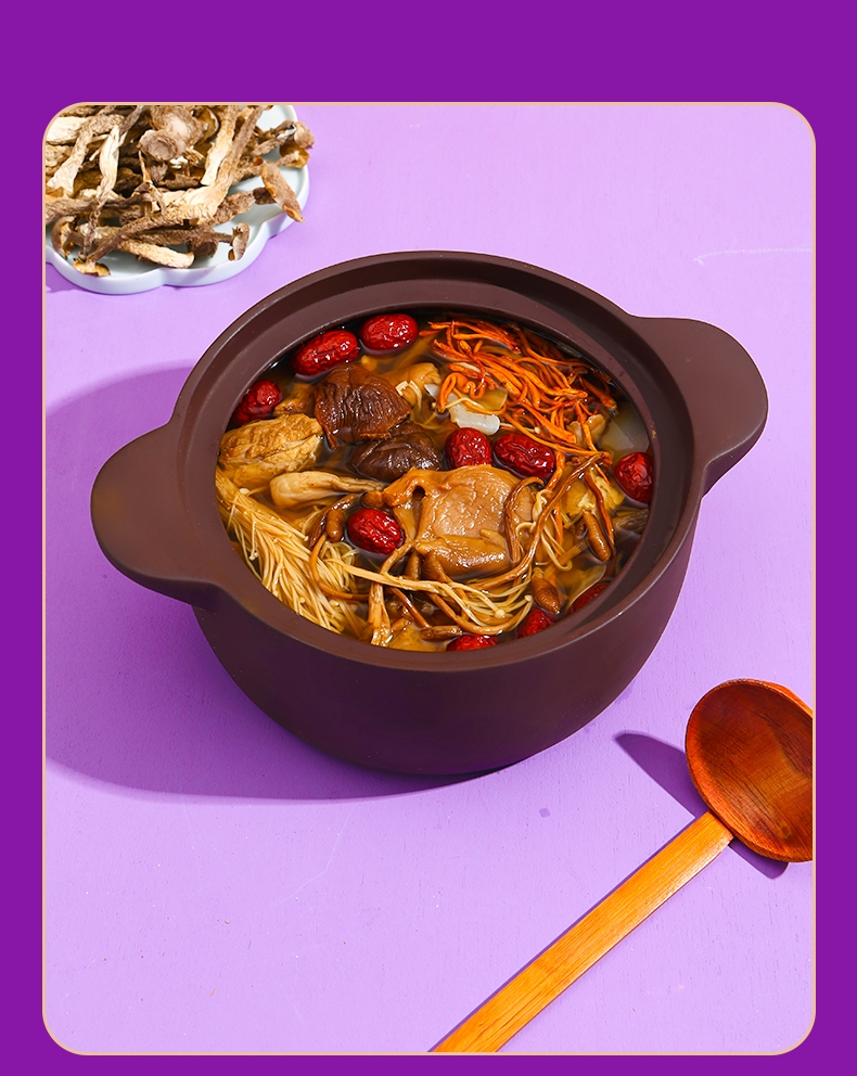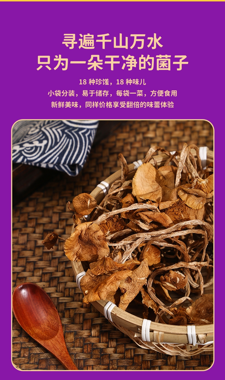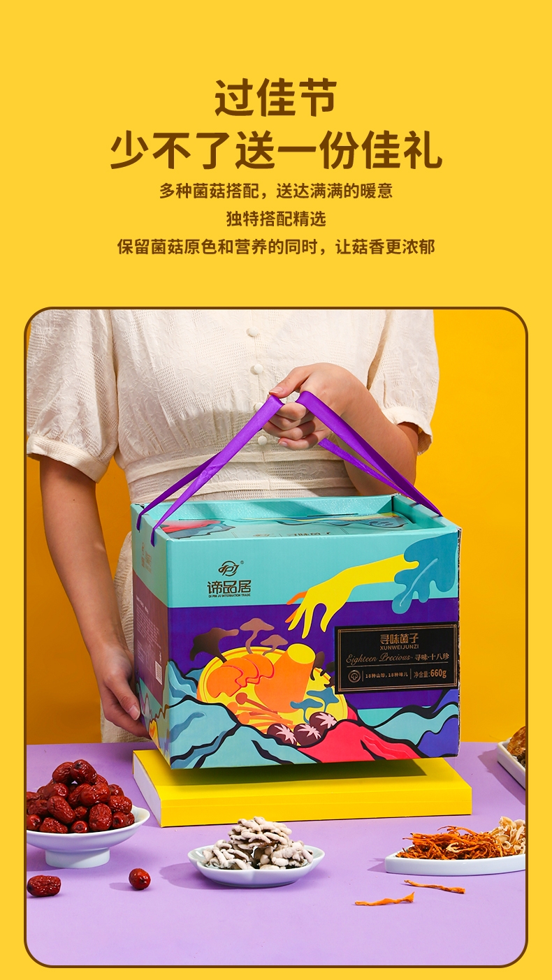 配置:雪莲菌20g鹿茸菌20g虫草花25g白玉耳20g金钱菇20g茶树菇25g猴头菇25g木耳20g银耳花25g真姬菇35g鲍鱼菇35g杏鲍菇30g白灵菇30g金针菇30g笋茸30g若羌枣100g虫草参100g龙眼70g