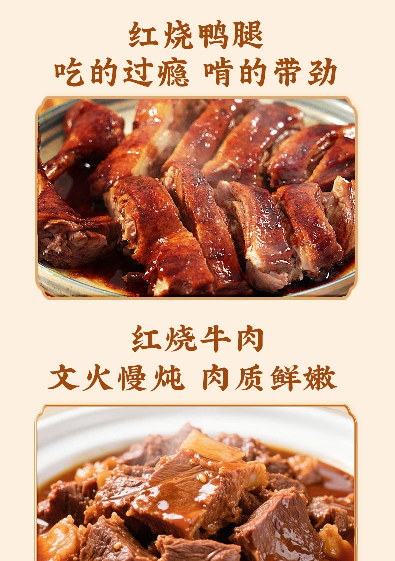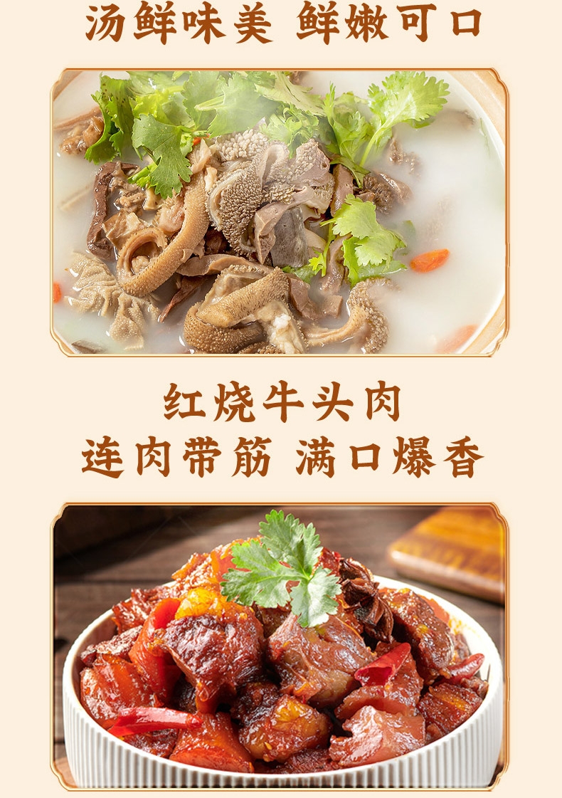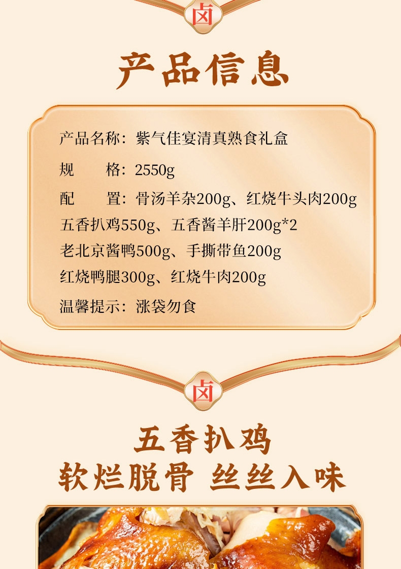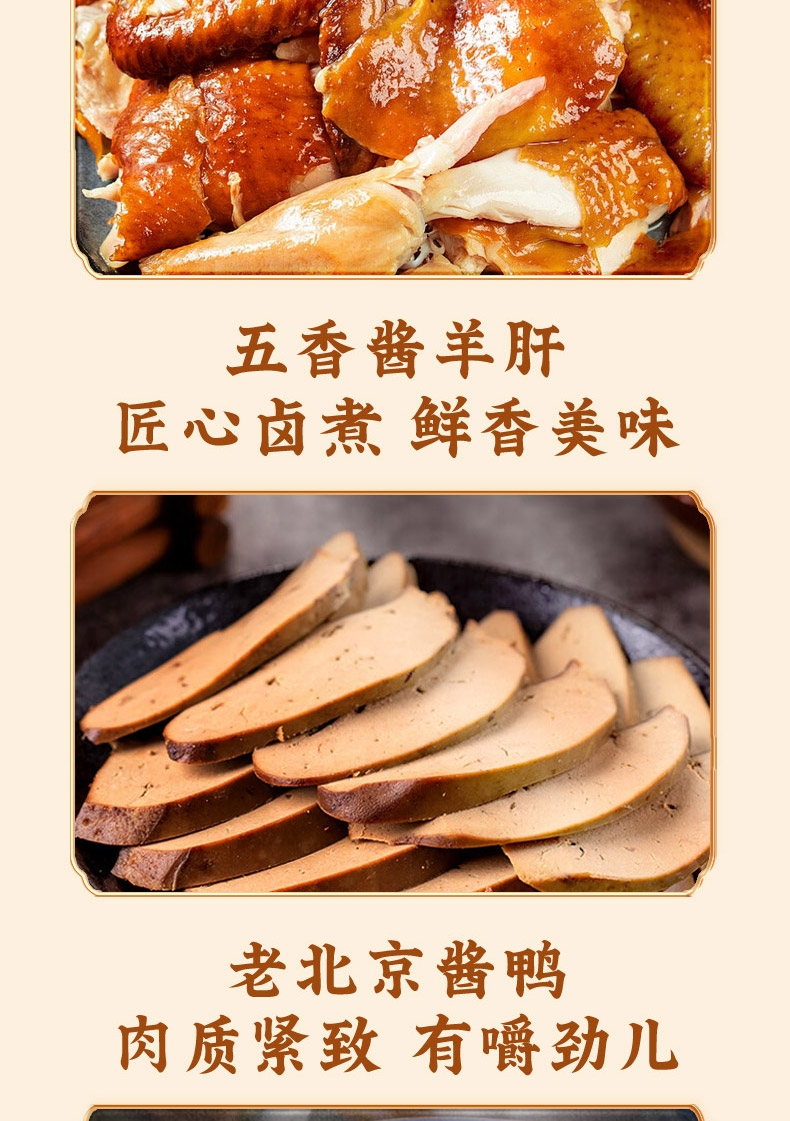 内配:骨汤羊杂200g 红烧牛肉200g 红烧牛头肉200g 红烧鸭腿300g 五香扒鸡550g 五香酱羊肝200g*2 老北京酱鸭500g 手撕带鱼200g