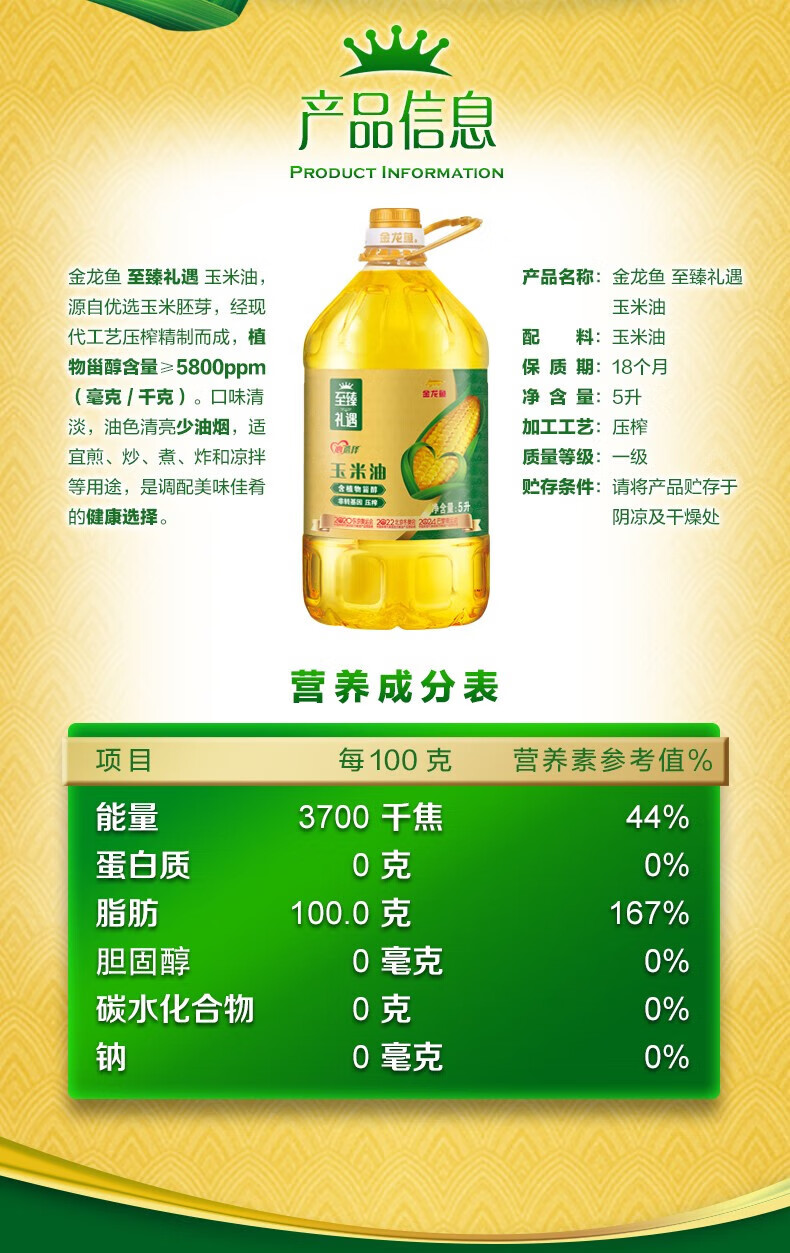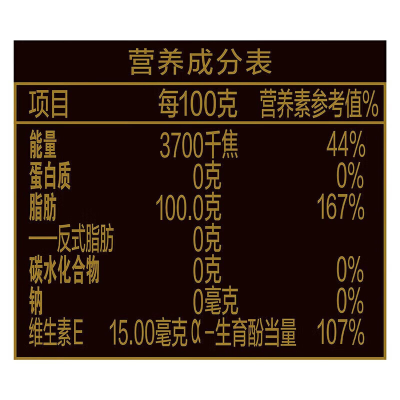 油色清亮,口感清香,可煎、炒、烹、炸、凉拌;零添加,零反式脂肪;优质原料