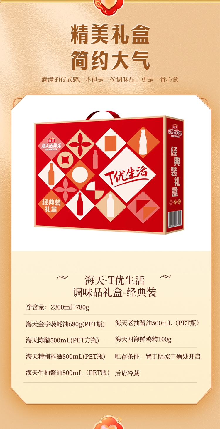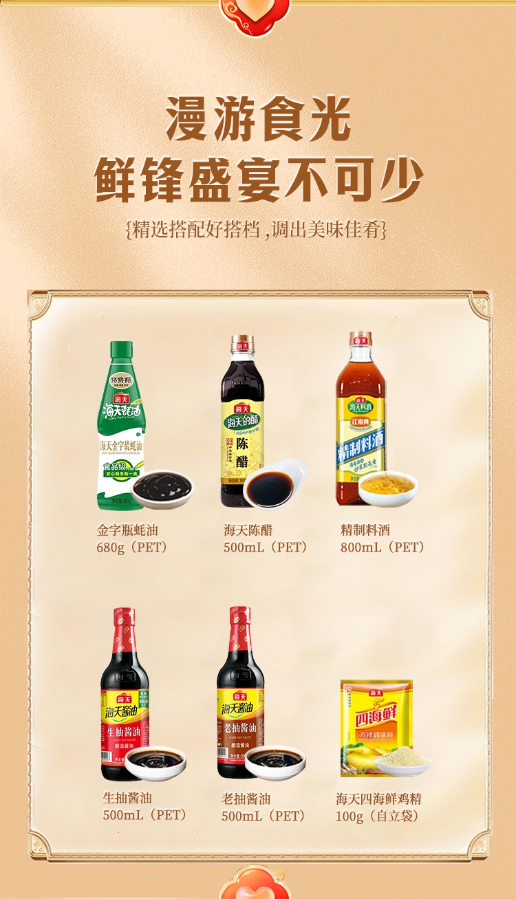 配置清单:海天金字装蚝油680g(PET瓶) 海天陈醋500mL(PET方瓶) 海天精制料酒800mL(PET瓶) 海天生抽酱油500mL(PET瓶) 海天老抽酱油500mL(PET瓶) 海天四海鲜鸡精100g
