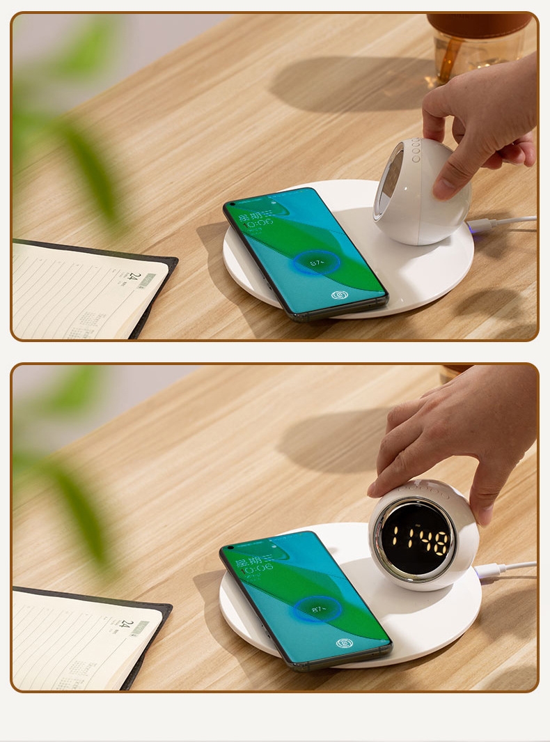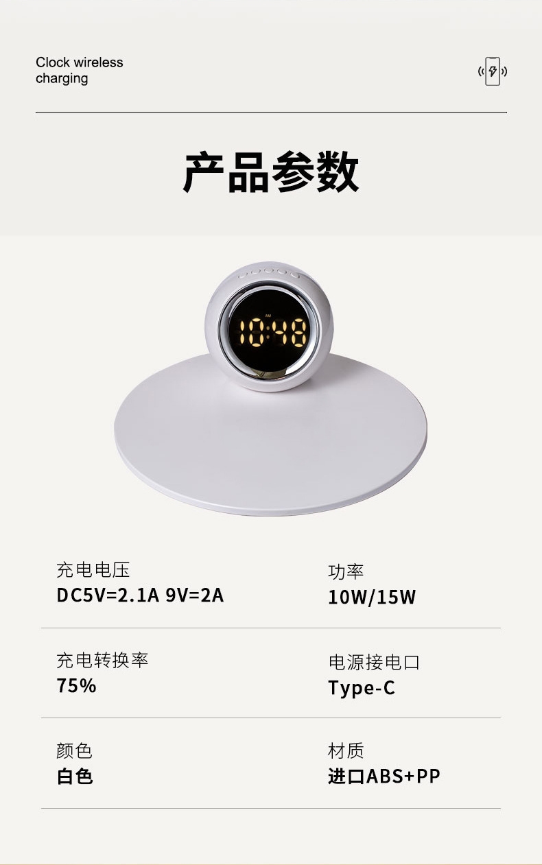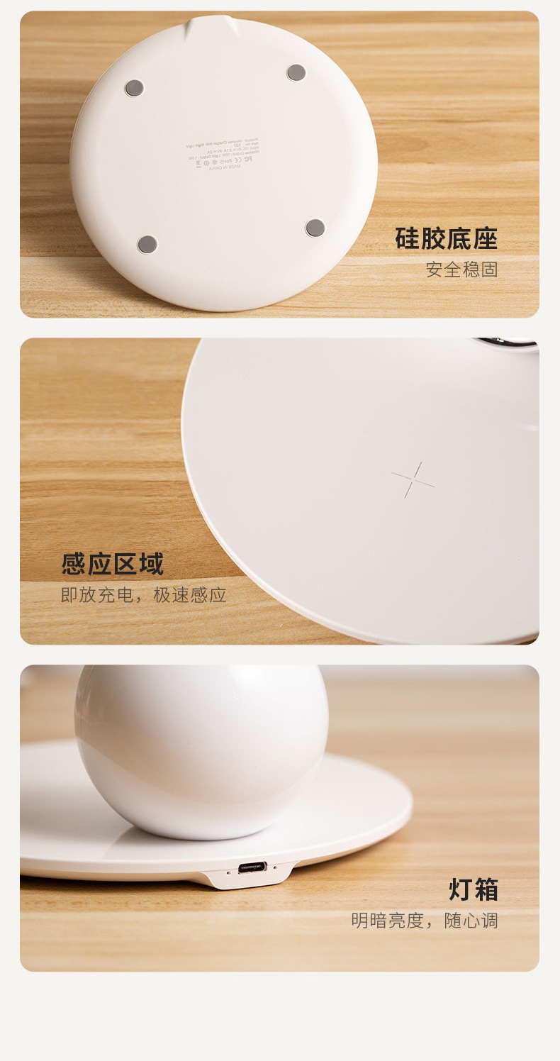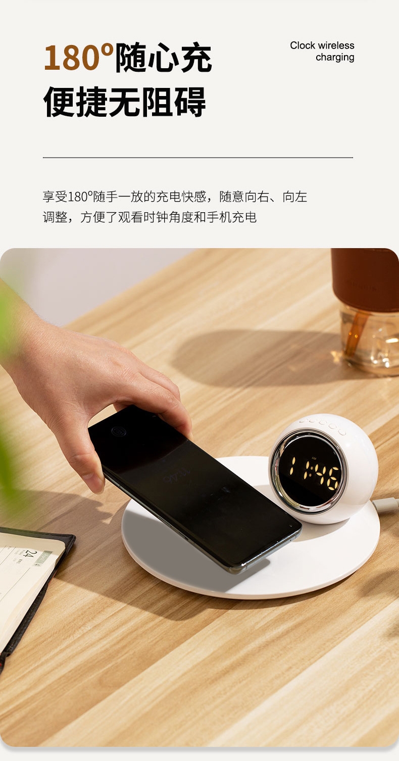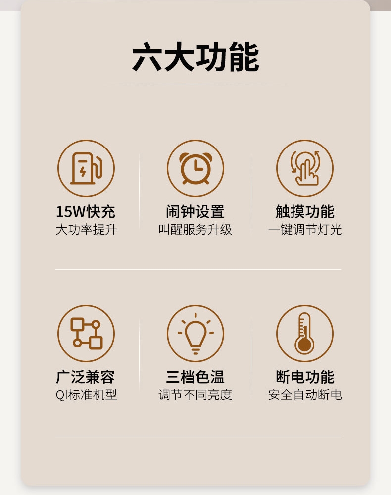 手机即放即充,无线束缚。;15W大功率,速充不伤机。;闹钟设置,叫醒服务升级。;触摸功能,一键调节灯光。;三档色温,调节不同亮度。