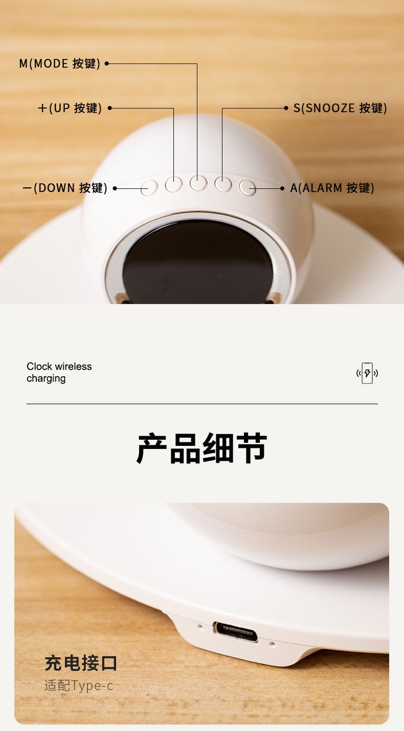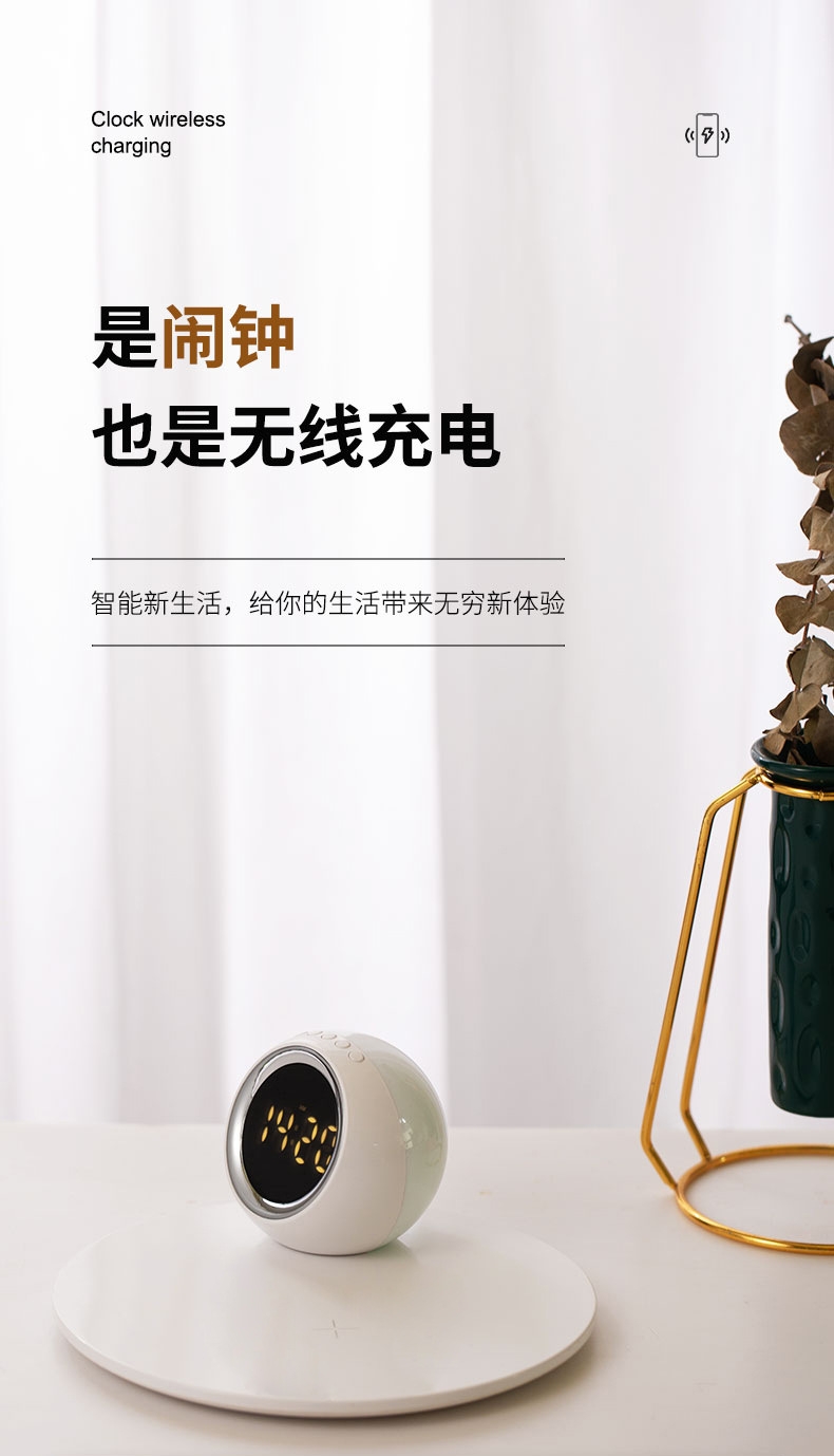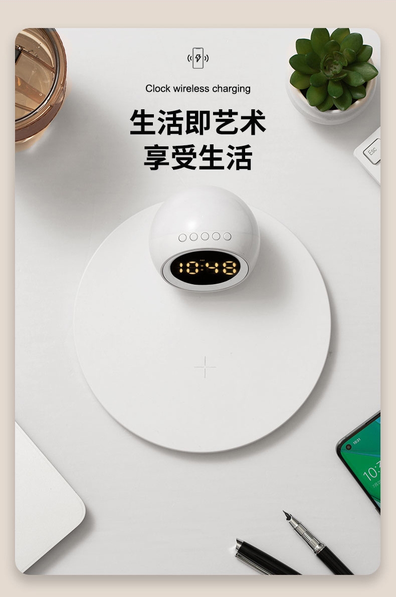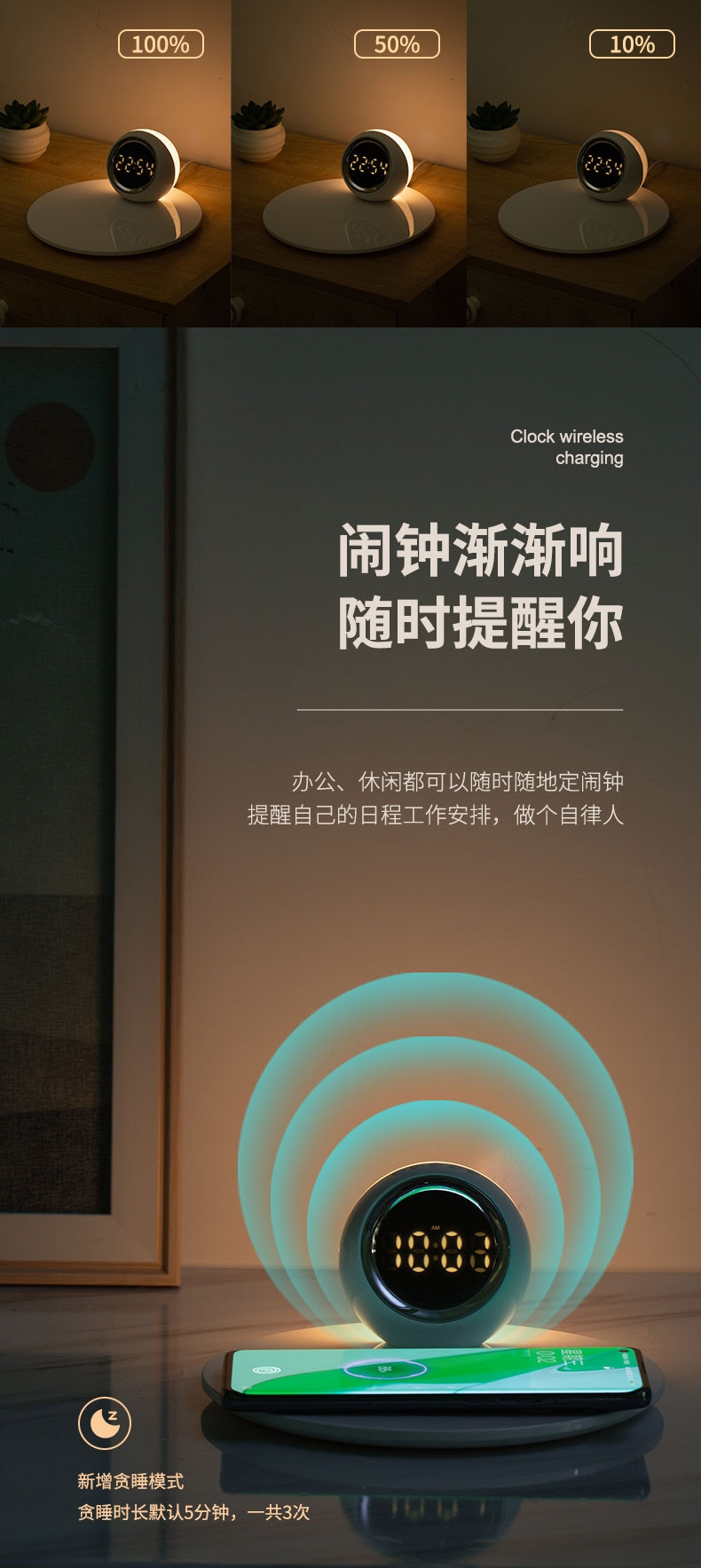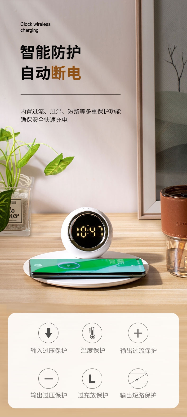 手机即放即充,无线束缚。;15W大功率,速充不伤机。;闹钟设置,叫醒服务升级。;触摸功能,一键调节灯光。;三档色温,调节不同亮度。