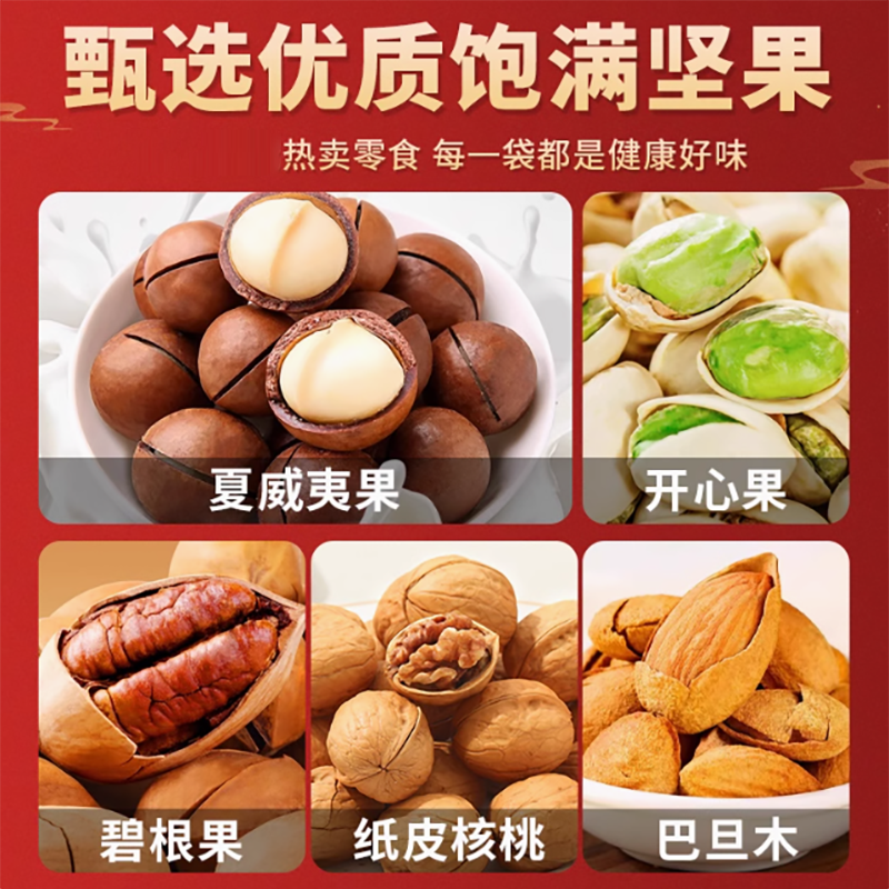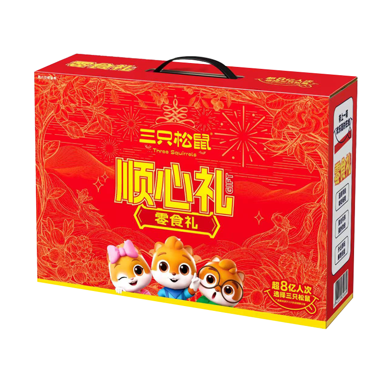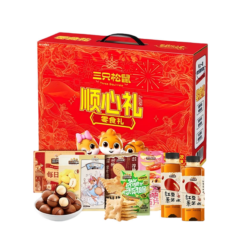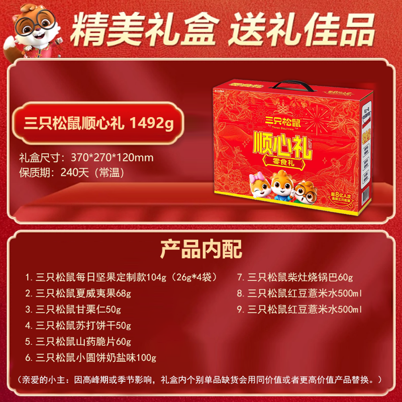内配:三只松鼠每日坚果定制款104g(26g*4袋) 三只松鼠夏威夷果68g 三只松鼠甘栗仁50g 三只松鼠苏打饼干50g 三只松鼠山药脆片60g 三只松鼠小圆饼奶盐味100g 三只松鼠柴灶烧锅巴60g 三只松鼠红豆薏米水500ml 三只松鼠红豆薏米水500ml