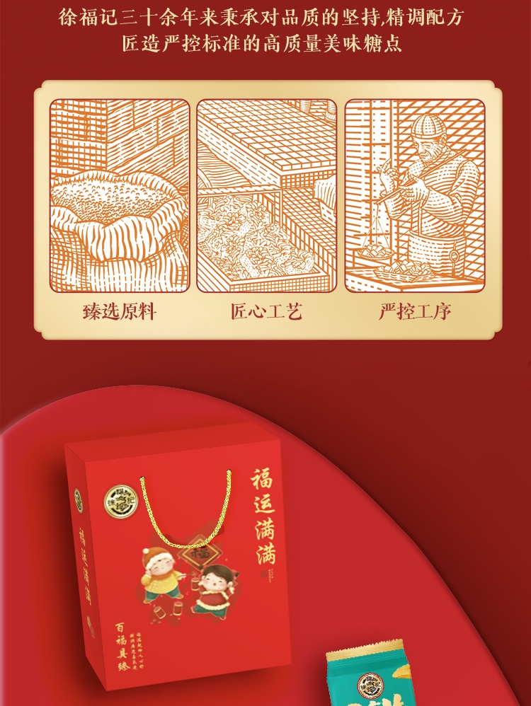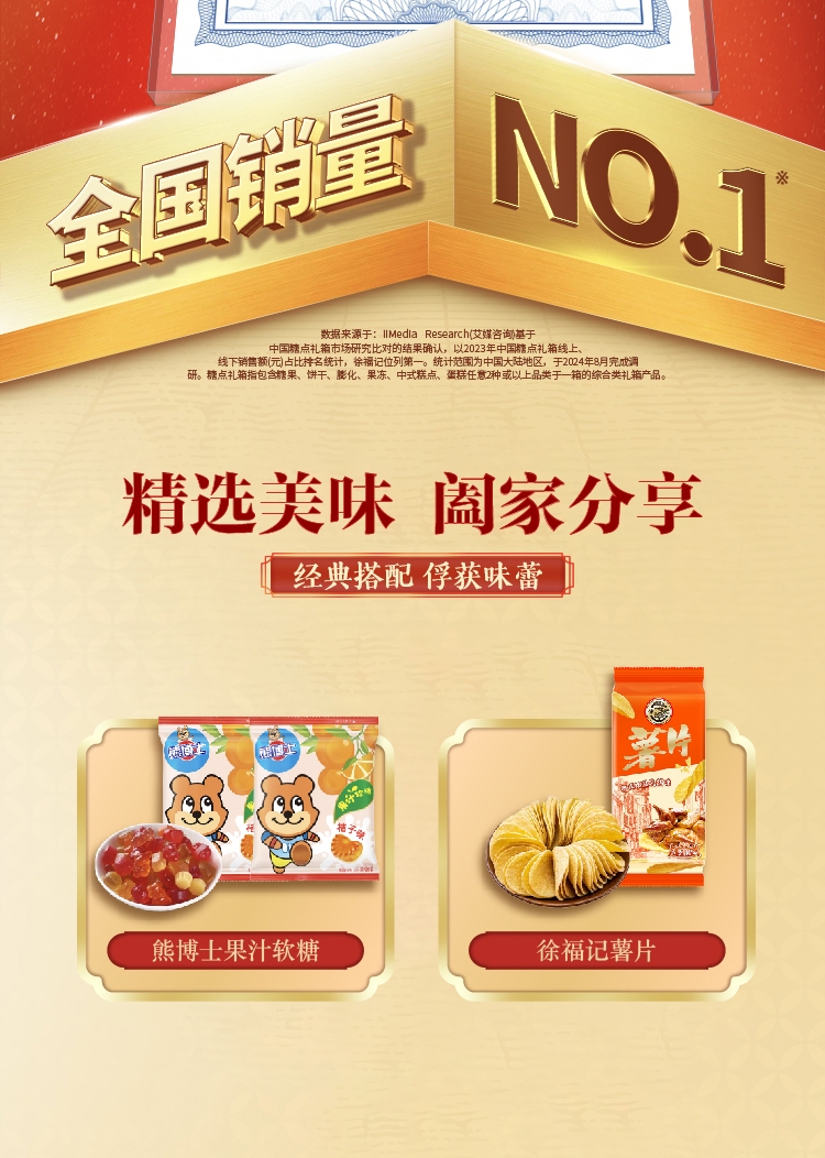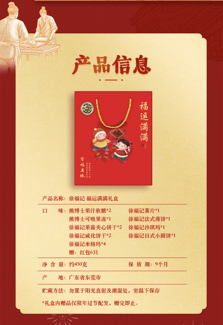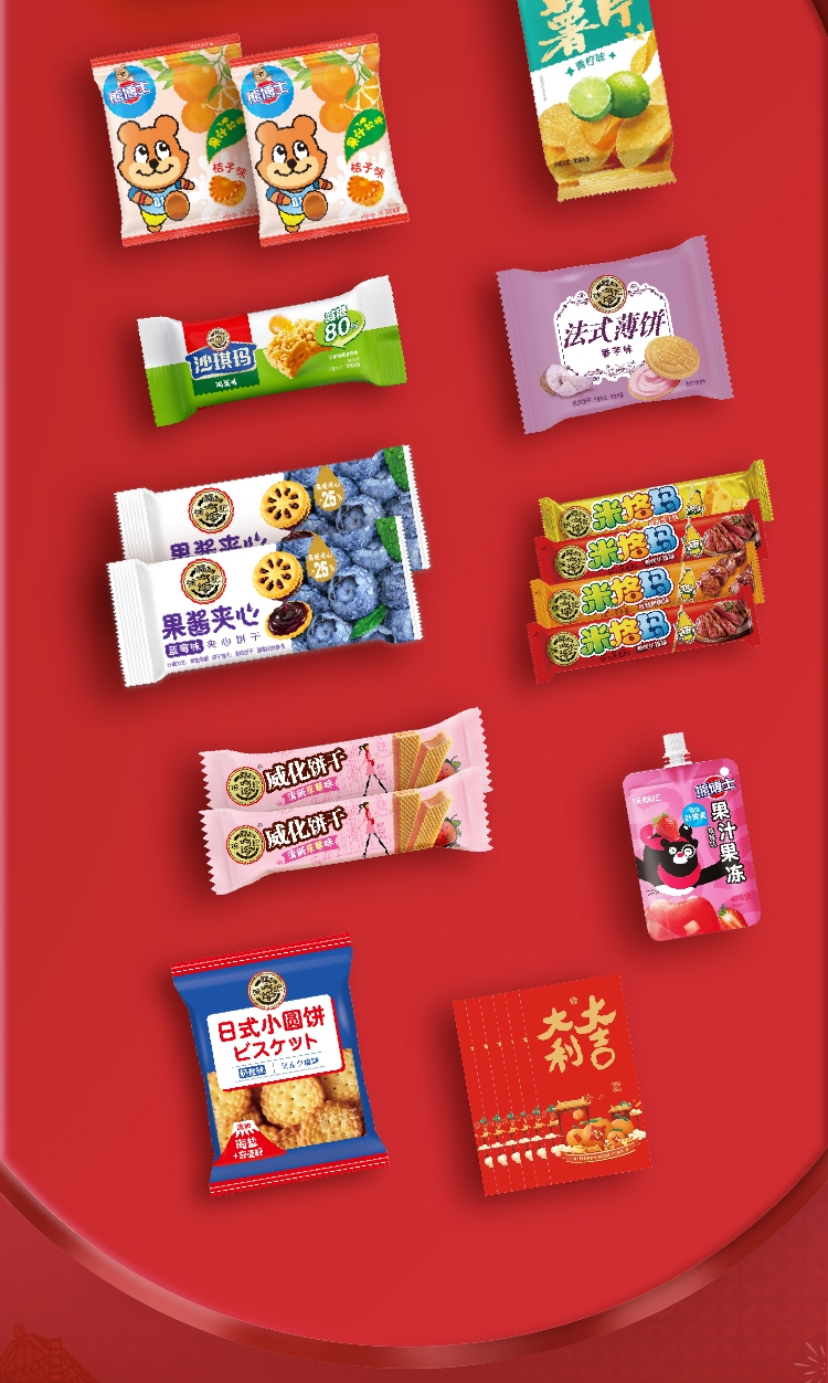 配置:熊博士果汁软糖20g*2 熊博士可吸果冻150g*1 徐福记果酱夹心饼干*2 徐福记威化饼干*2 徐福记米格玛*4 徐福记薯片*1 徐福记法式薄饼*1 徐福记沙琪玛*1 徐福记日式小圆饼*1 赠送红包6只