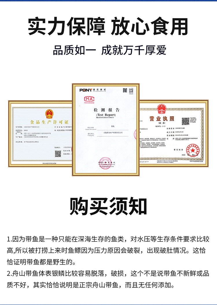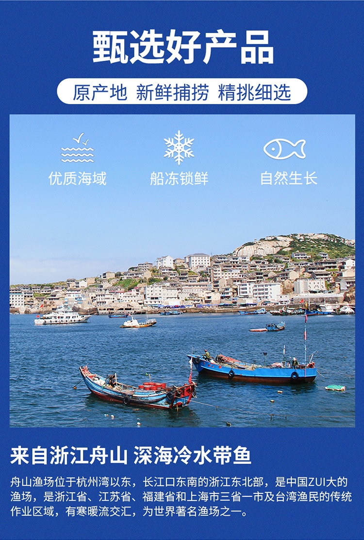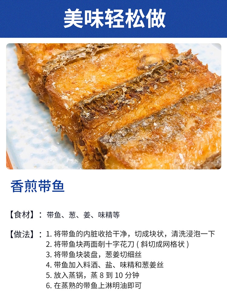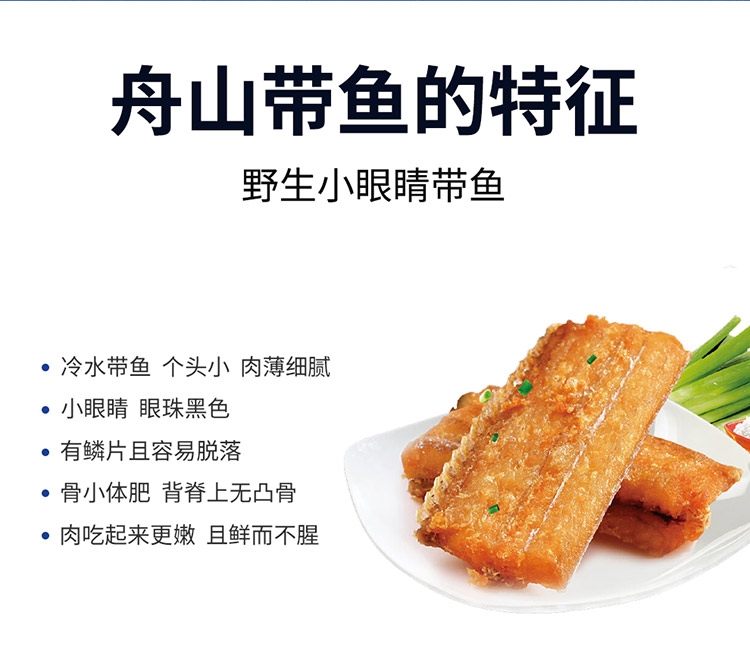 冷水带鱼个头小肉薄细腻;小眼睛 眼珠黑色;优质的鱼肉肉质紧密,鲜美细腻,肉嫩而富有弹性。