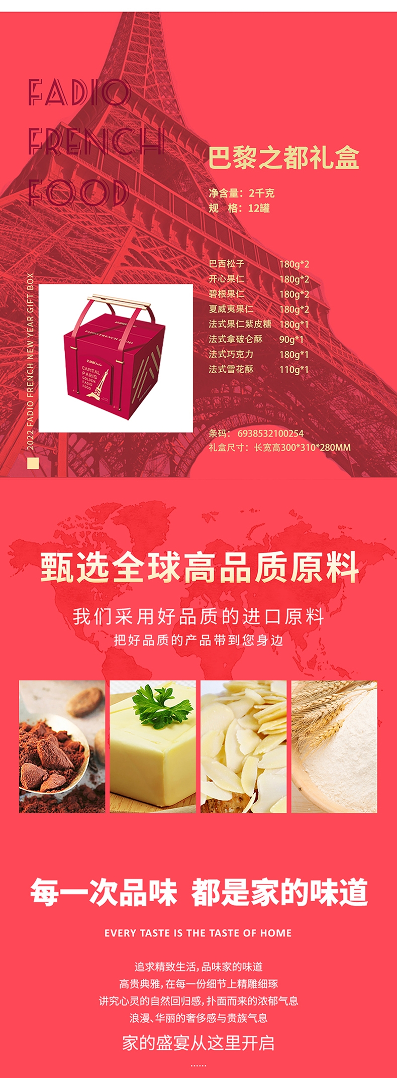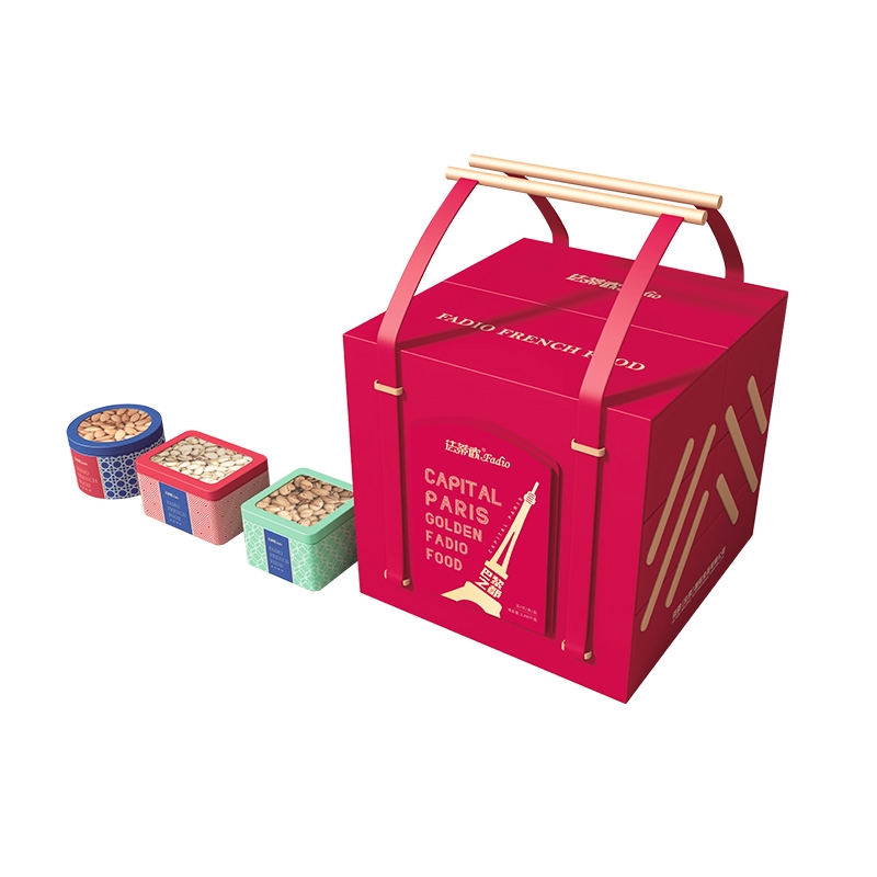 配置:巴西松子 铁罐180g开心果仁 铁罐180g碧根果仁 铁罐180g夏威夷果仁 铁罐180g果仁紫皮糖 铁罐180g法式拿破仑酥 铁罐90g法式巧克力 铁罐180g法式雪花酥 铁罐110g