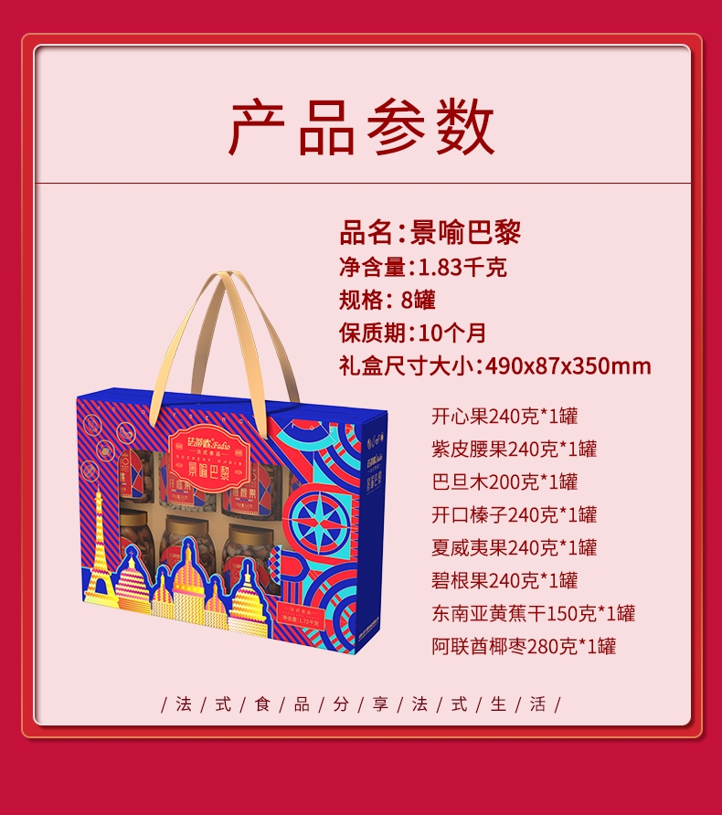 景喻巴黎浪漫坚果盛宴1.83kg员工福利企业团购;内配丰富 包装新颖时尚 承接个性定制;让我们一起用这份满载心意的礼盒开启一段浪漫味觉之旅