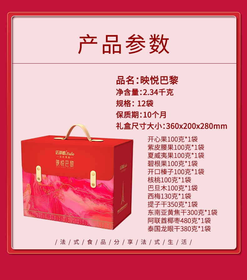 映悦巴黎浪漫坚果盛宴2.34kg员工福利企业团购;内配丰富 包装新颖时尚 承接个性定制;让我们一起用这份满载心意的礼盒开启一段浪漫味觉之旅