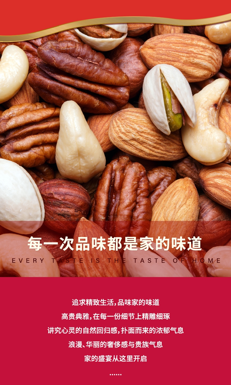 配置:开心果100g紫皮腰果100g夏威夷果100g碧根果100g开口榛子100g核桃100g巴旦木100g西梅130g提子干350g东南亚黄蕉干300g阿联酋椰枣480g泰国龙眼干380g