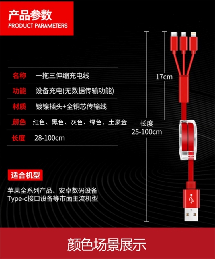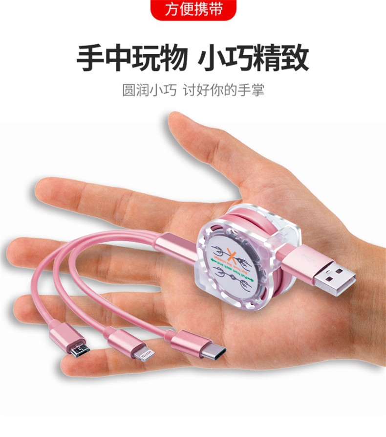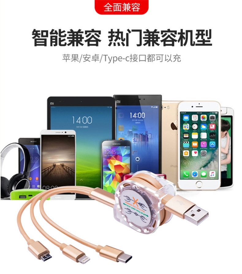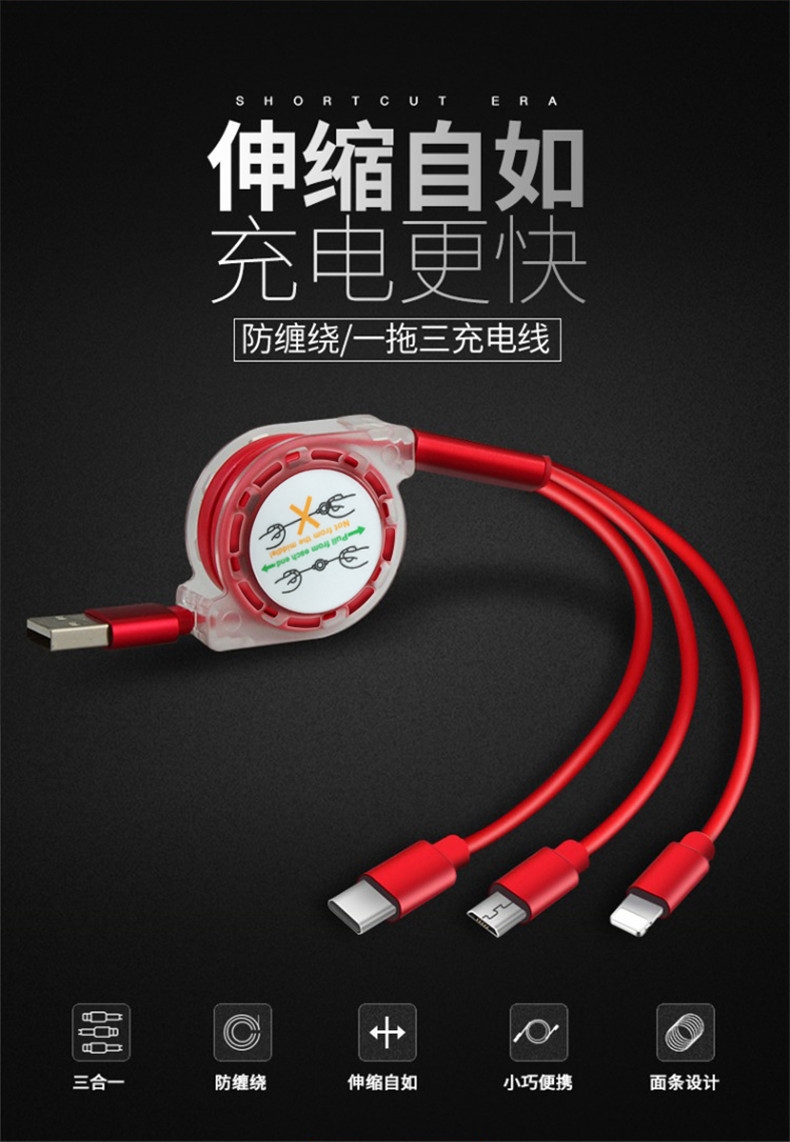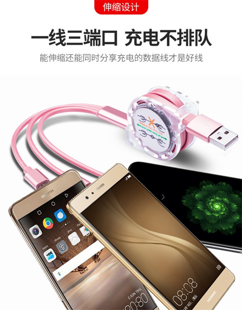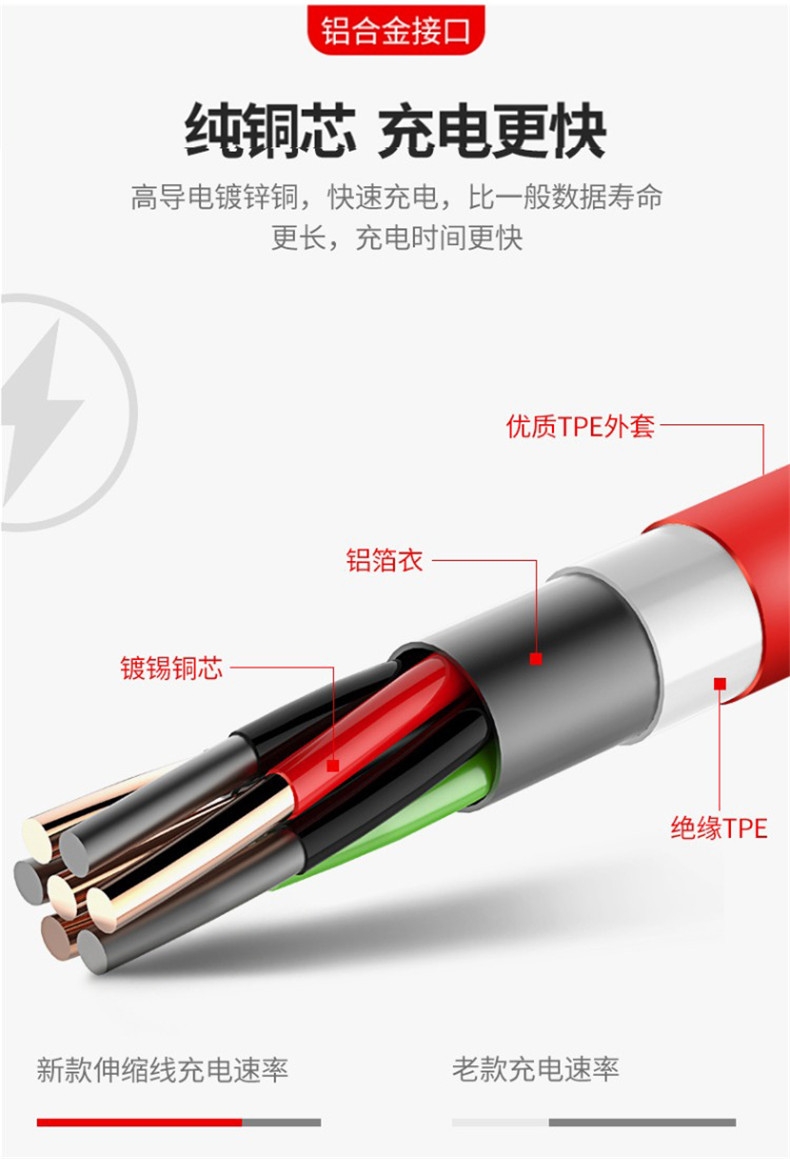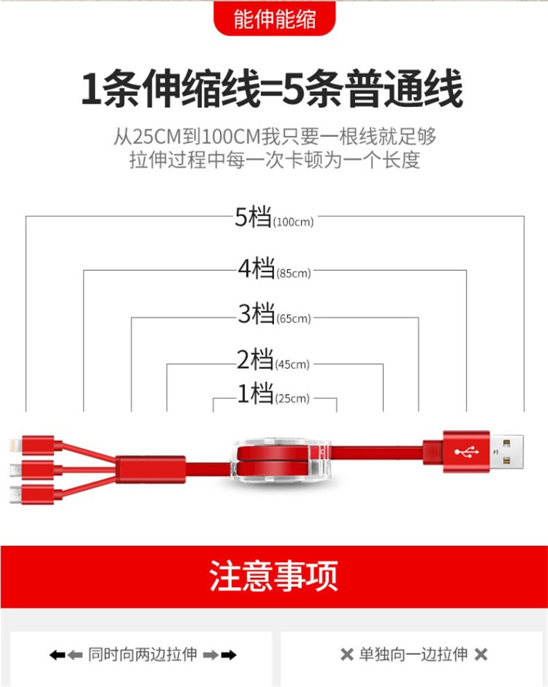 一秒收纳 五档伸缩; 更粗铜芯 充电提速; 一线三用 兼容所有