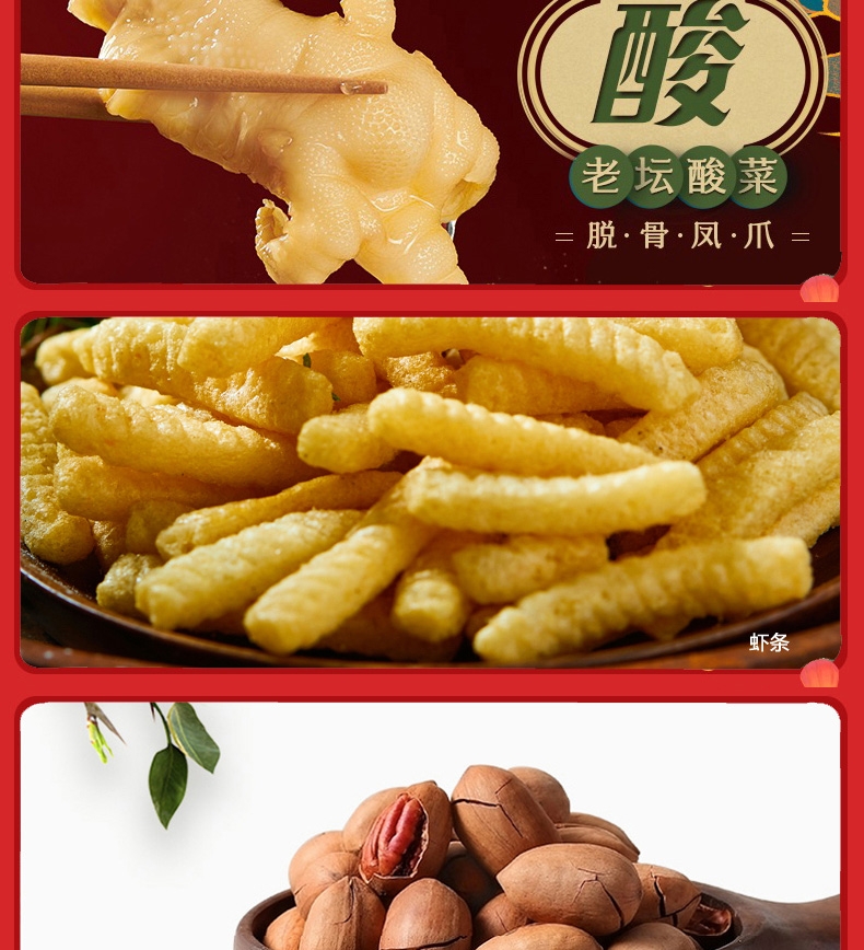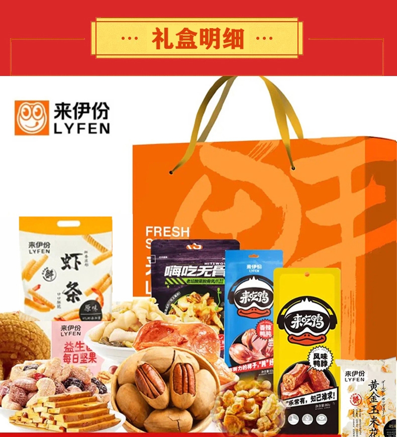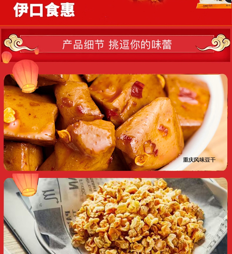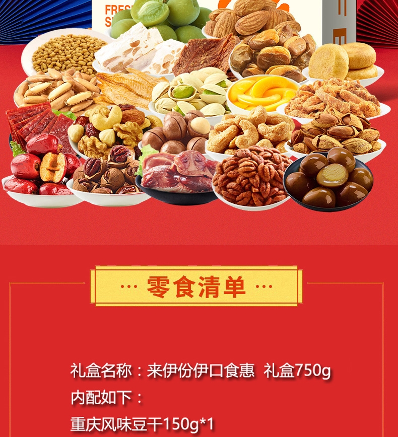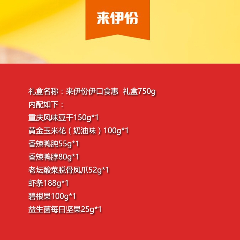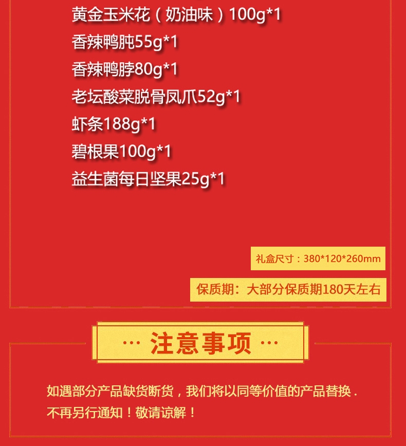 配置:重庆风味豆干150g*1 黄金玉米花(奶油味)100g*1 香辣鸭肫55g*1 香辣鸭脖80g*1 老坛酸菜脱骨凤爪52g*1 虾条188g*1 碧根果100g*1 益生菌每日坚果25g*1