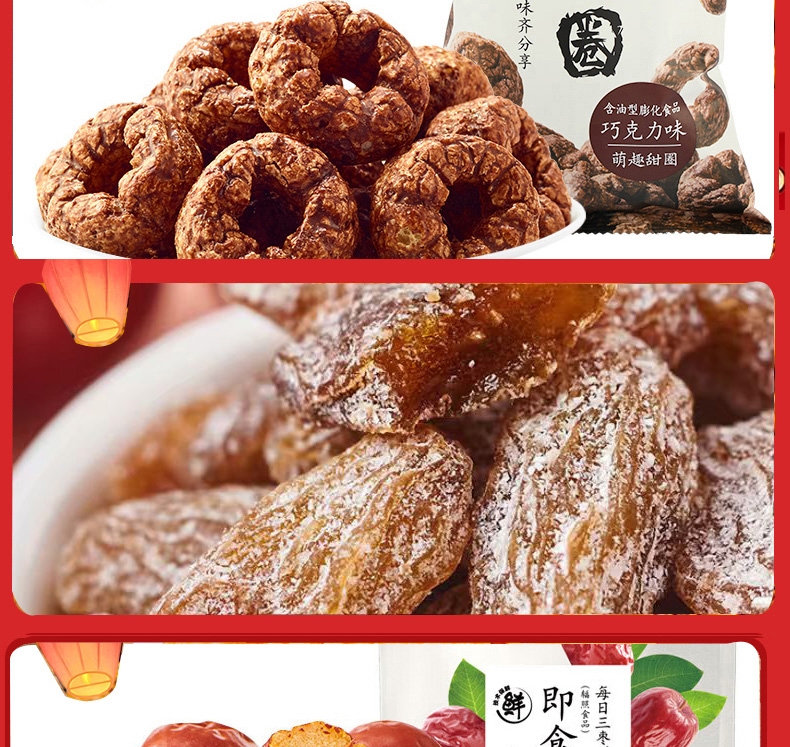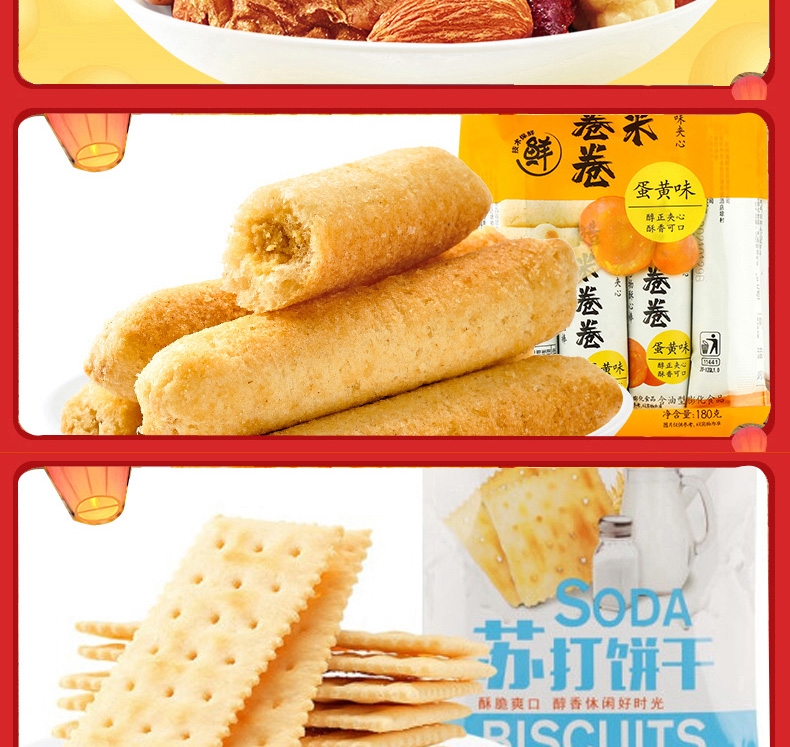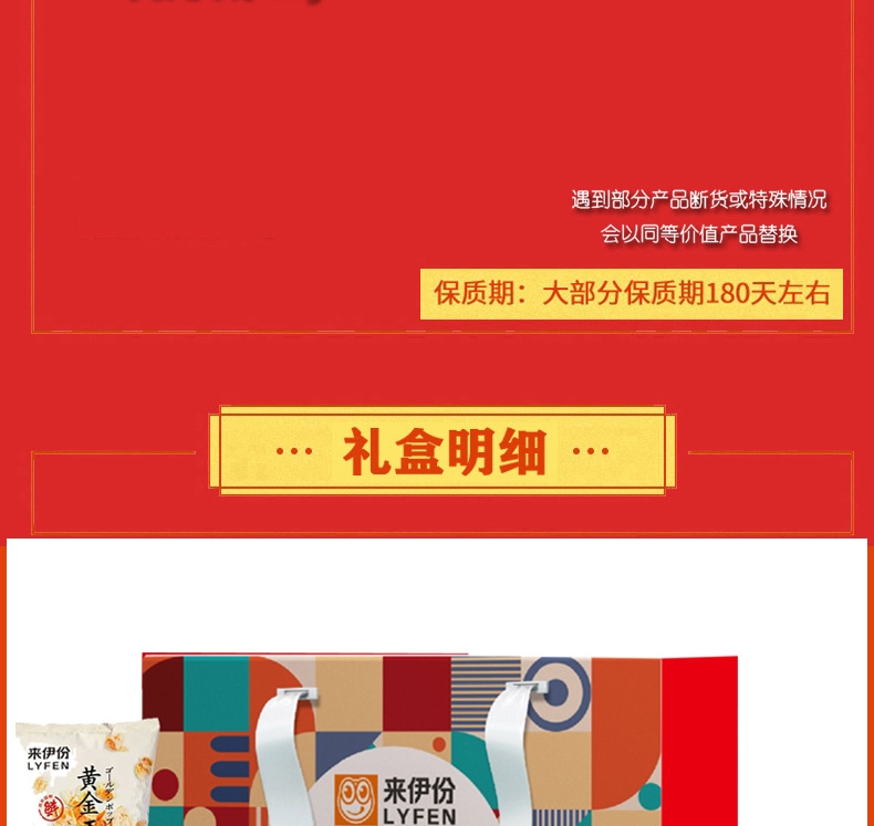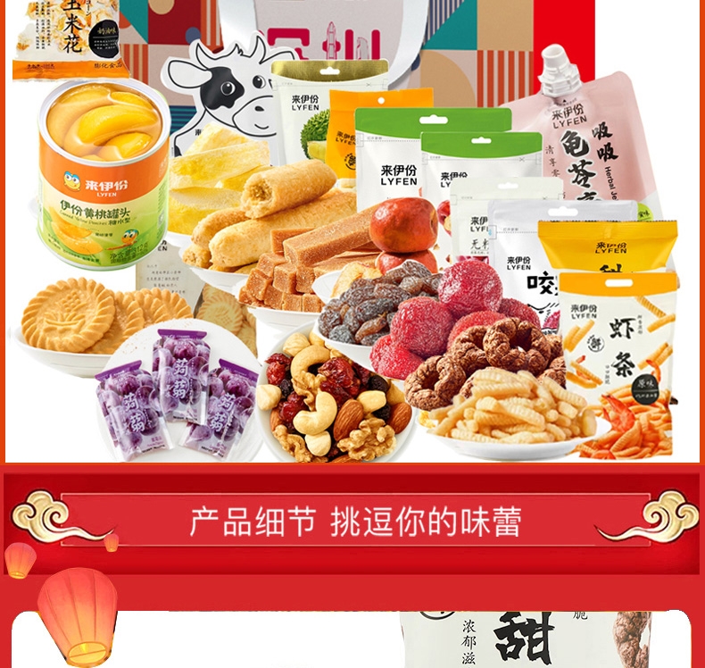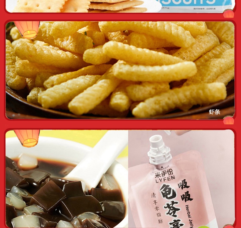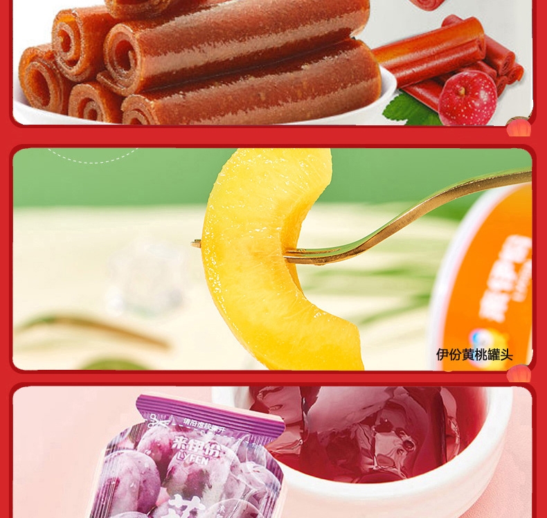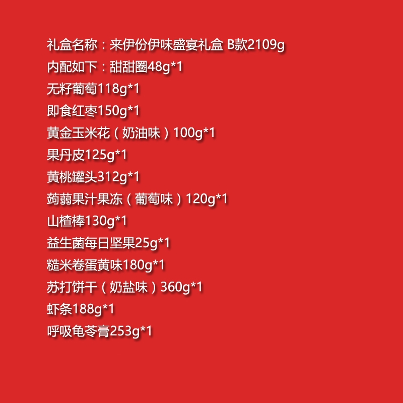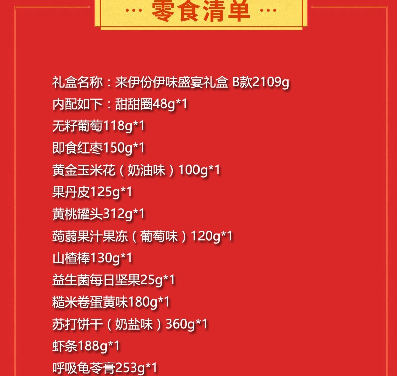 配置:甜甜圈48g*1 无籽葡萄118g*1 即食红枣150g*1 黄金玉米花(奶油味)100g*1 果丹皮125g*1 黄桃罐头312g*1 蒟蒻果汁果冻(葡萄味)120g*1 山楂棒130g*1 益生菌每日坚果25g*1 糙米卷蛋黄味180g*1 苏打饼干(奶盐味)360g*1 虾条188g*1 呼吸龟苓膏253g*1