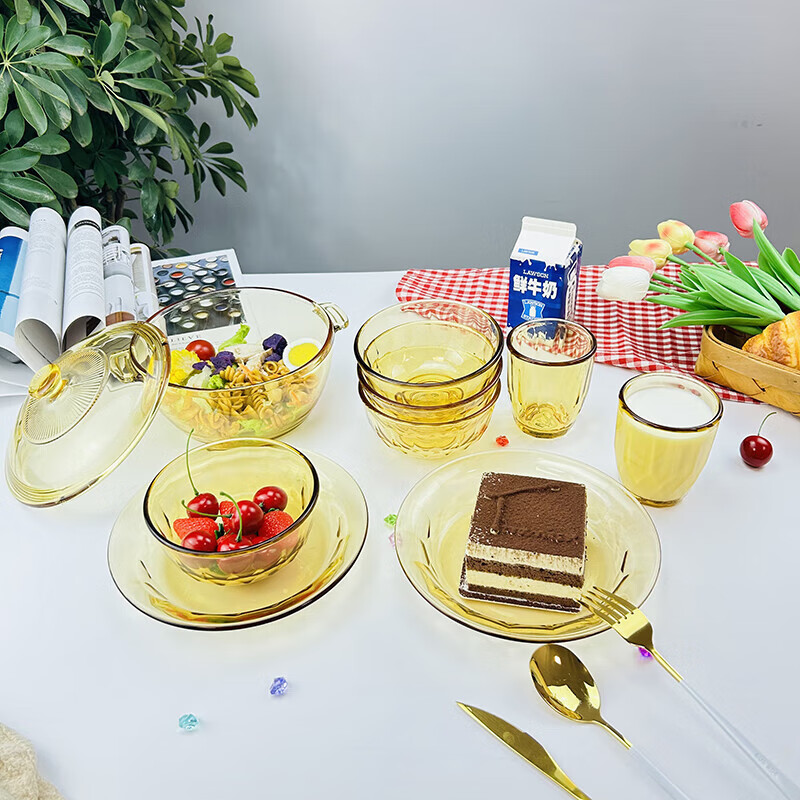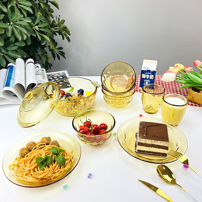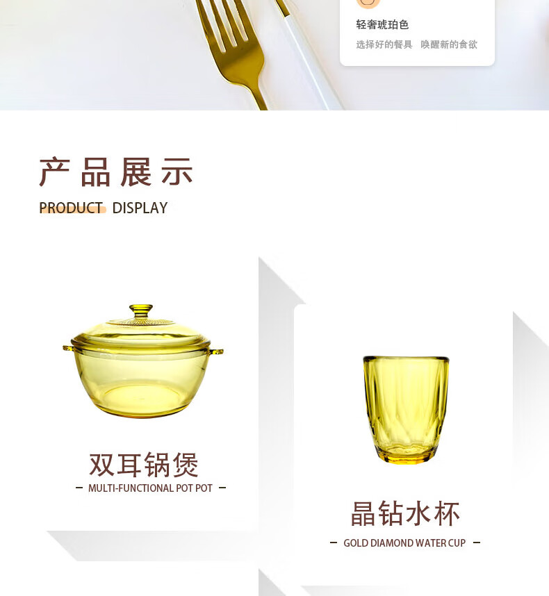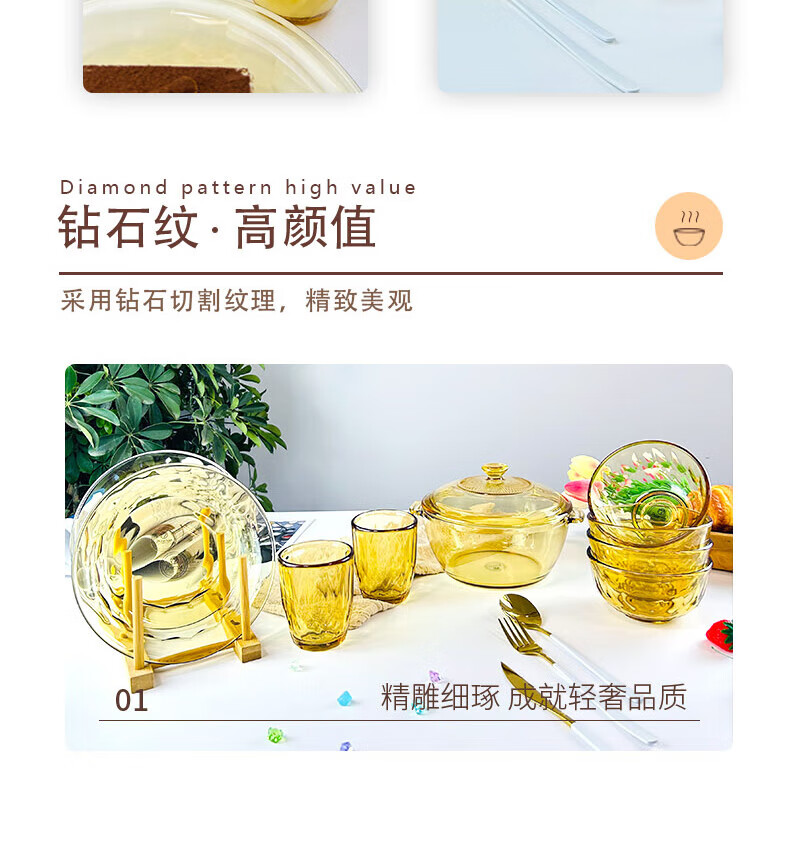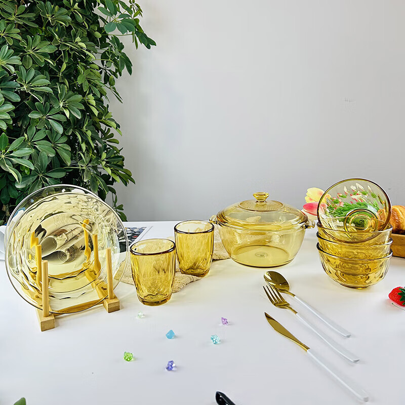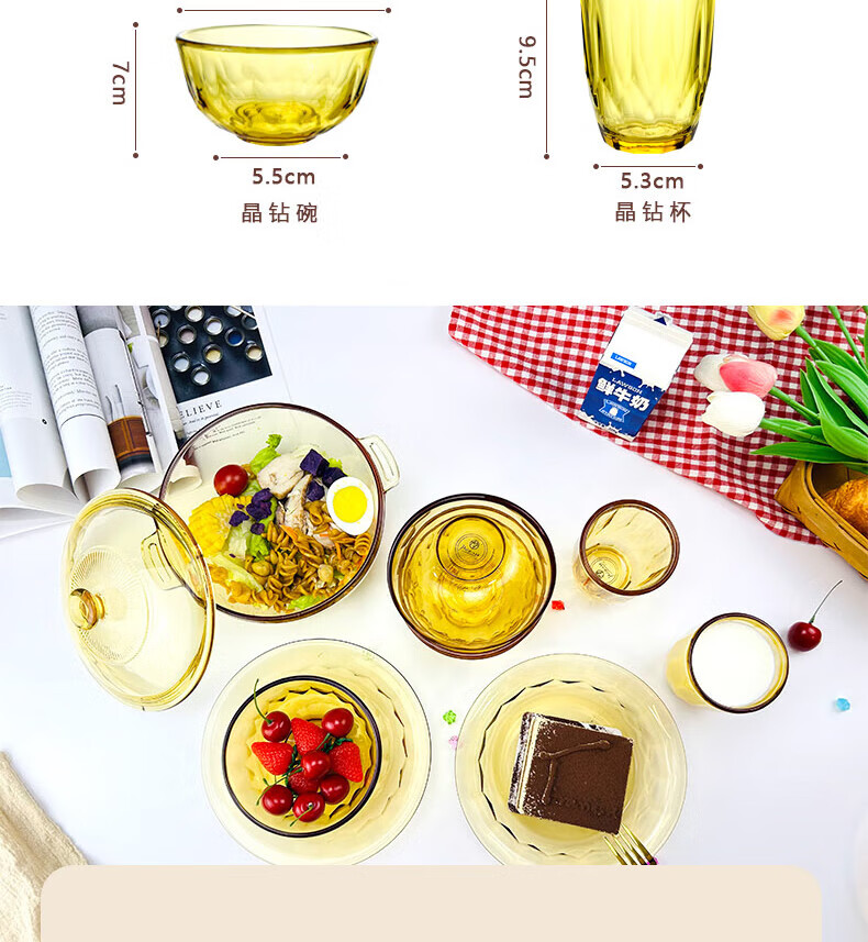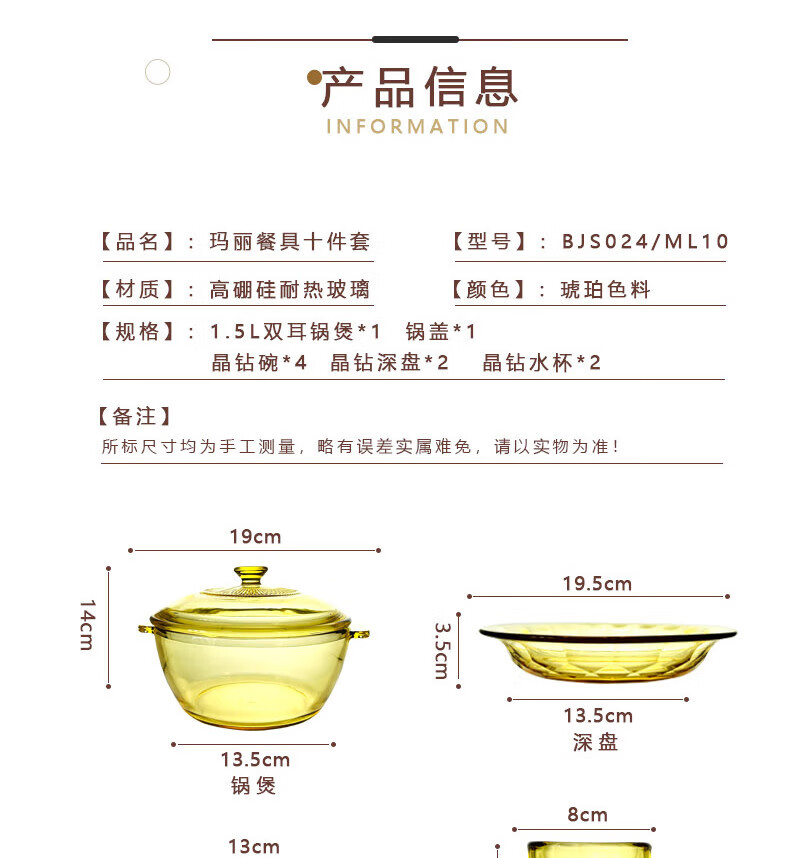 配置清单:1.5L双耳锅煲:18.5*8cm*1个 锅盖:直径19cm*高4cm*1个 晶钻5.5寸碗:13cm*7cm*4个 晶钻7.5寸深盘:19.5cm*3.5cm*2个 晶钻380ML水杯:8*9.5cm*2个