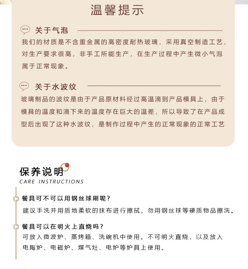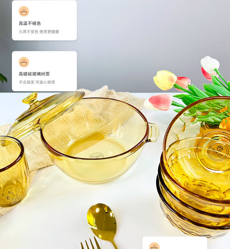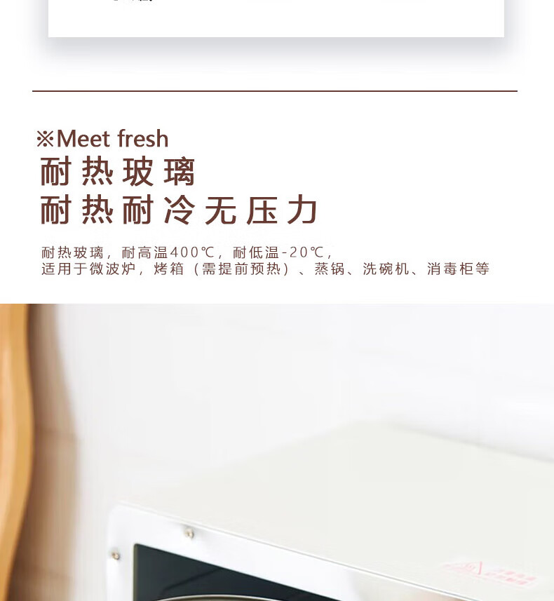 耐热玻璃,耐高温400℃,耐低温-20℃;适用范围:微波炉、烤箱、蒸锅、洗碗机、消毒柜均可使;无铅玻璃制品,材质更安全,不易与酸碱性食物发生化学