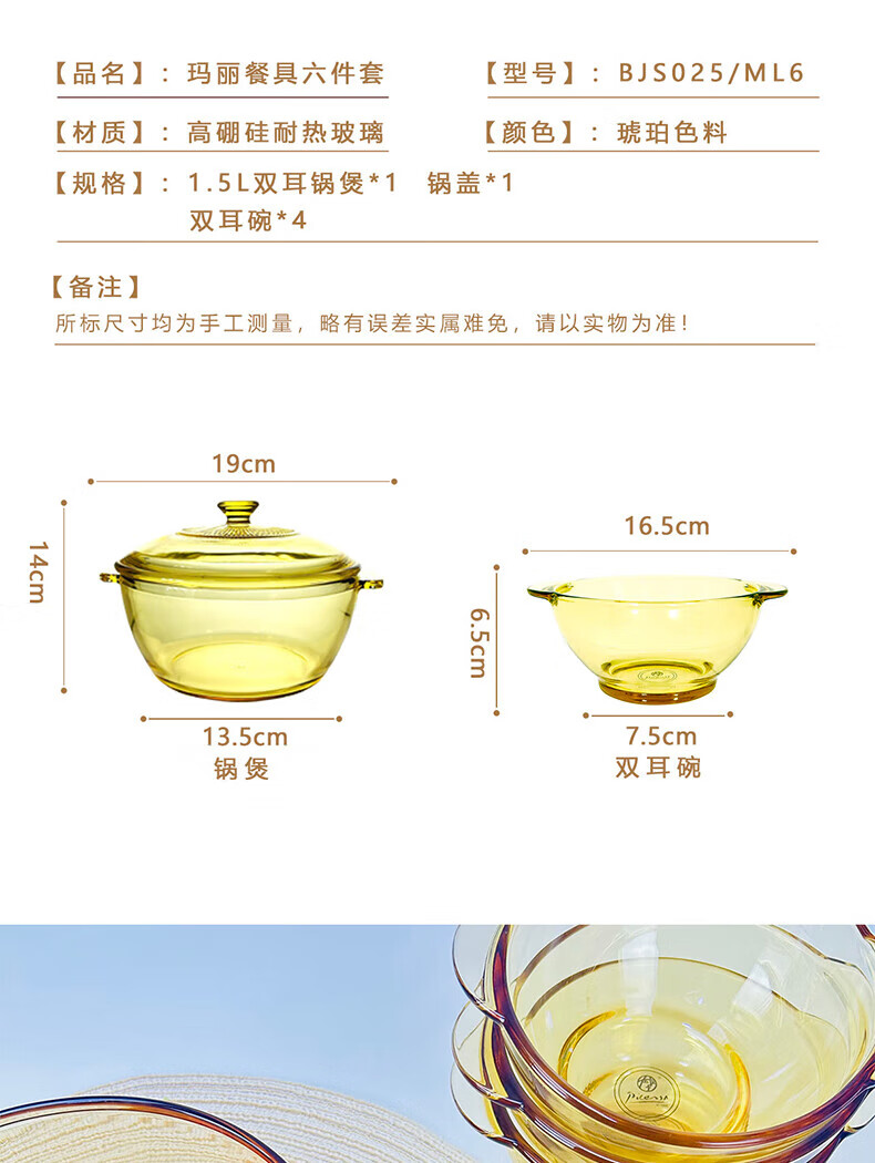 配置清单: 1.5L双耳锅煲:18.5*8cm*1个 锅盖:直径19cm*高4cm*1个 晶钻5.5寸碗:16.5cm*6.3cm*4个