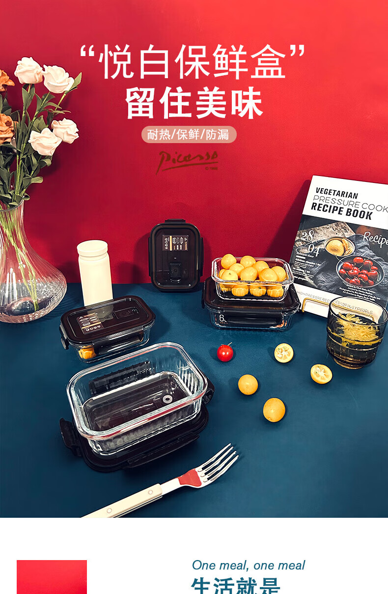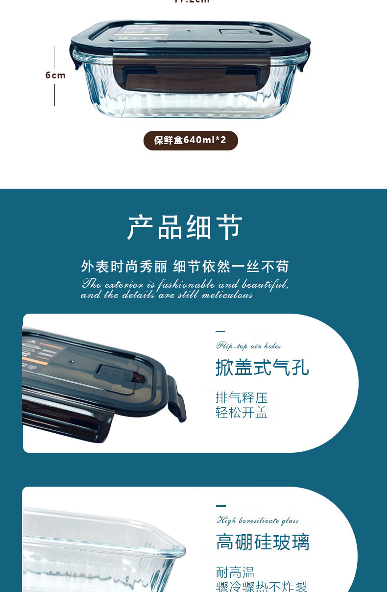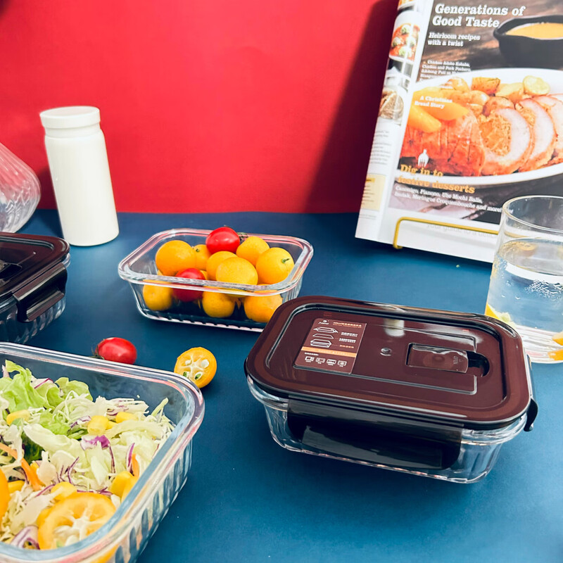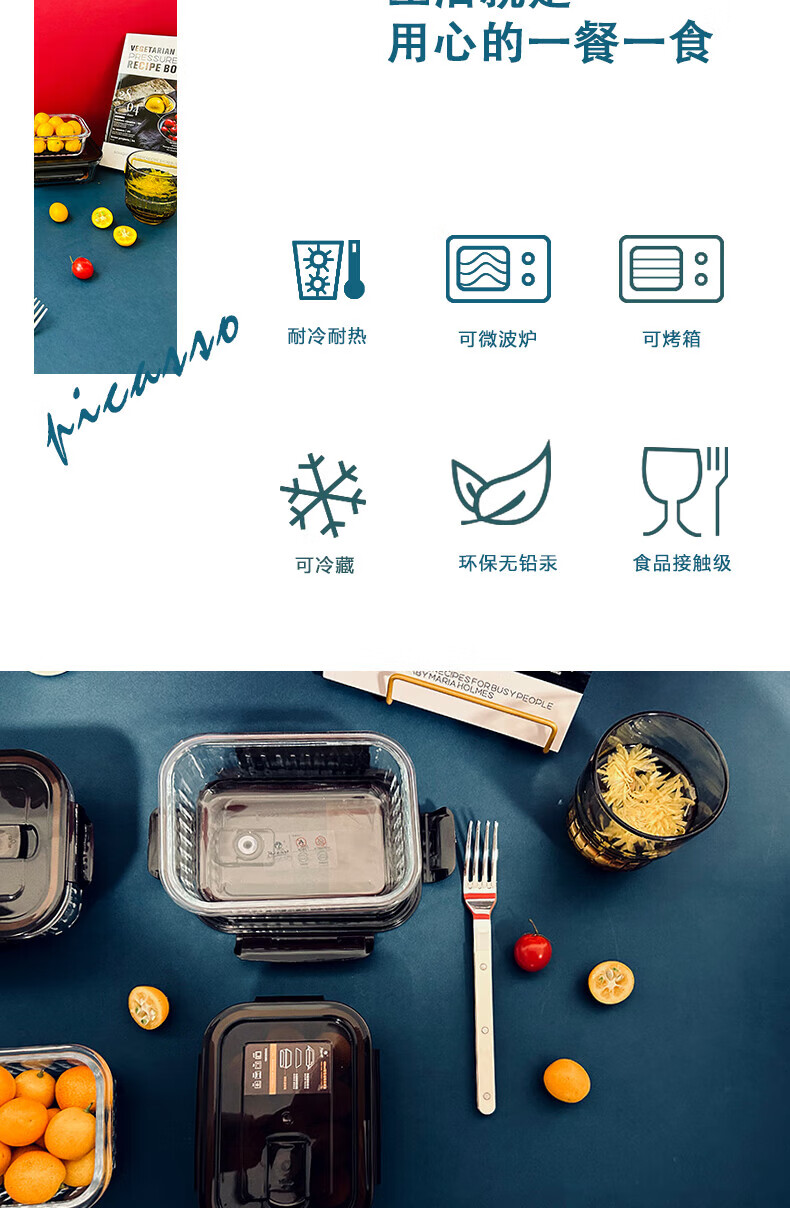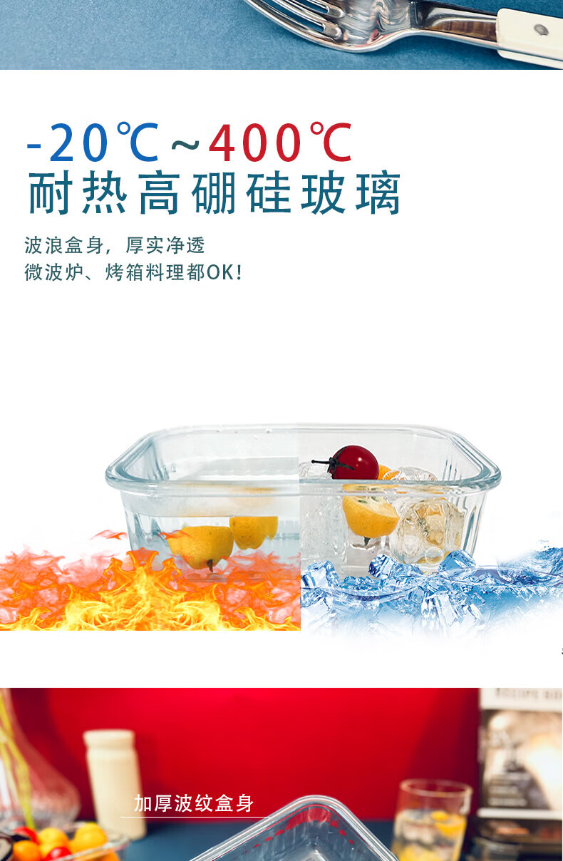高硼硅耐热玻璃,可零下20℃—耐高温400℃; ;内含双隔便当盒,保鲜大盒、辅食盒,一套满足家庭日用;盒盖采用食品级PP材质,留有放气阀,开启更方便