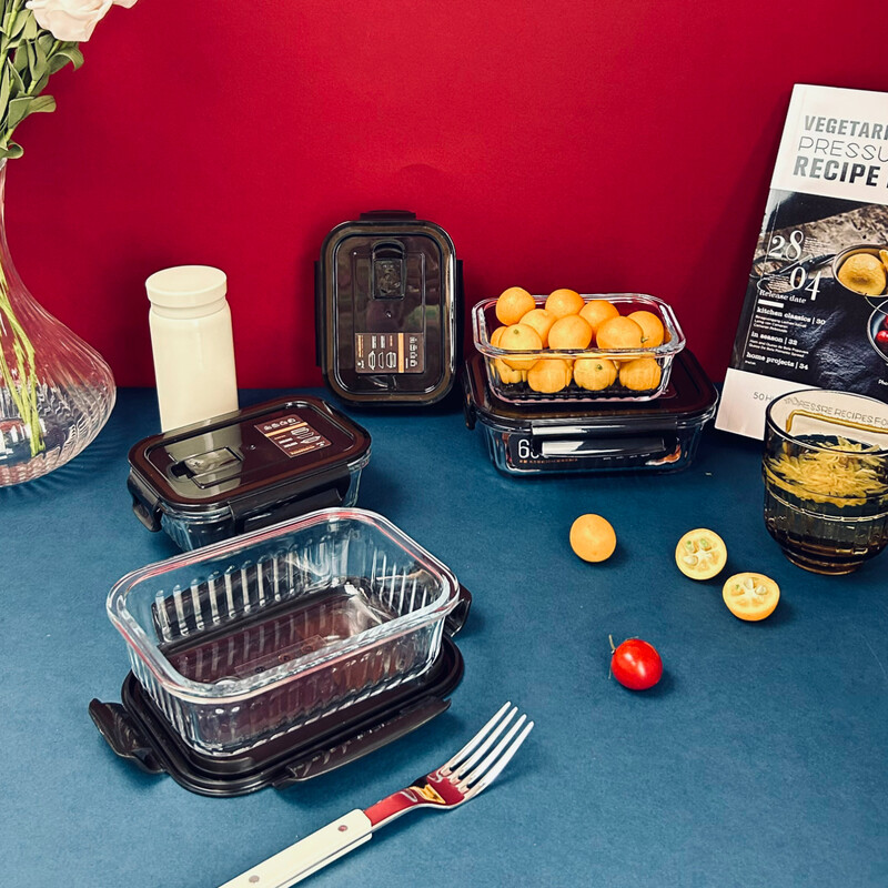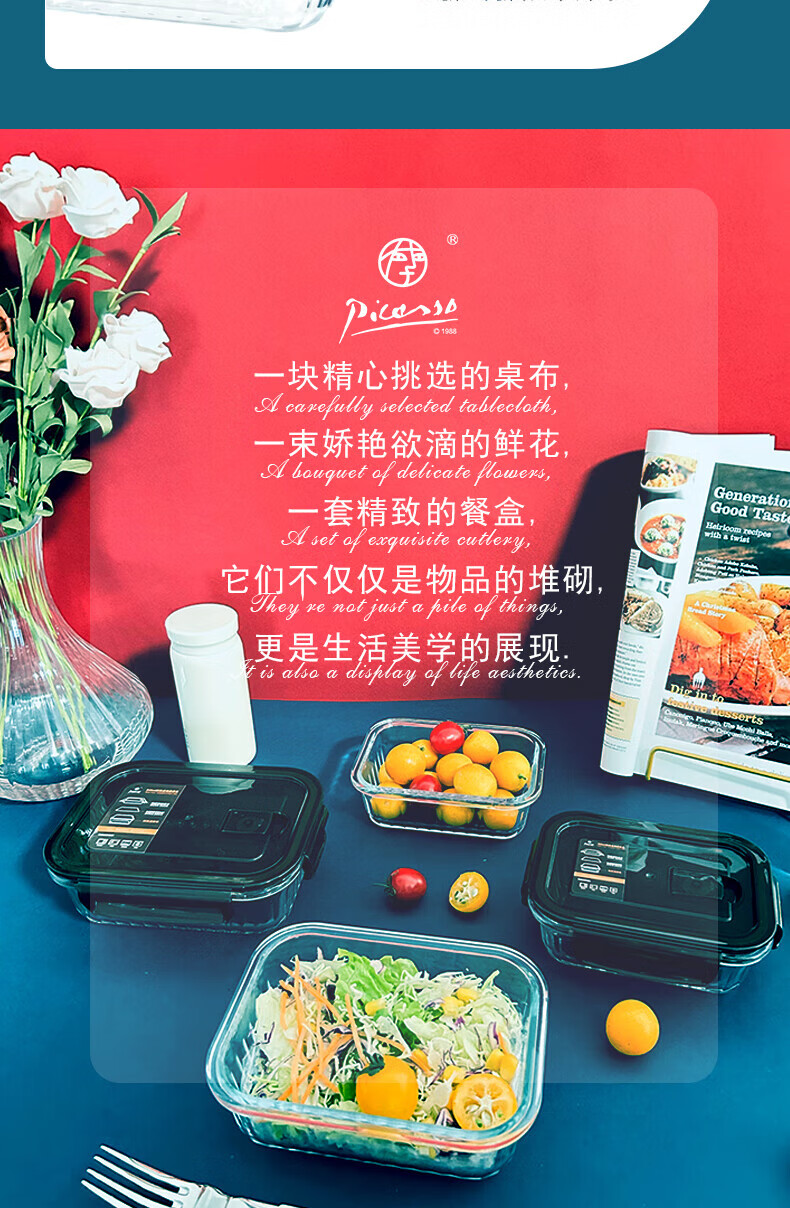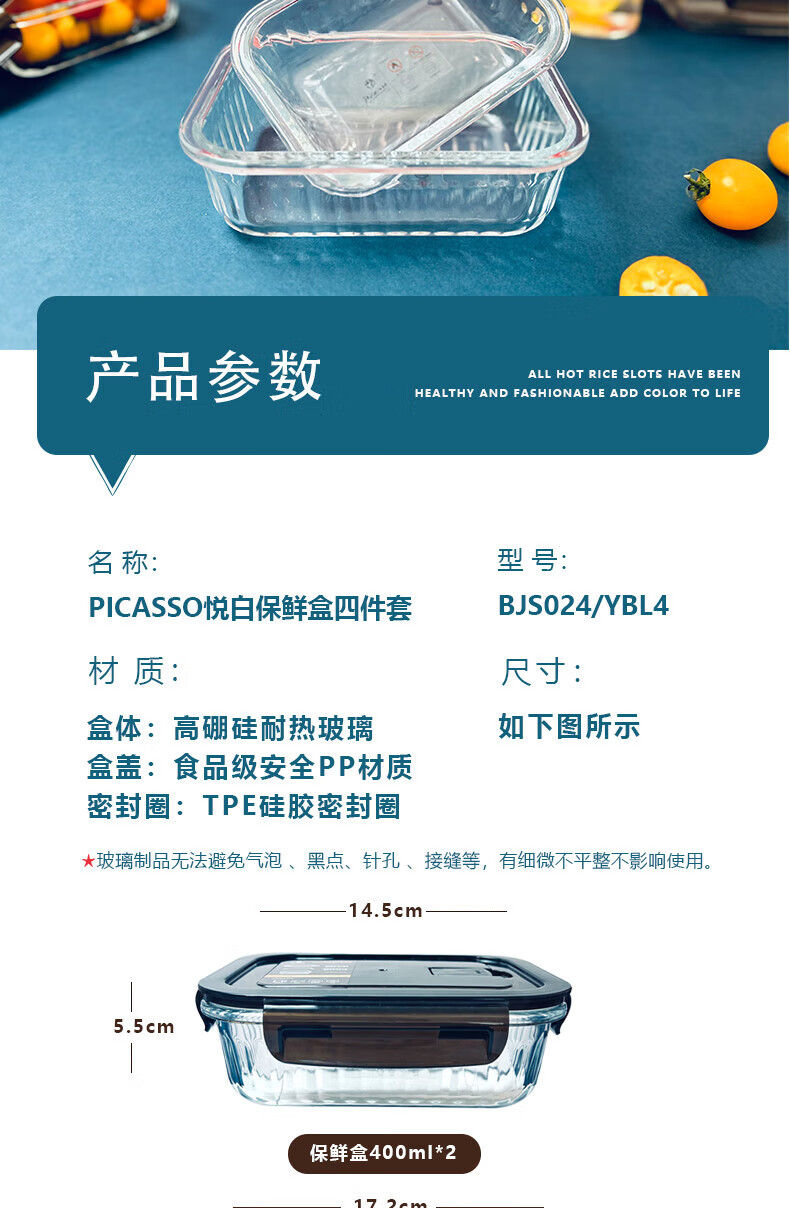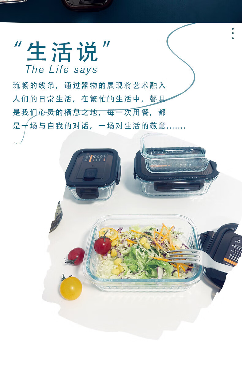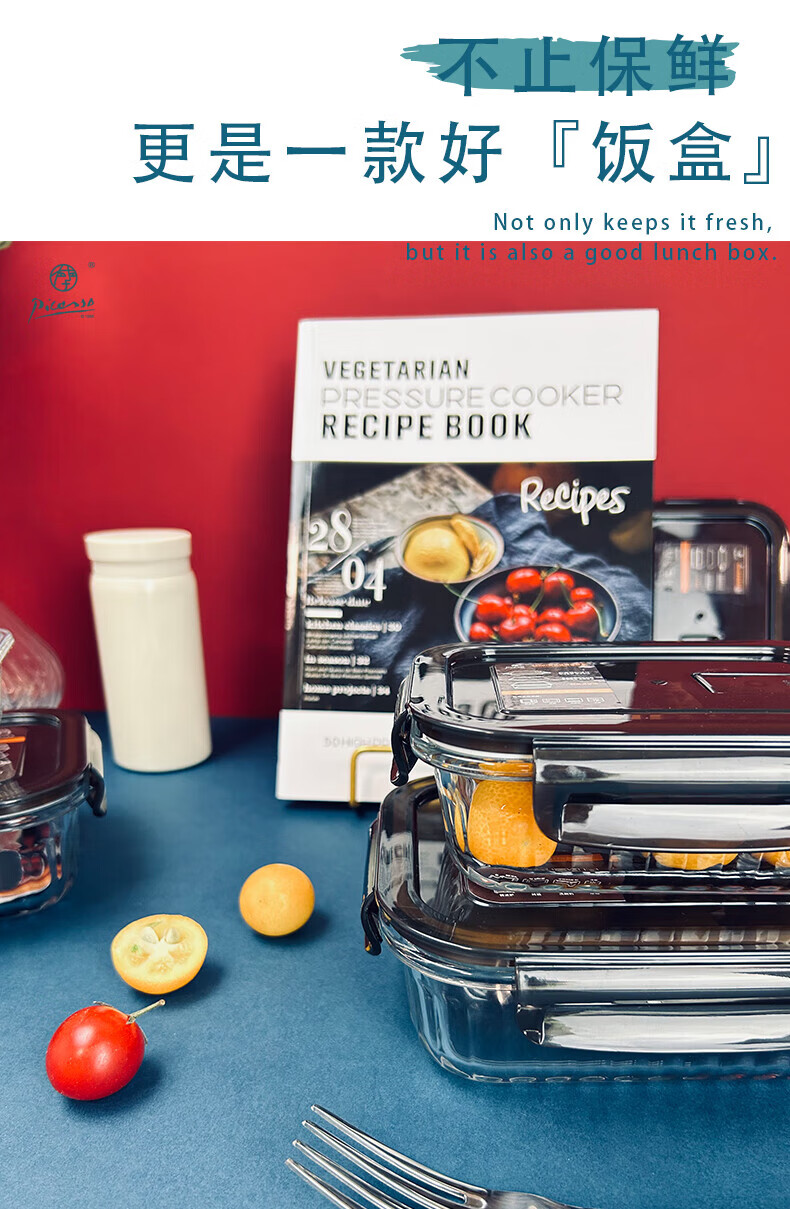 高硼硅耐热玻璃,可零下20℃—耐高温400℃; ;内含双隔便当盒,保鲜大盒、辅食盒,一套满足家庭日用;盒盖采用食品级PP材质,留有放气阀,开启更方便