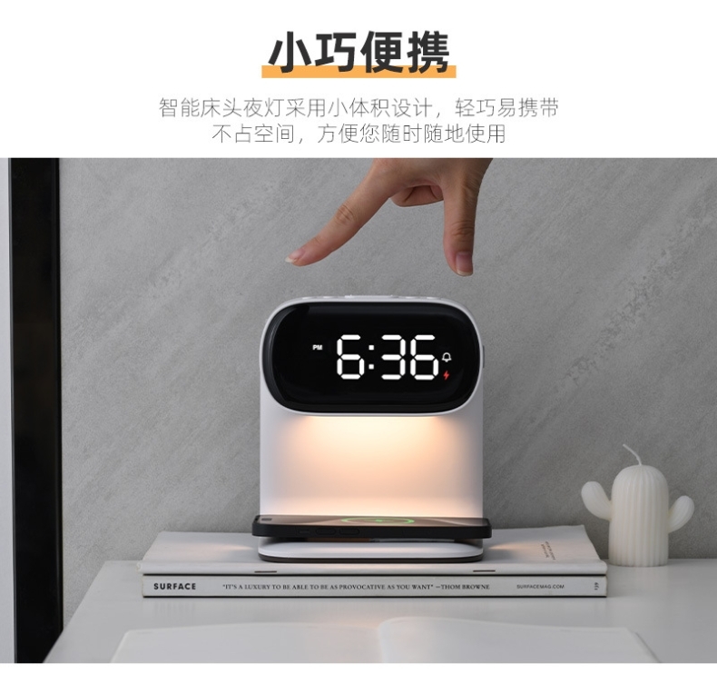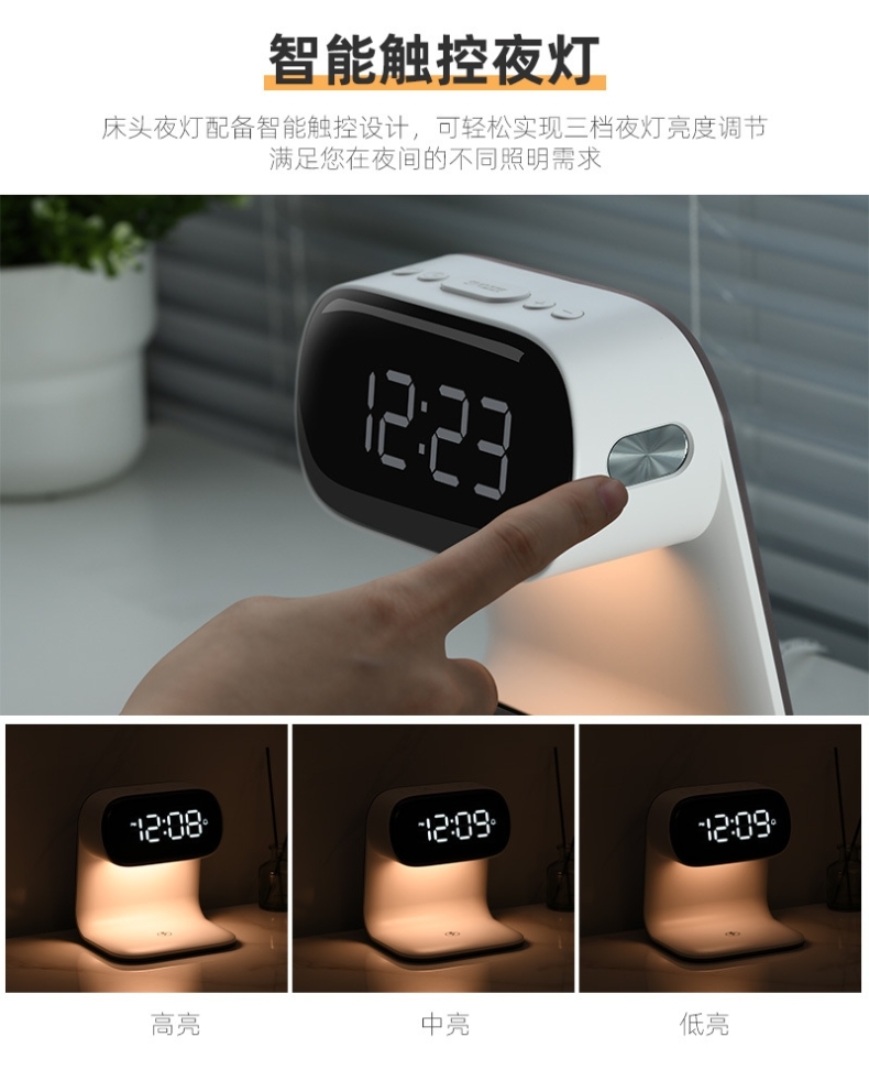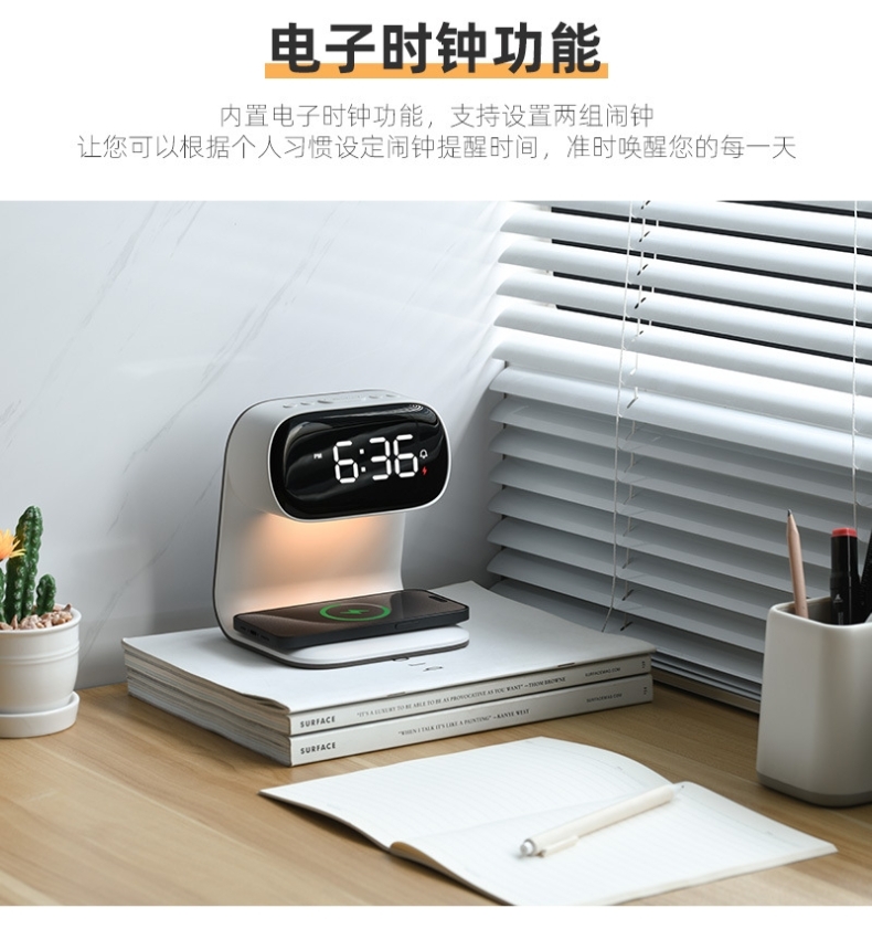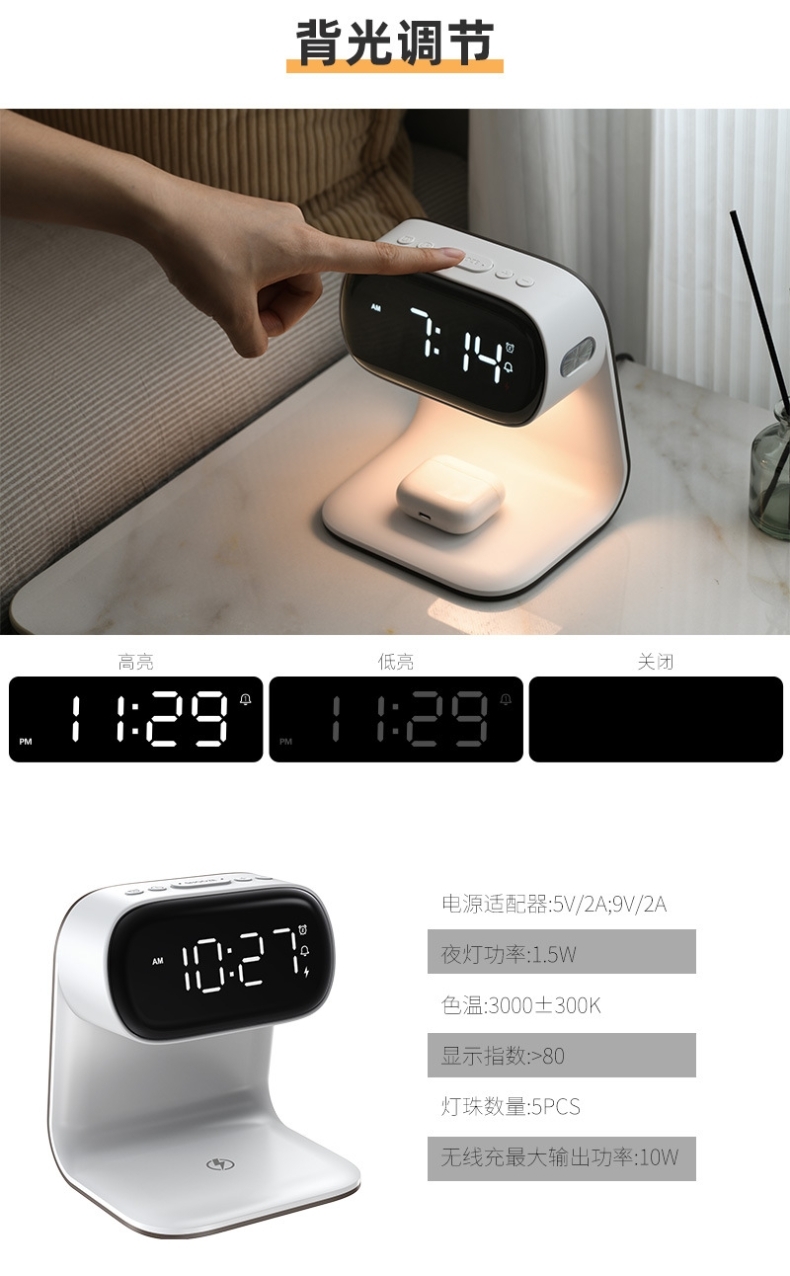 Qi协议无线充电;;高清LCD数显屏;;贪睡闹钟功能;;三档调光夜灯;;多功能一体设计。