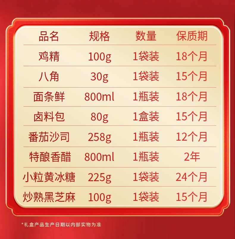 配置:加加 鸡精100g 加加 面条鲜800m 加加 番茄沙司258g 加加 特酿香醋800ml 塞翁福 小粒黄冰糖225g 塞翁福 八角30g 料千味卤料包 80g 塞翁福 炒熟黑芝麻100g