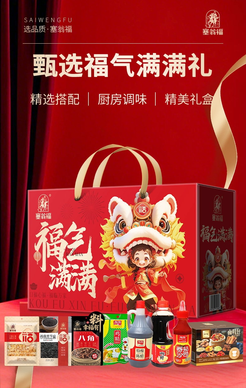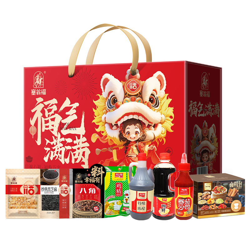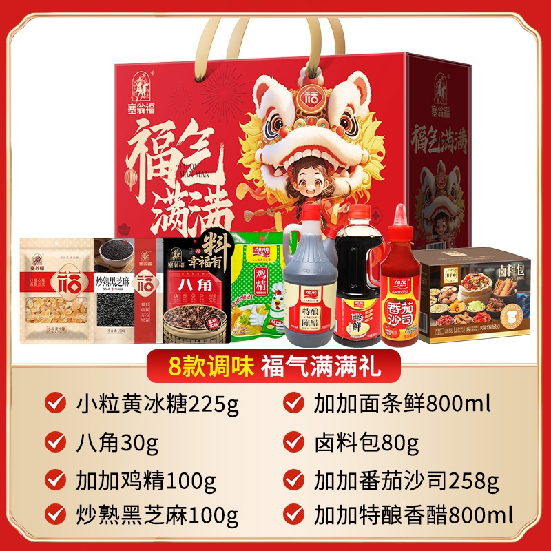 配置清单:加加 鸡精100g*1 加加 面条鲜800m*1 加加 番茄沙司258g*1 加加 特酿香醋800ml*1 塞翁福 小粒黄冰糖225g*1 塞翁福 八角30g*1 料千味卤料包 80g*1 塞翁福 炒熟黑芝麻100g*1