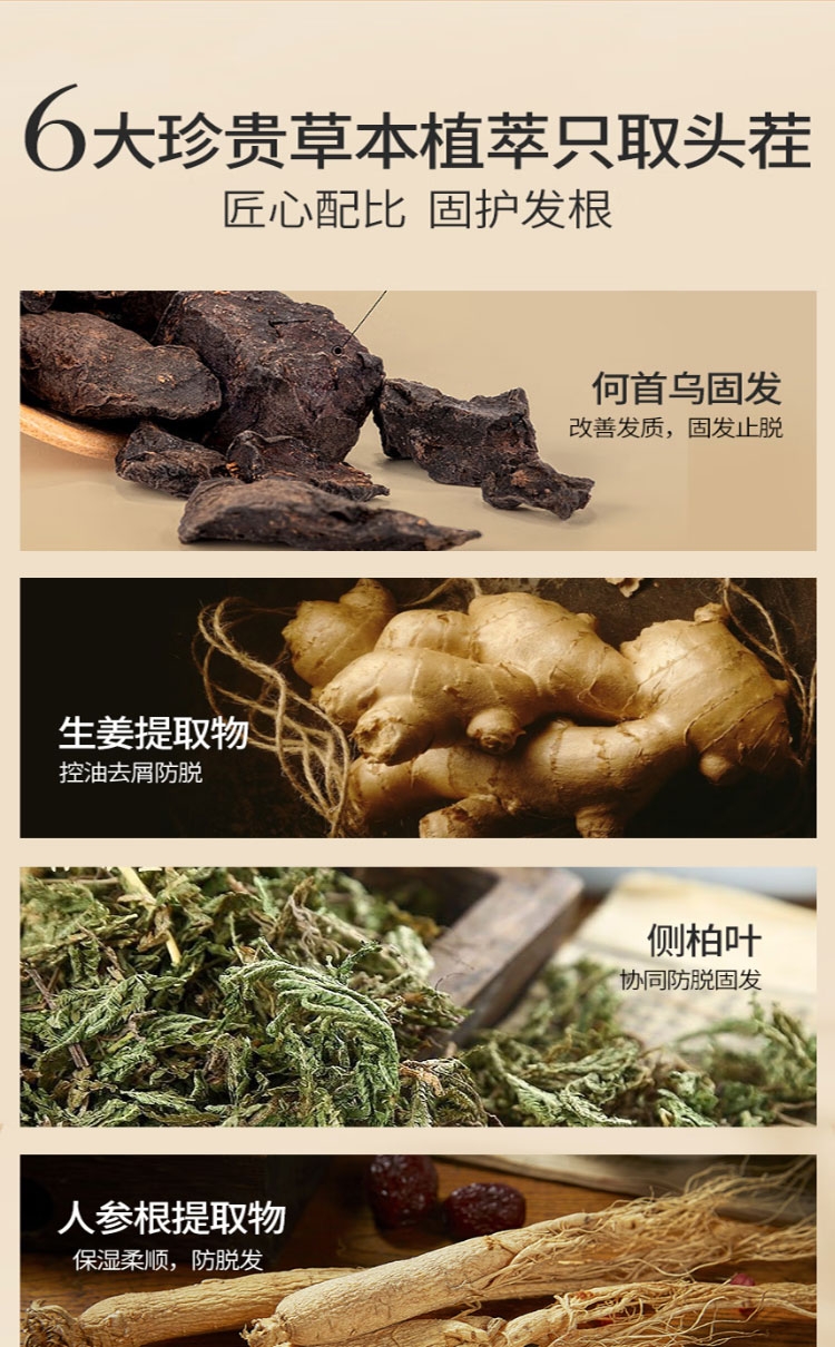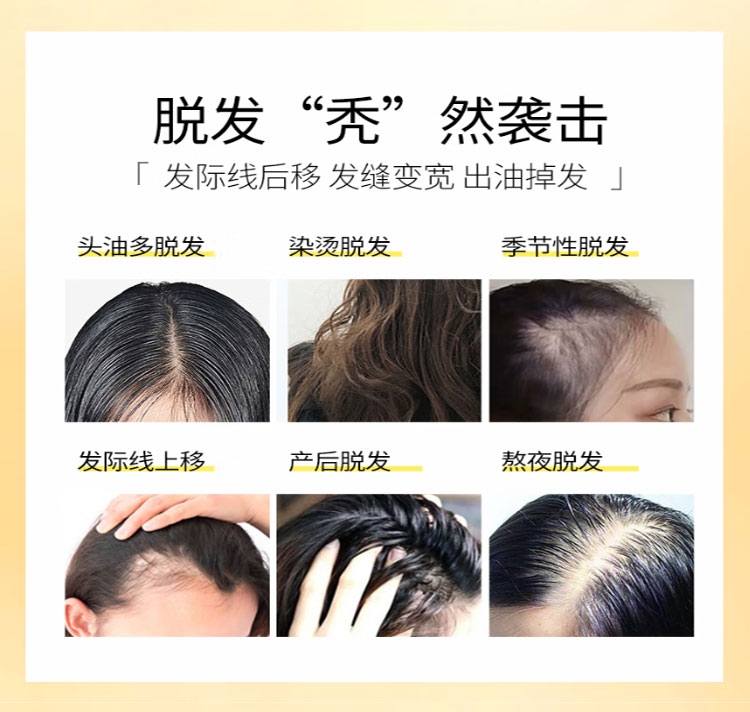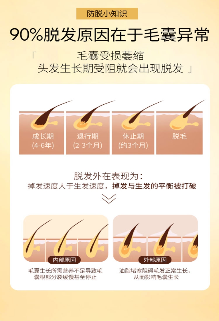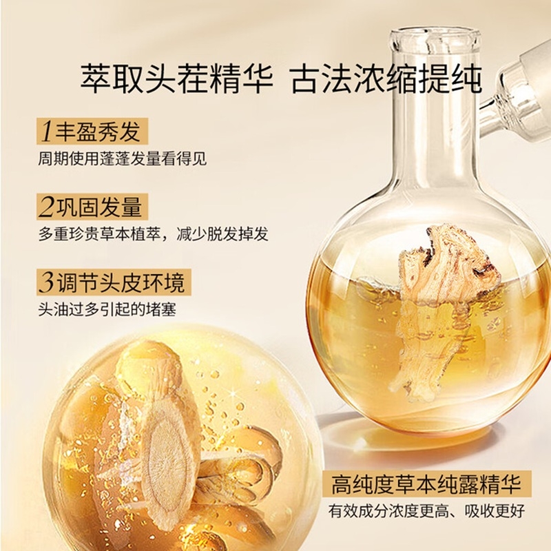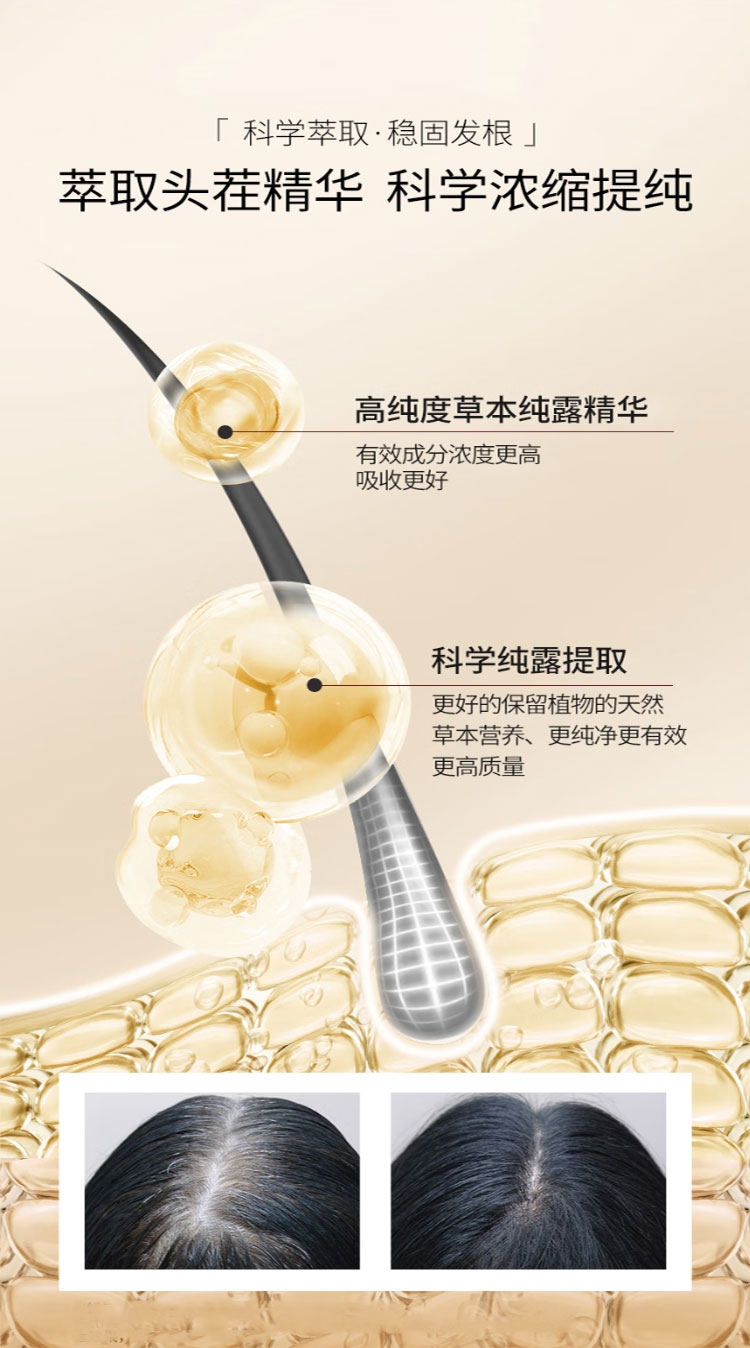 丰盈秀发,周期使用蓬蓬发量看得见;防脱育发,多重珍贵草本植萃,减少脱发掉发;调节头皮环境,头油过多引起的堵塞,轻松防脱