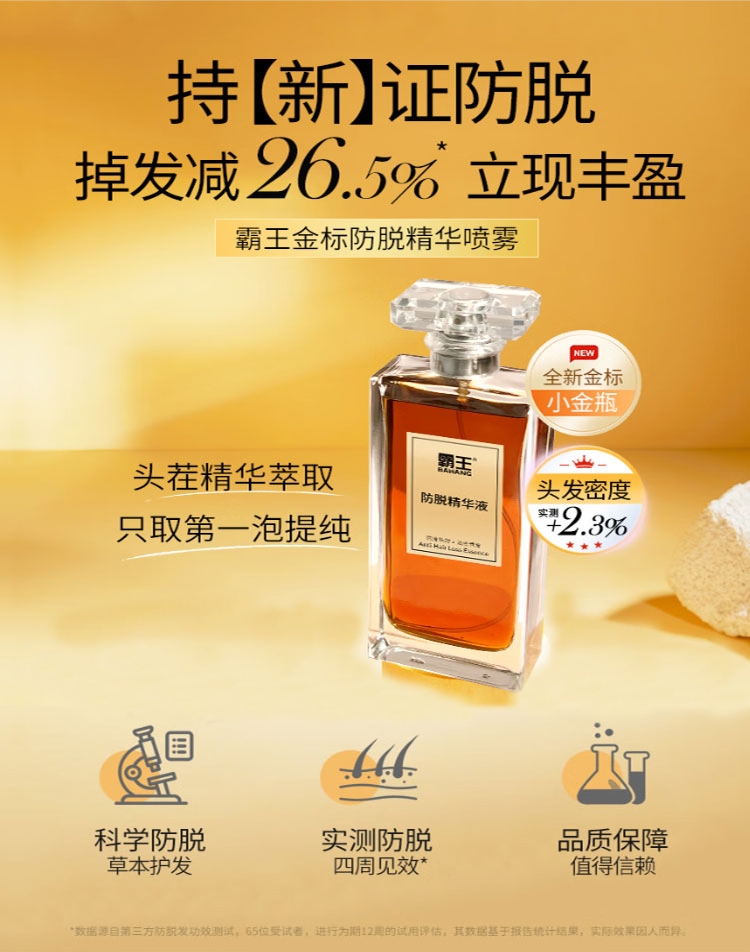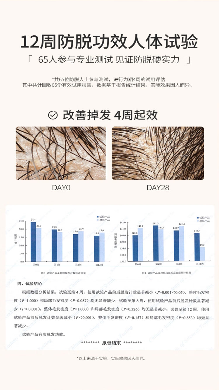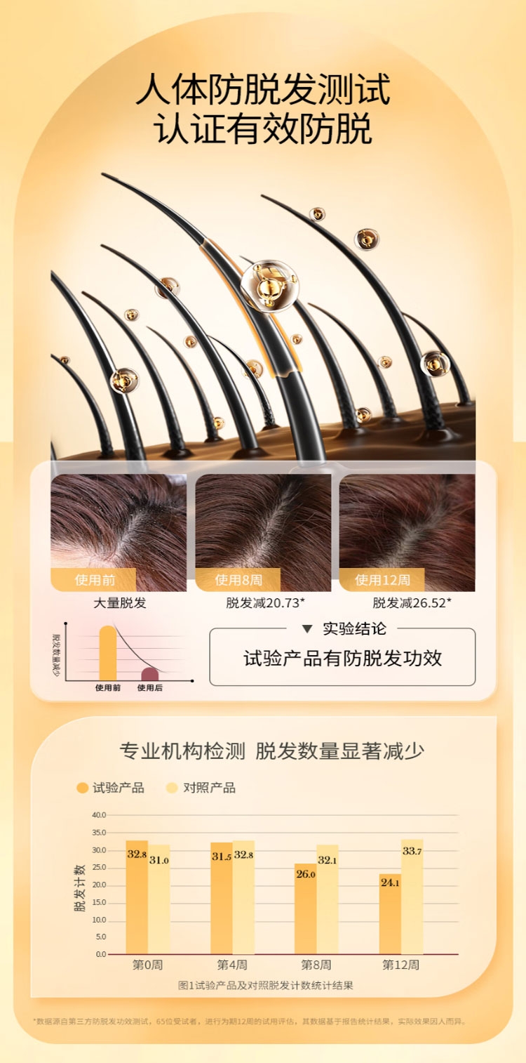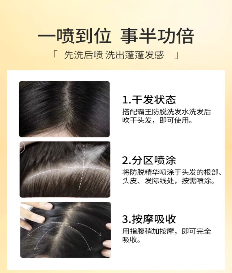 丰盈秀发,周期使用蓬蓬发量看得见;防脱育发,多重珍贵草本植萃,减少脱发掉发;调节头皮环境,头油过多引起的堵塞,轻松防脱