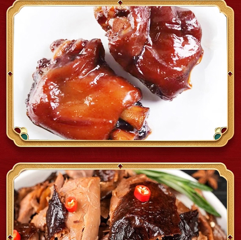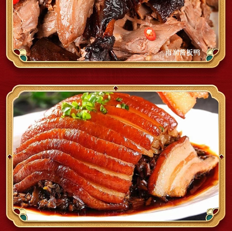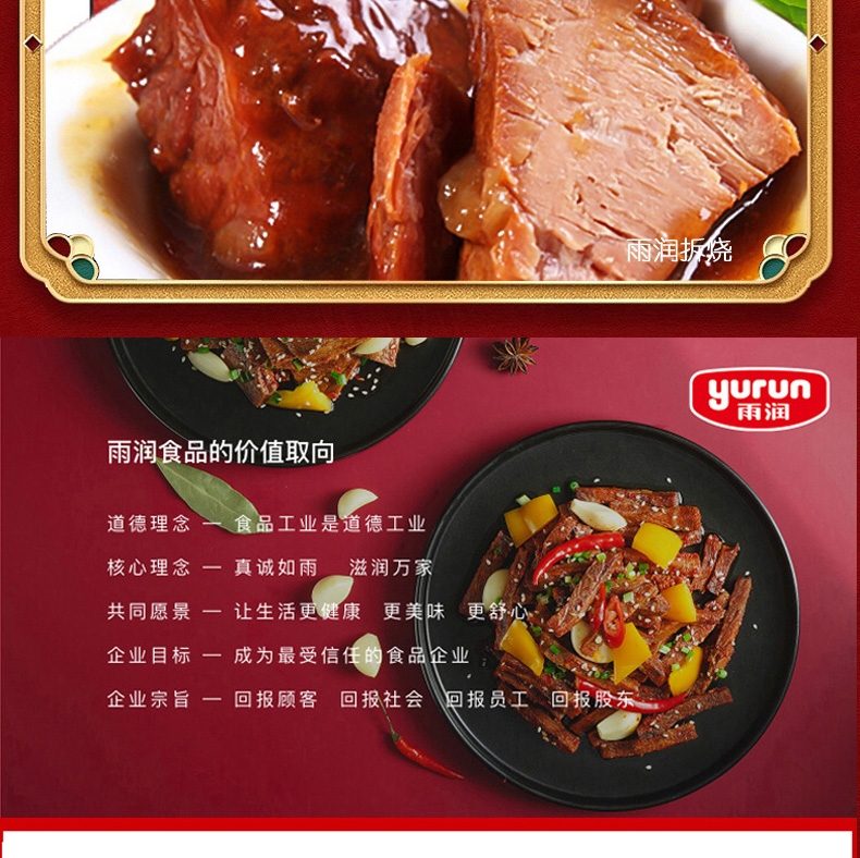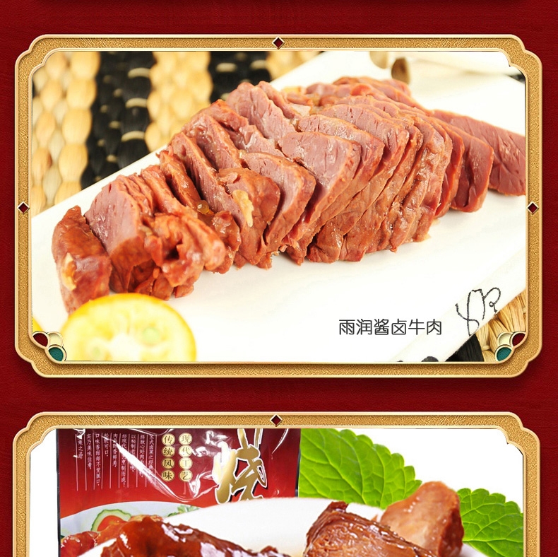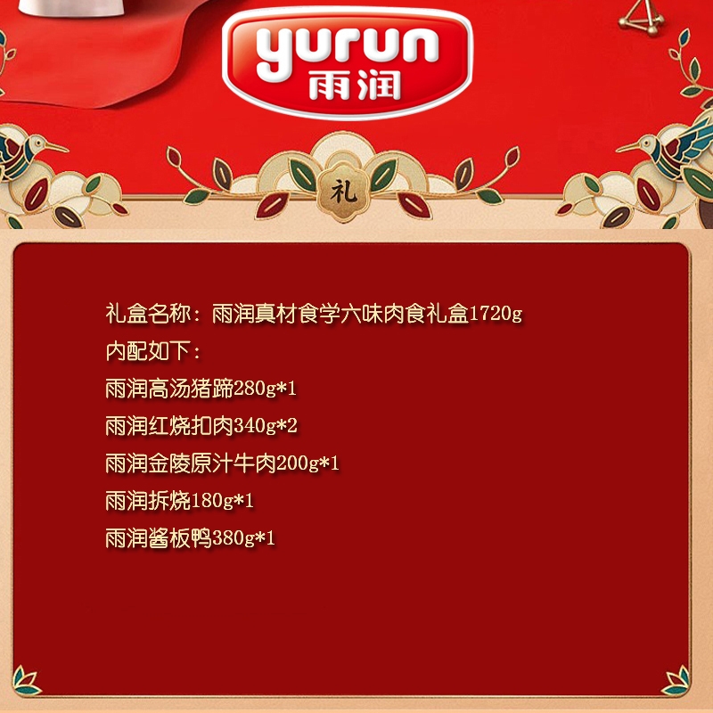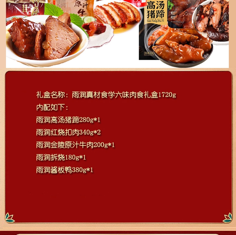 配置:雨润高汤猪蹄280g*1 雨润红烧扣肉340g*2 雨润金陵原汁牛肉200g*1 雨润拆烧180g*1 雨润酱板鸭380g*1