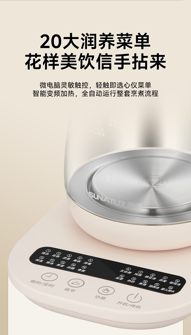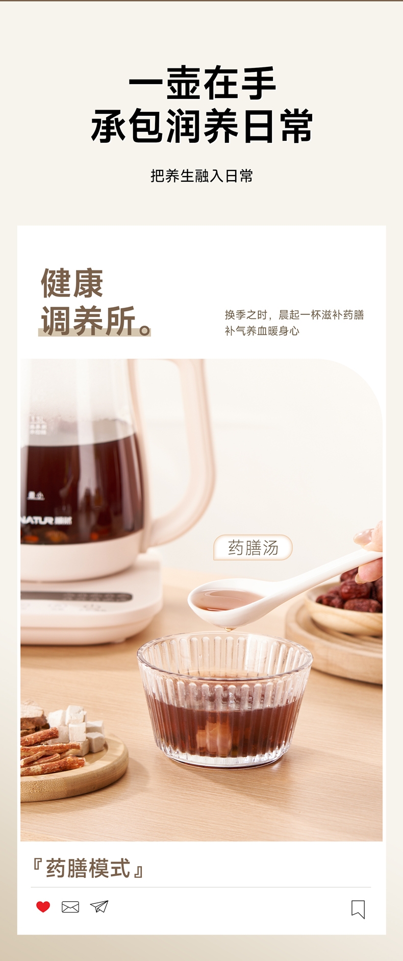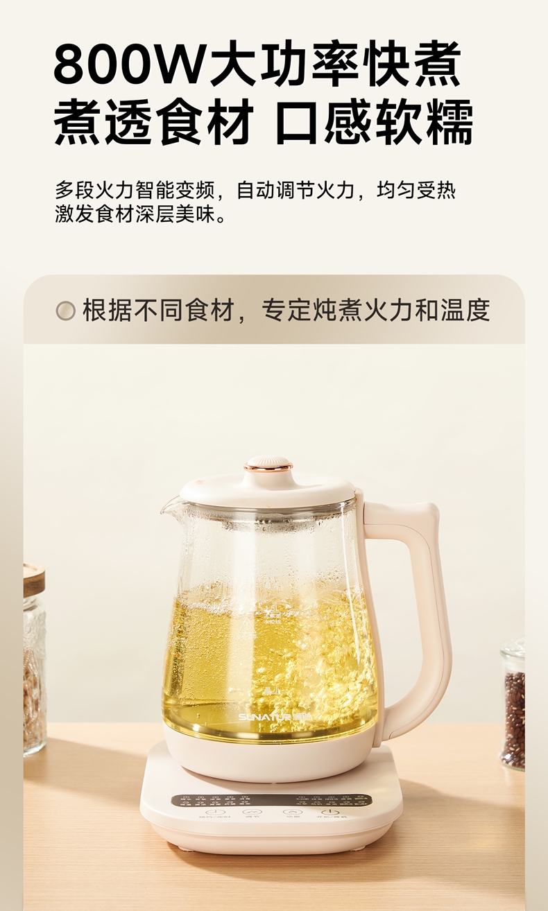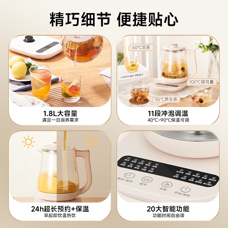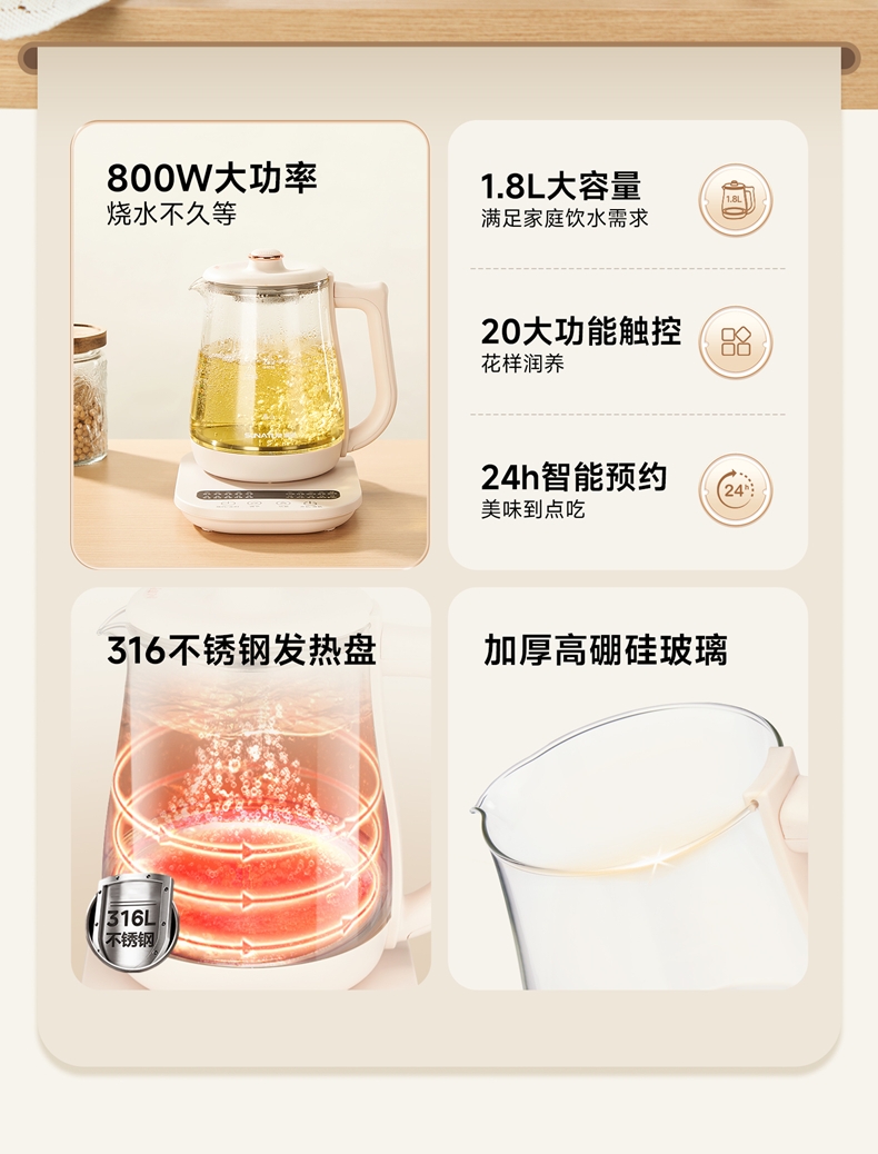 800W大功率快煮,精煮慢炖润身心 60s提壶记忆;20大润养菜单,1.8L畅饮大容量 11档温度调节;24H长效预约,睡前预约,睡醒即享