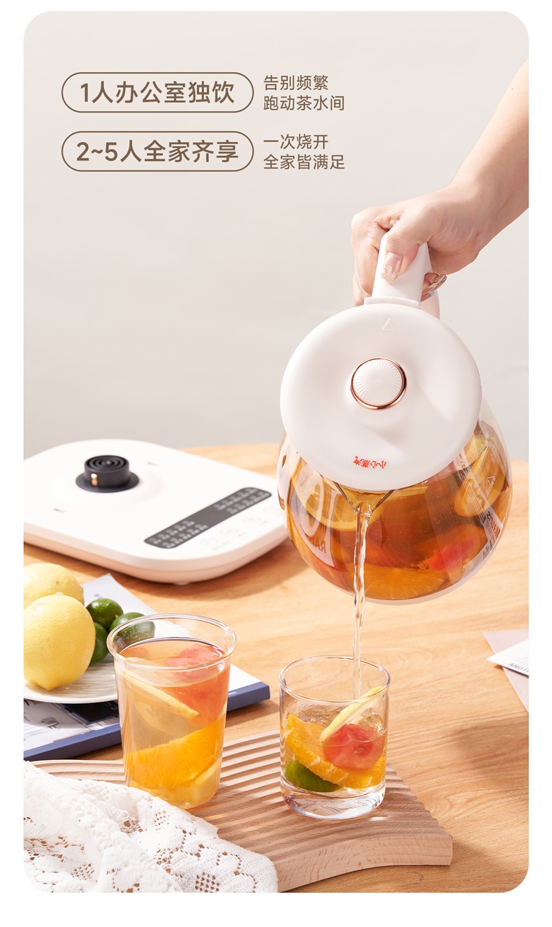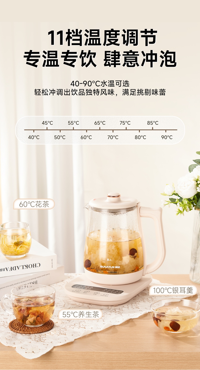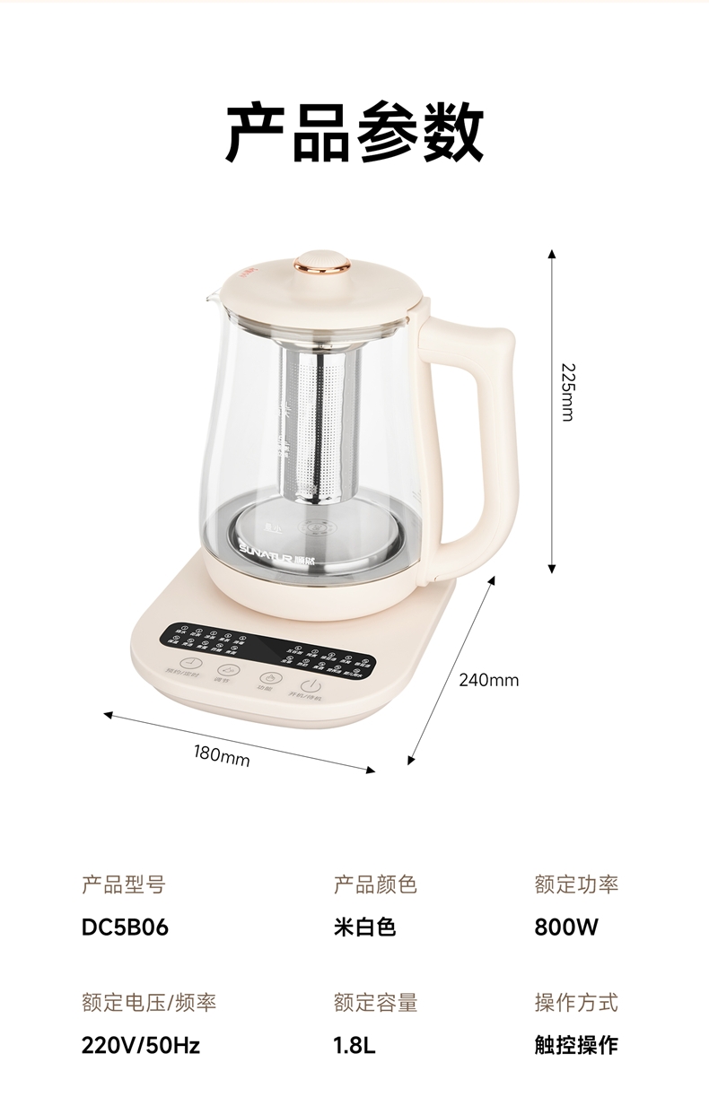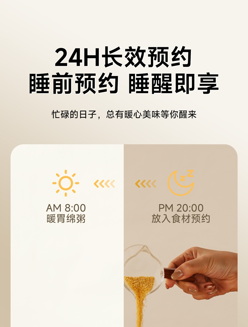 800W大功率快煮,精煮慢炖润身心 60s提壶记忆;20大润养菜单,1.8L畅饮大容量 11档温度调节;24H长效预约,睡前预约,睡醒即享