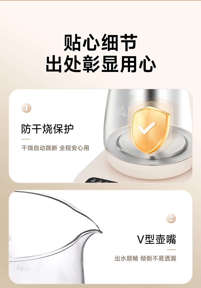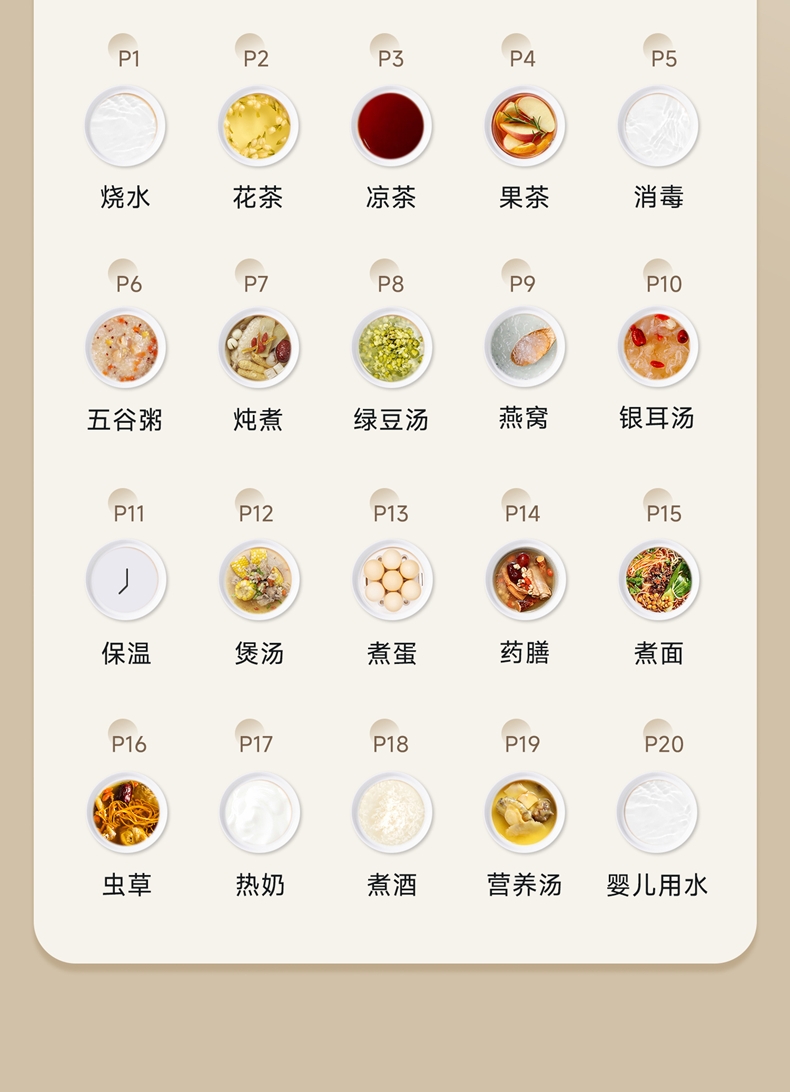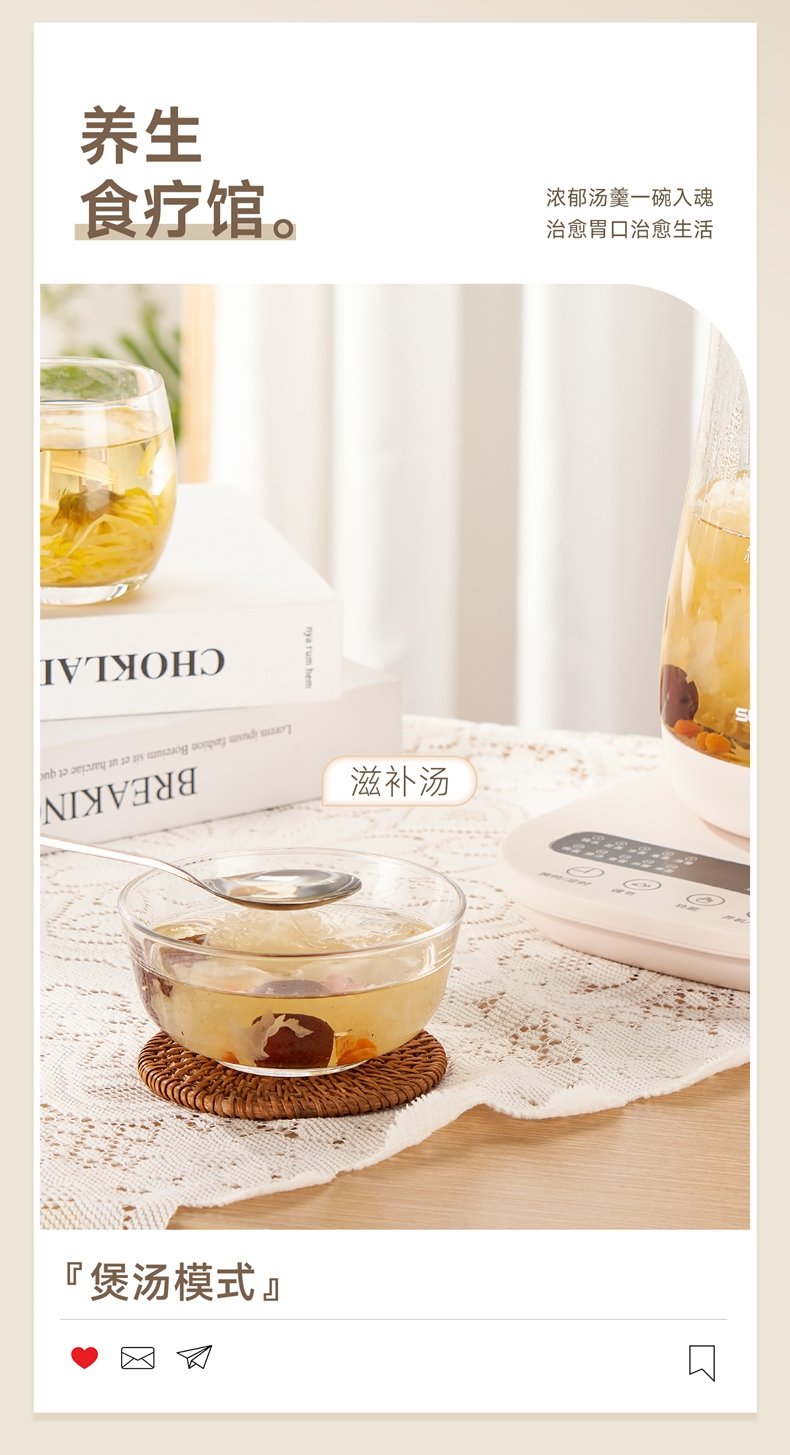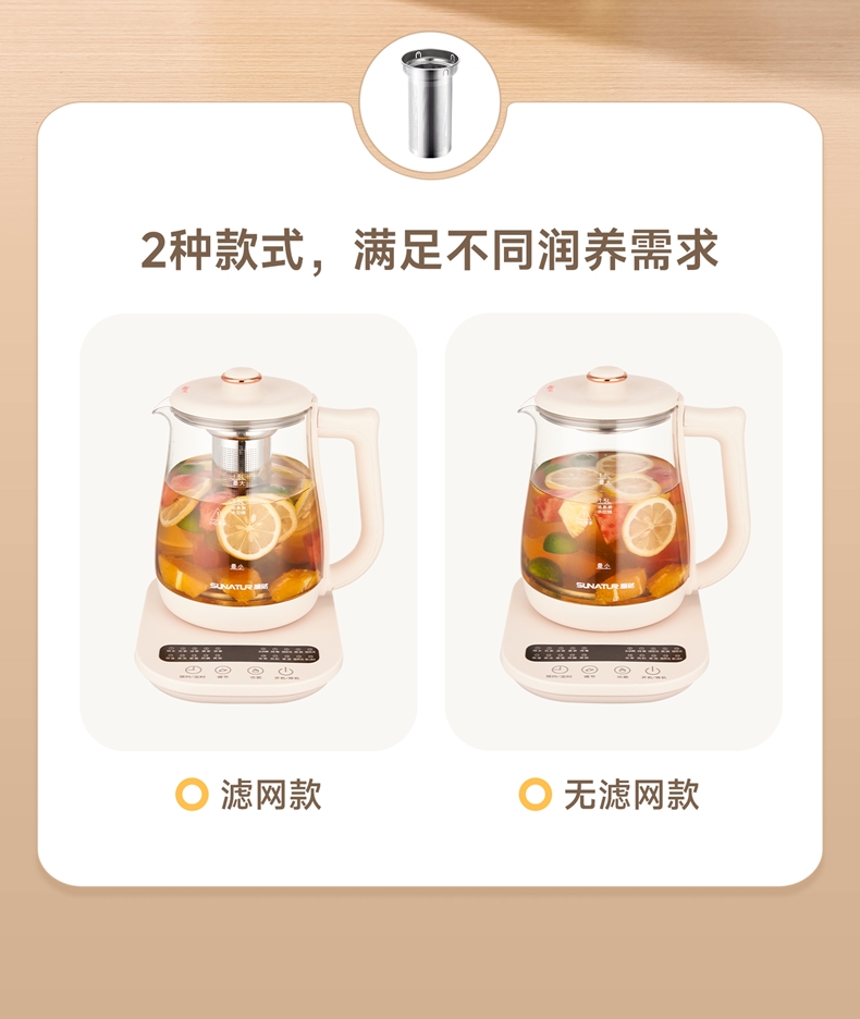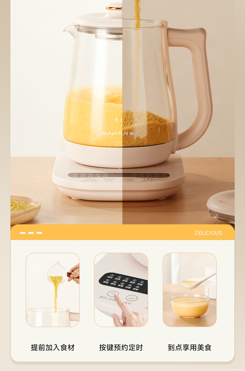 800W大功率快煮,精煮慢炖润身心 60s提壶记忆;20大润养菜单,1.8L畅饮大容量 11档温度调节;24H长效预约,睡前预约,睡醒即享