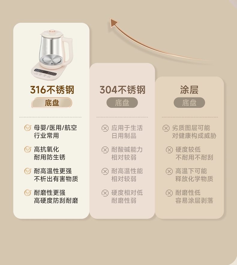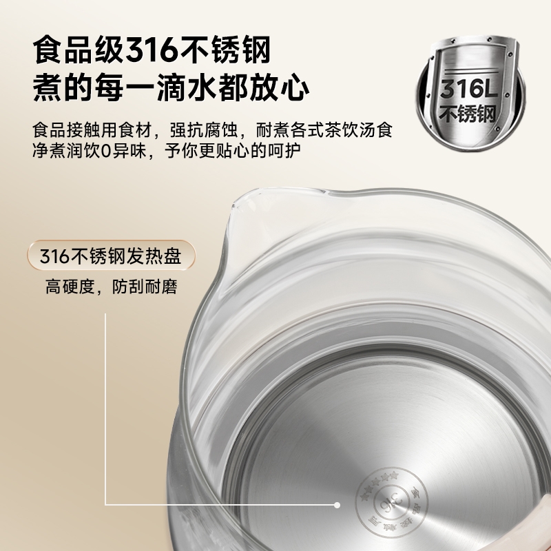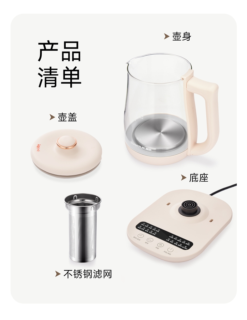 配置清单:800W大功率快煮,精煮慢炖润身心 升级316不锈钢底盘,加厚高硼硅玻璃 20大润养菜单,1.8L畅饮大容量, 11档温度调节,60s提壶记忆 24H长效预约,睡前预约,睡醒即享