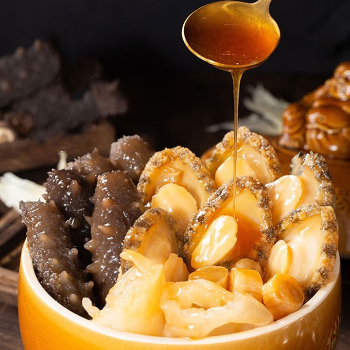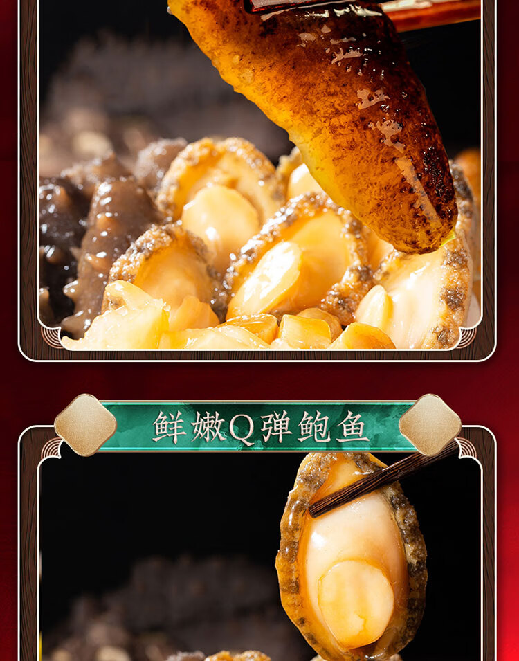 配置清单:海参、鲍鱼、鱼肚、牛蹄筋、扇贝柱、龙虾味球、杏鲍菇、高汤