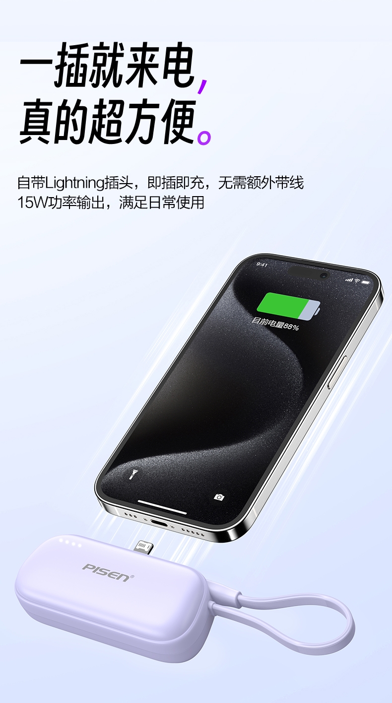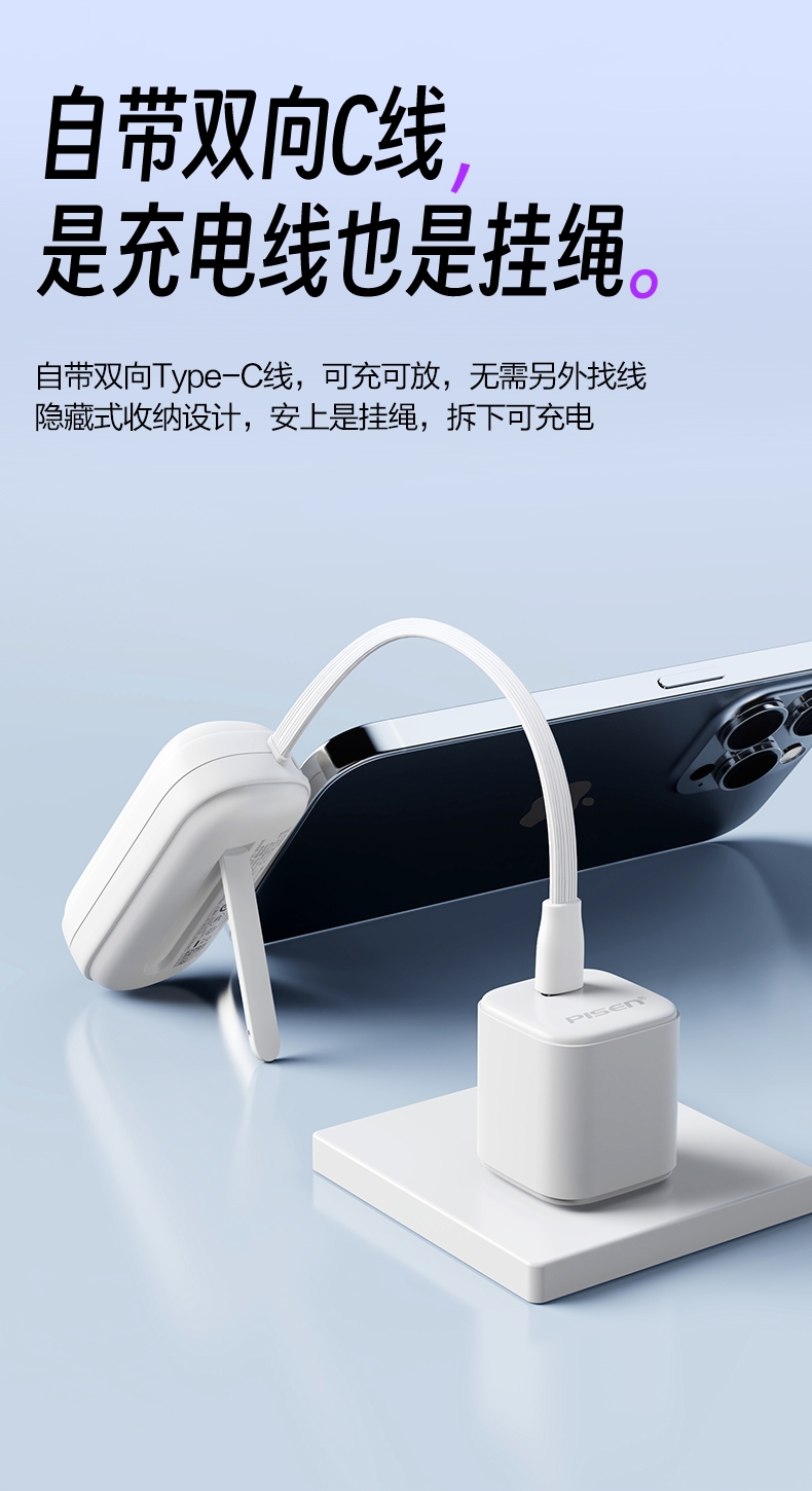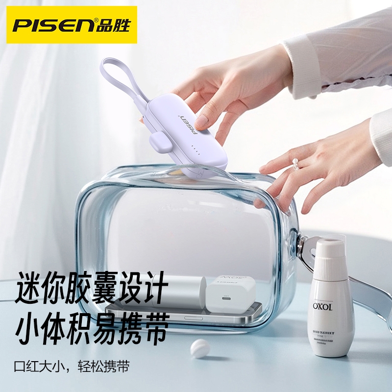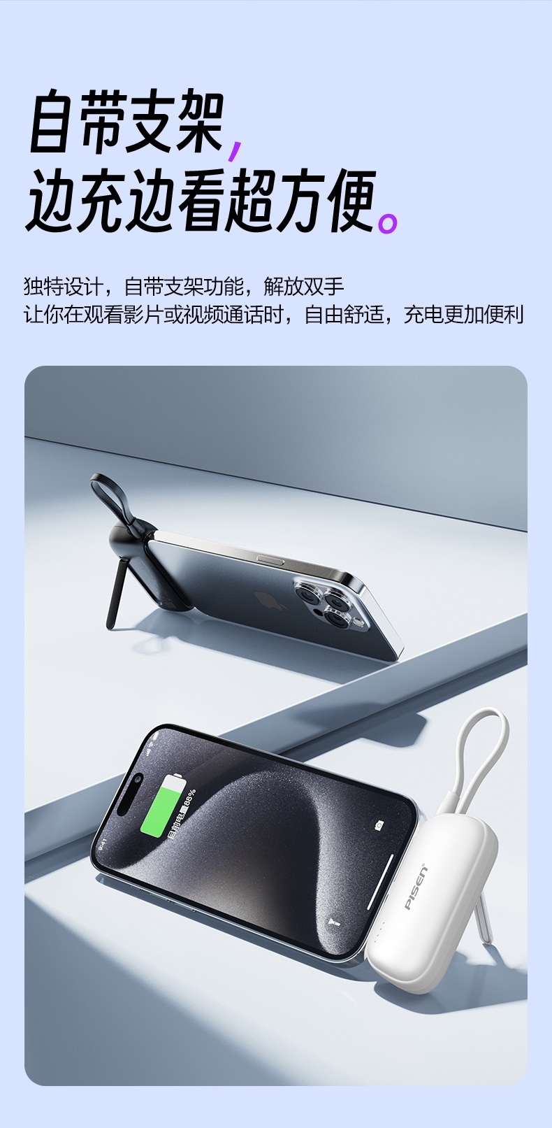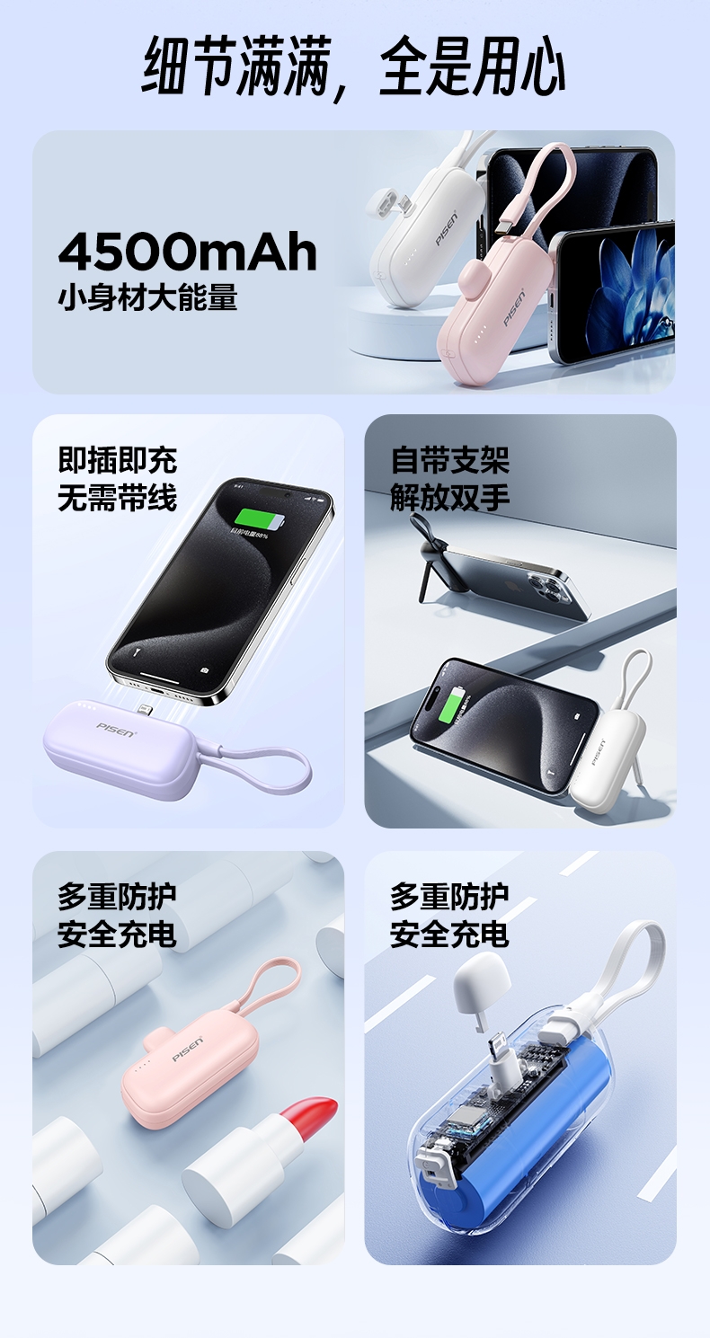 便携式胶囊外形设计,超小超便携,轻量随身;即插即充,支持两台设备同时充电;支持LED灯显,实时显示剩余电量,随心掌控;收纳式支架设计,畅享解放双手,充电刷剧两不误;4500mAh聚合物电芯,挂绳式线材,便捷实用