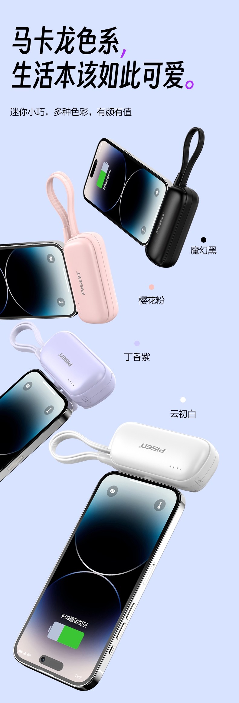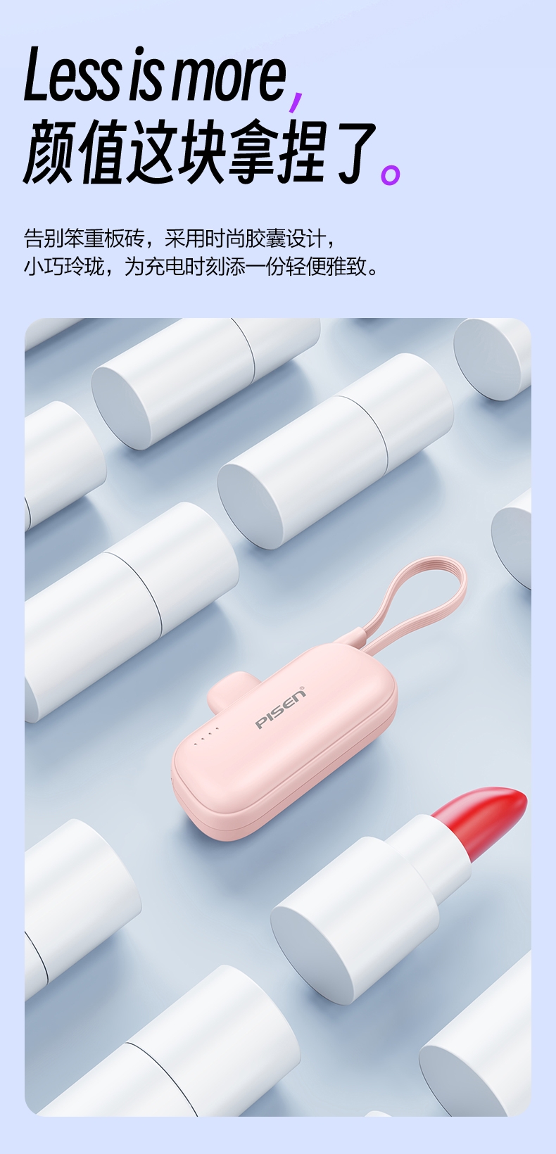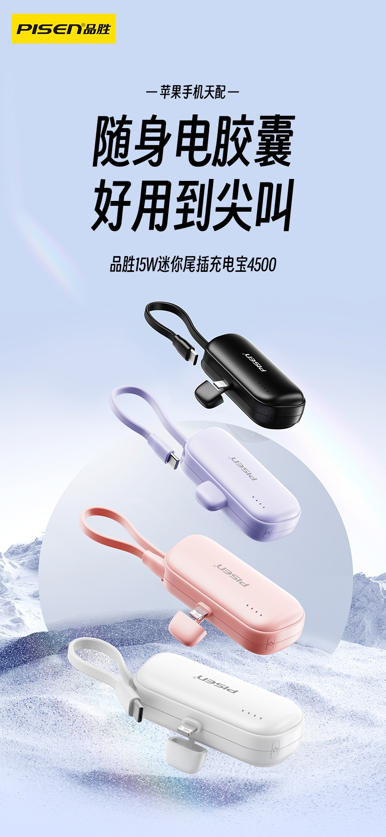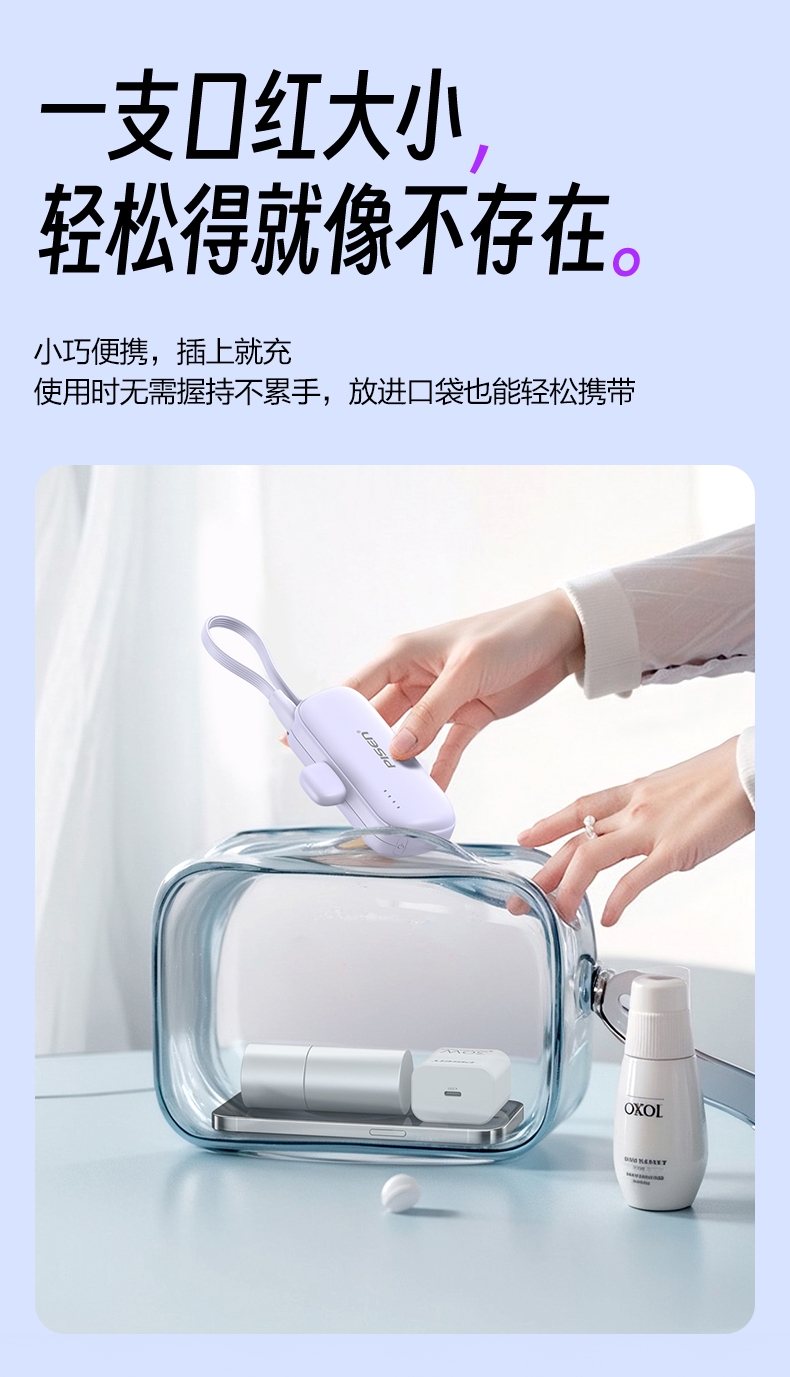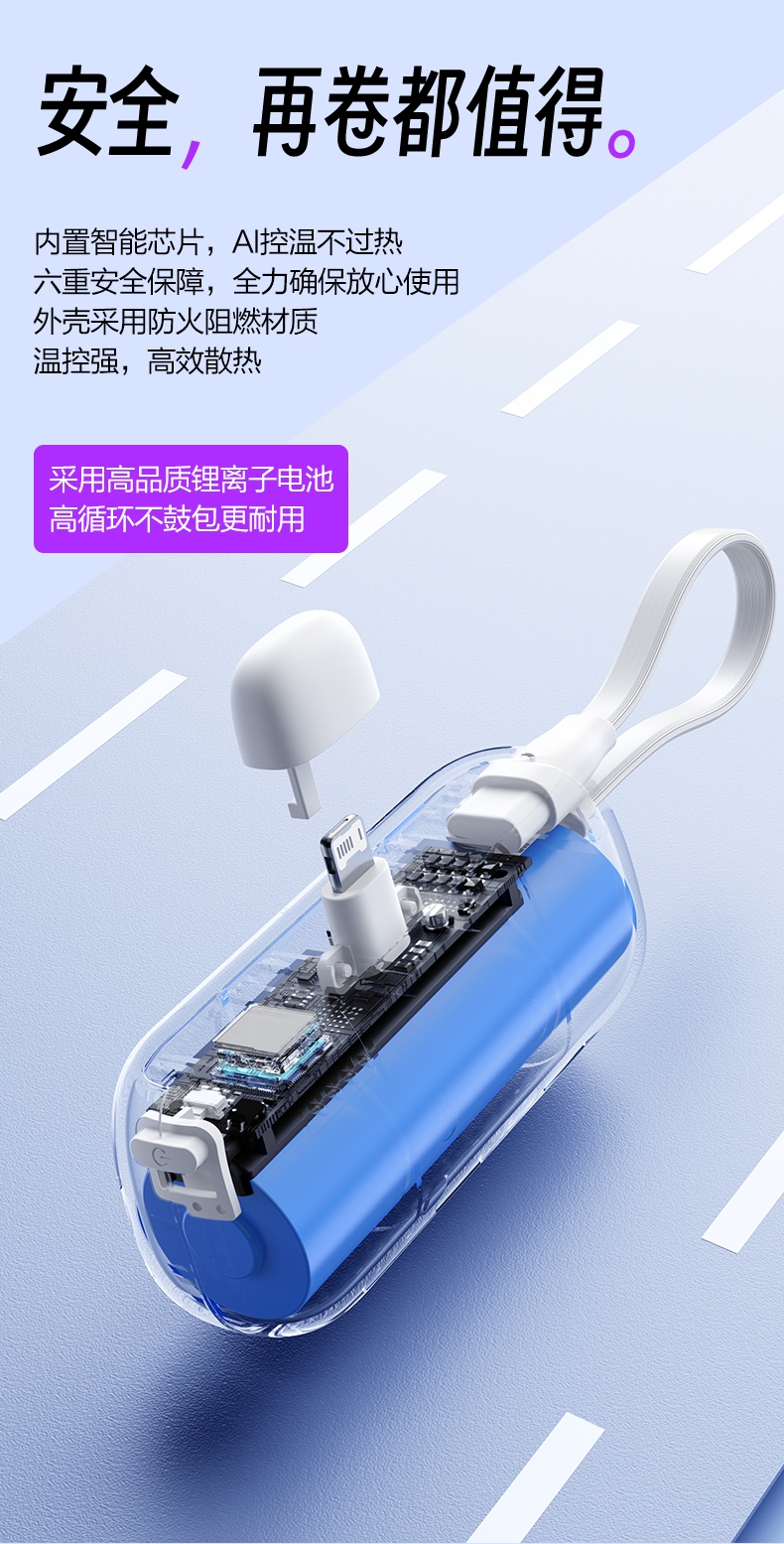 便携式胶囊外形设计,超小超便携,轻量随身;即插即充,支持两台设备同时充电;支持LED灯显,实时显示剩余电量,随心掌控;收纳式支架设计,畅享解放双手,充电刷剧两不误;4500mAh聚合物电芯,挂绳式线材,便捷实用