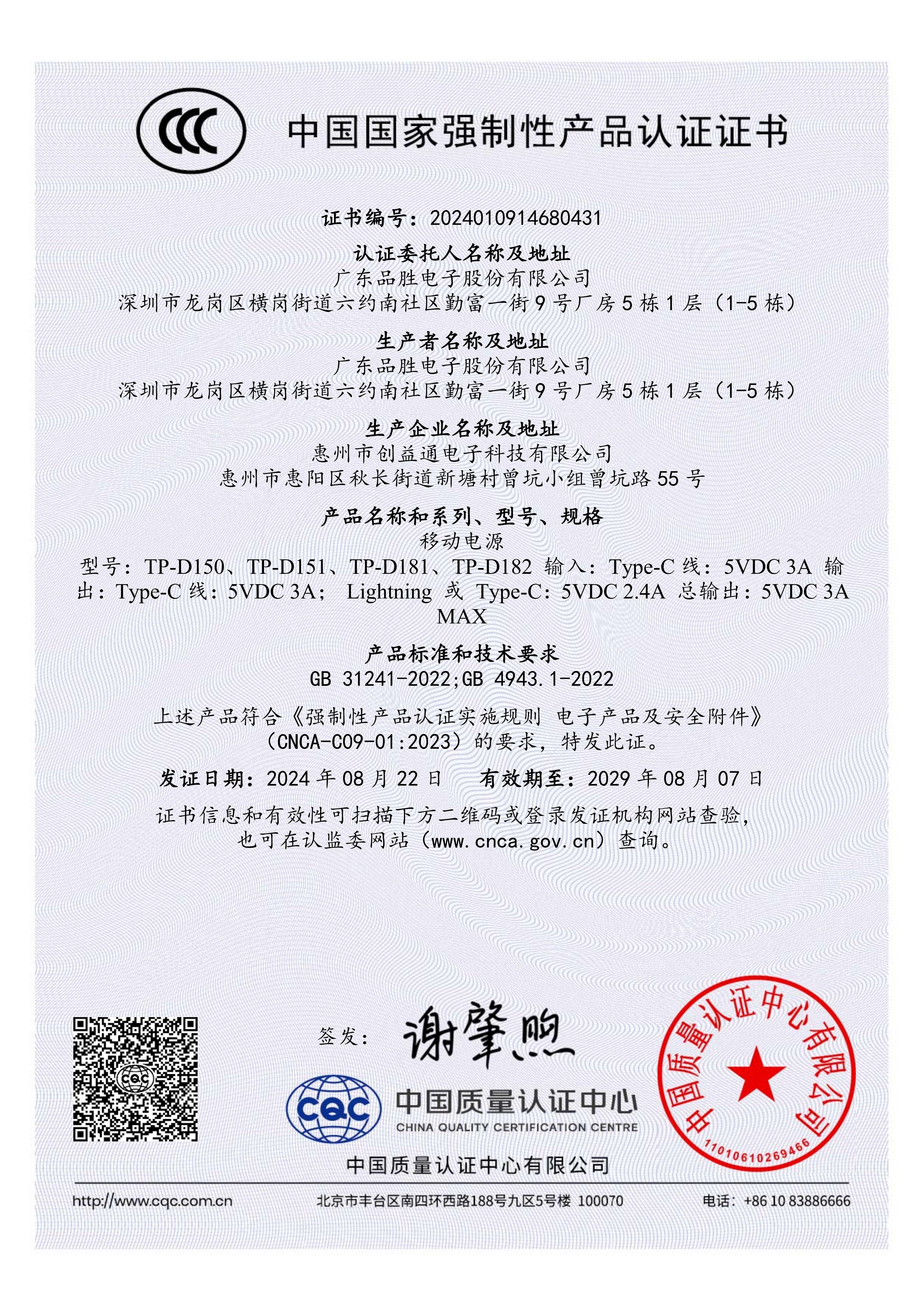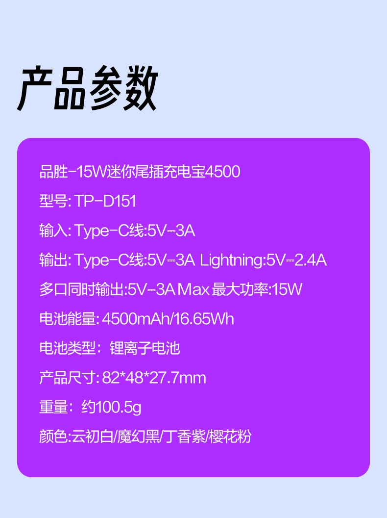品胜 15W便携尾插充电宝TP-D151