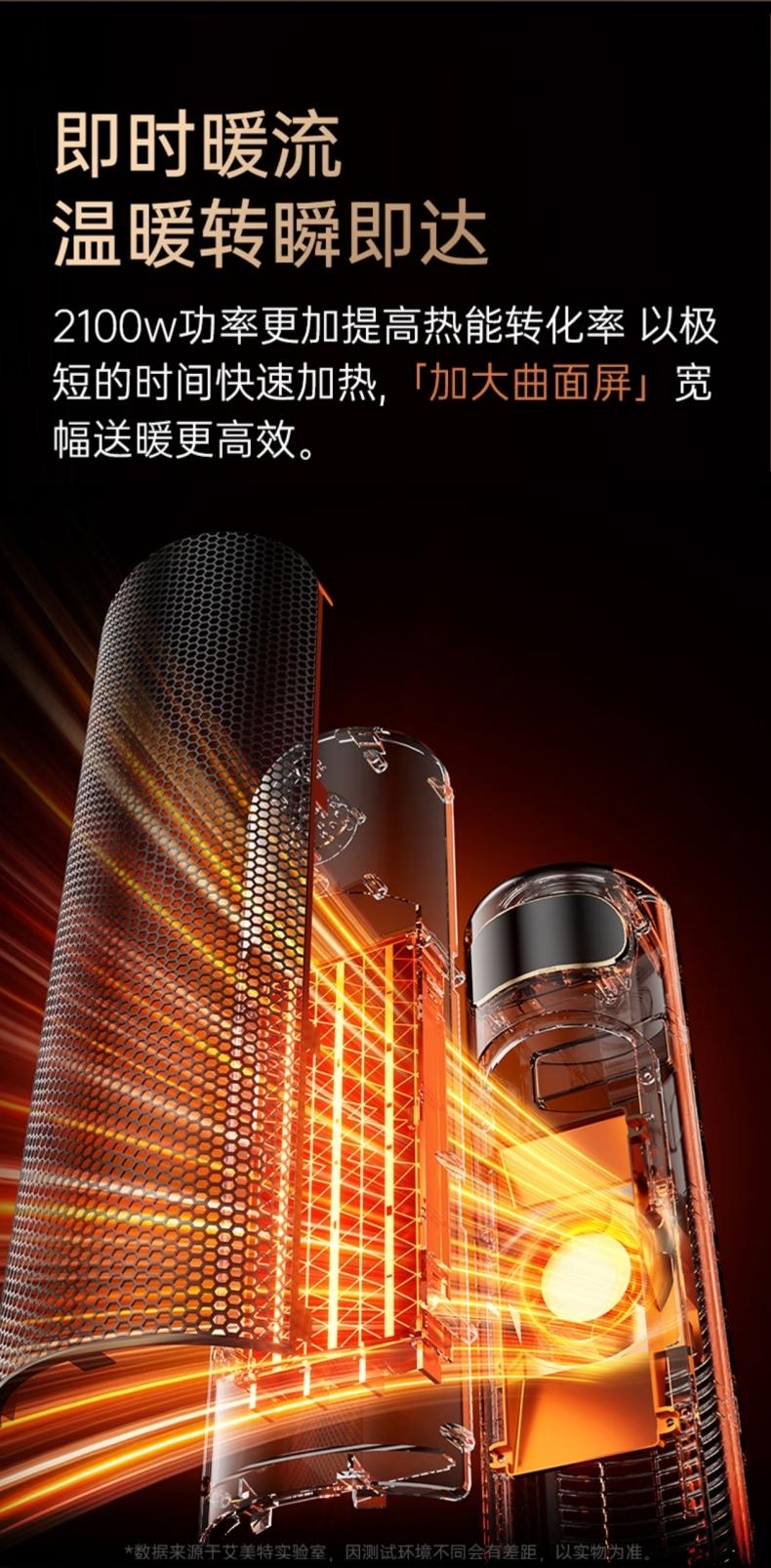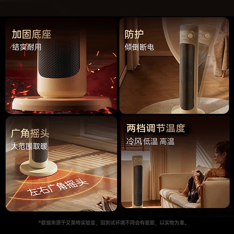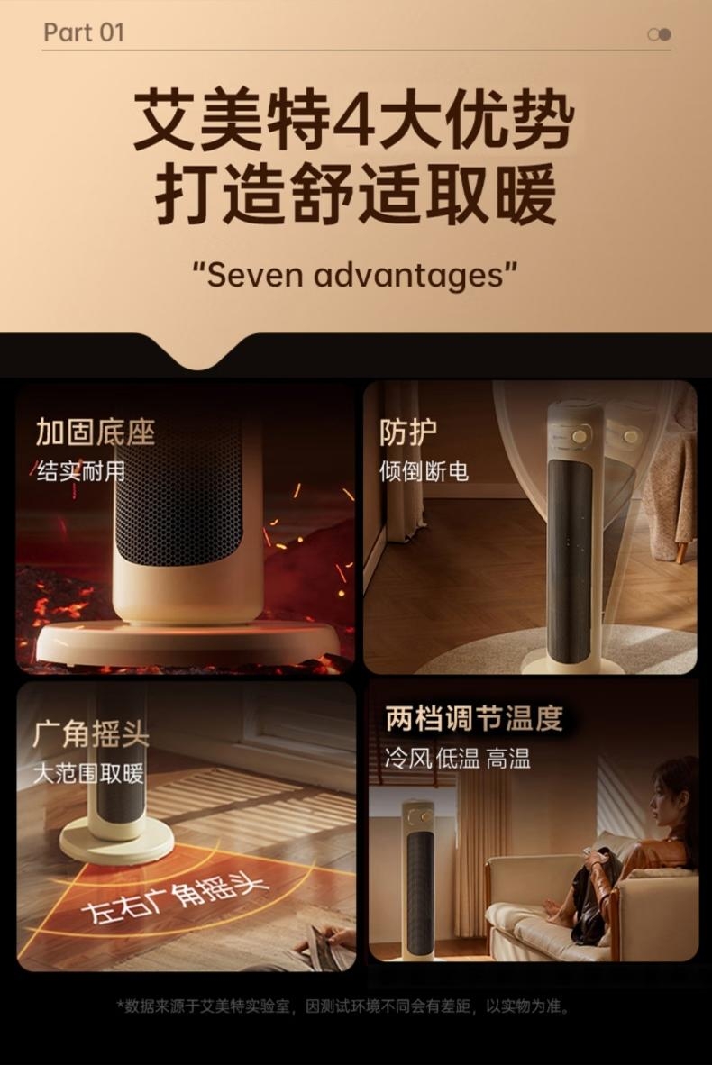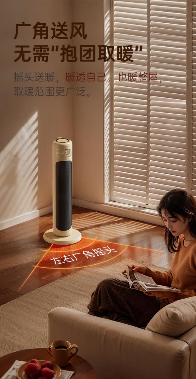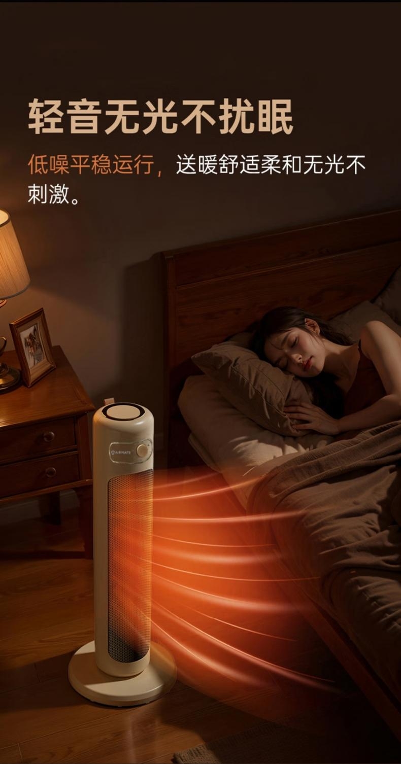 PTC复合陶瓷发热体强劲暖流,即开即热;石墨烯渗透 取暖不干燥;大广角摇头取暖,整屋受热更加立体直接;低档自然风, 中档1400W,高档2100W三档温;双擎直流变频低音风轮,高效出热风,无光污染