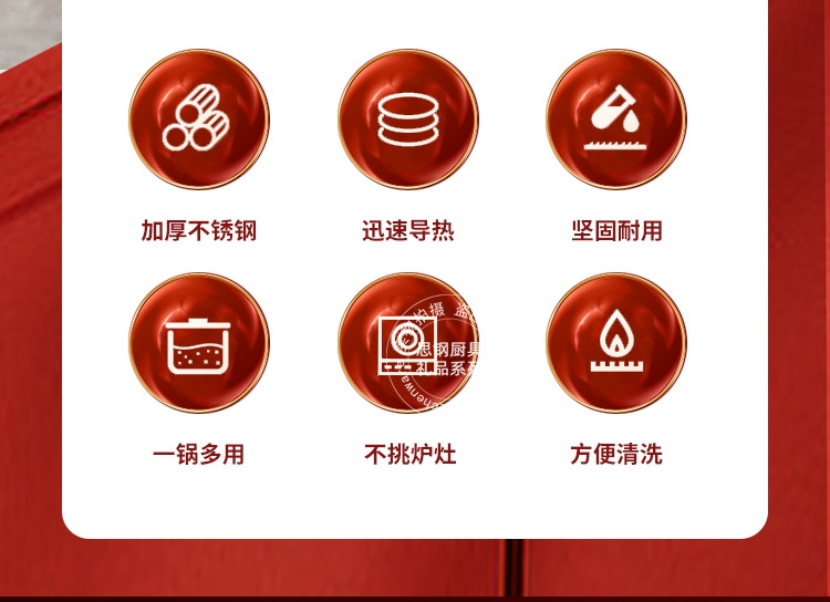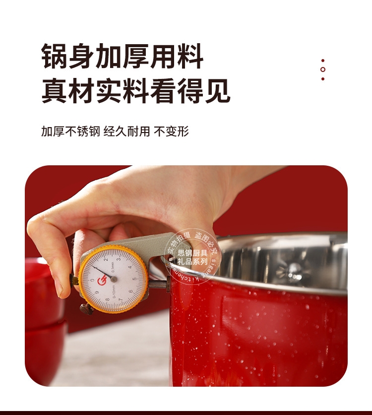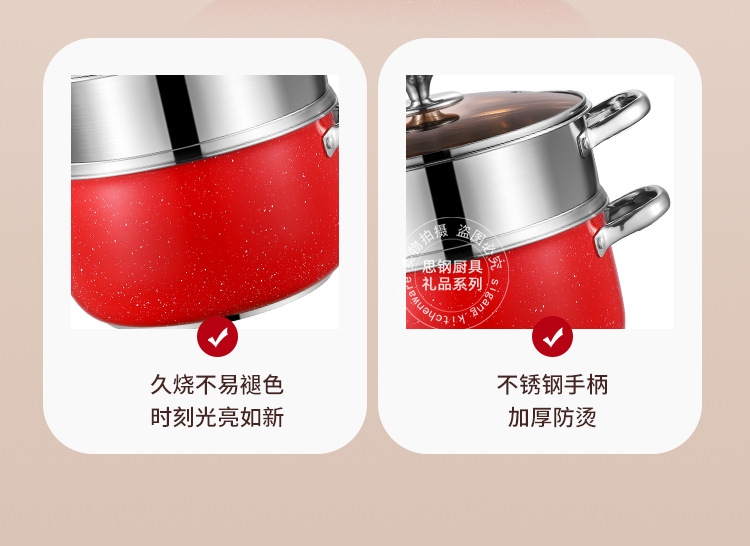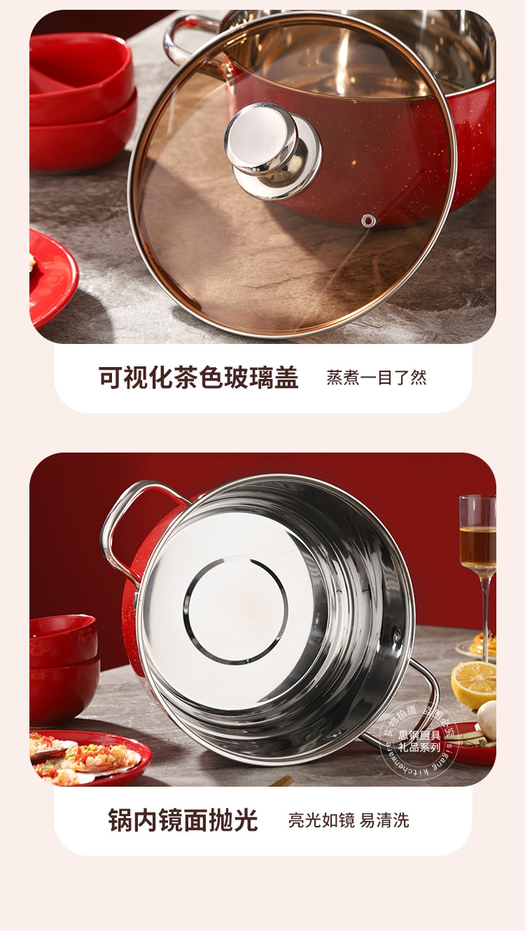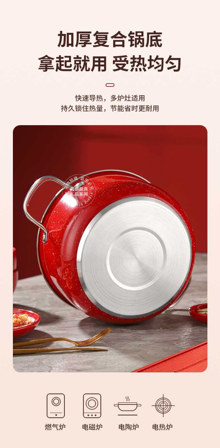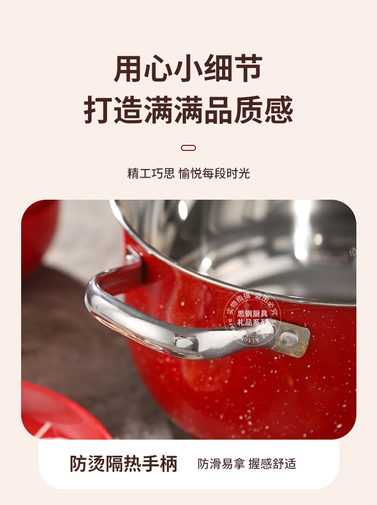 精美包装;精心选择红色锅体高温烤漆,耐用不掉漆;靓丽的外表,醒目的配色