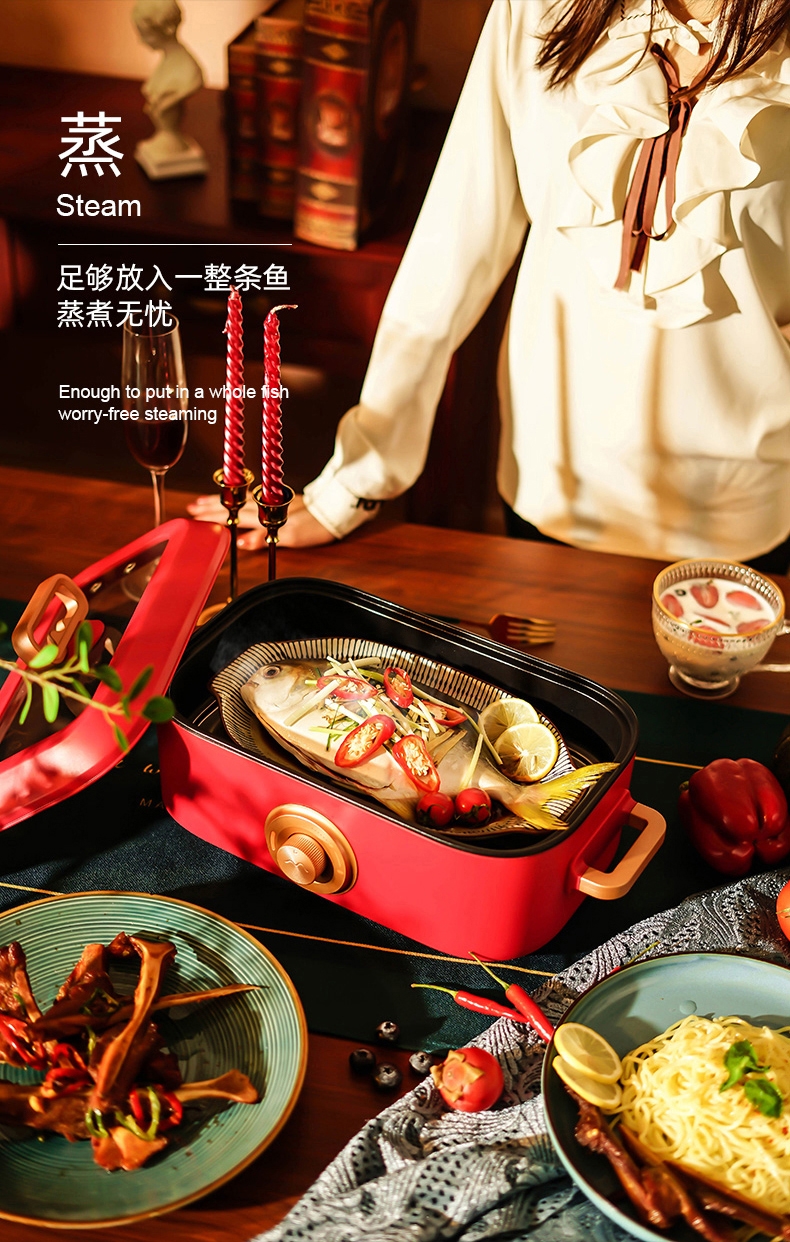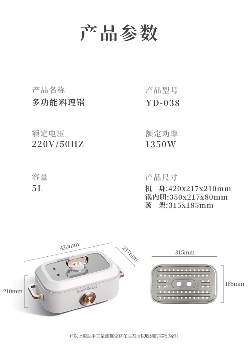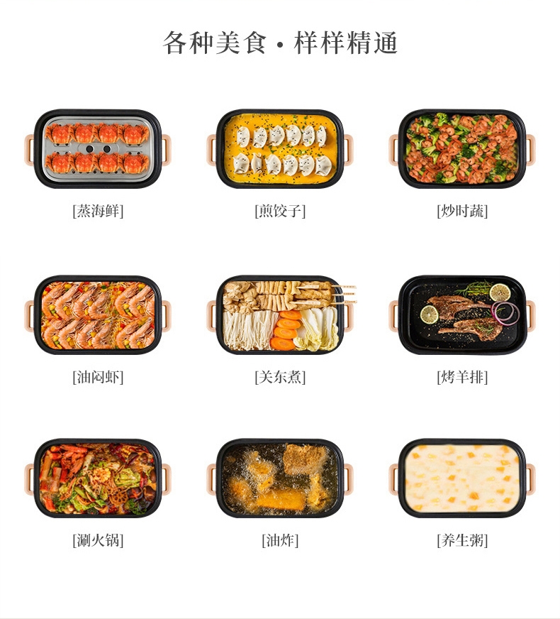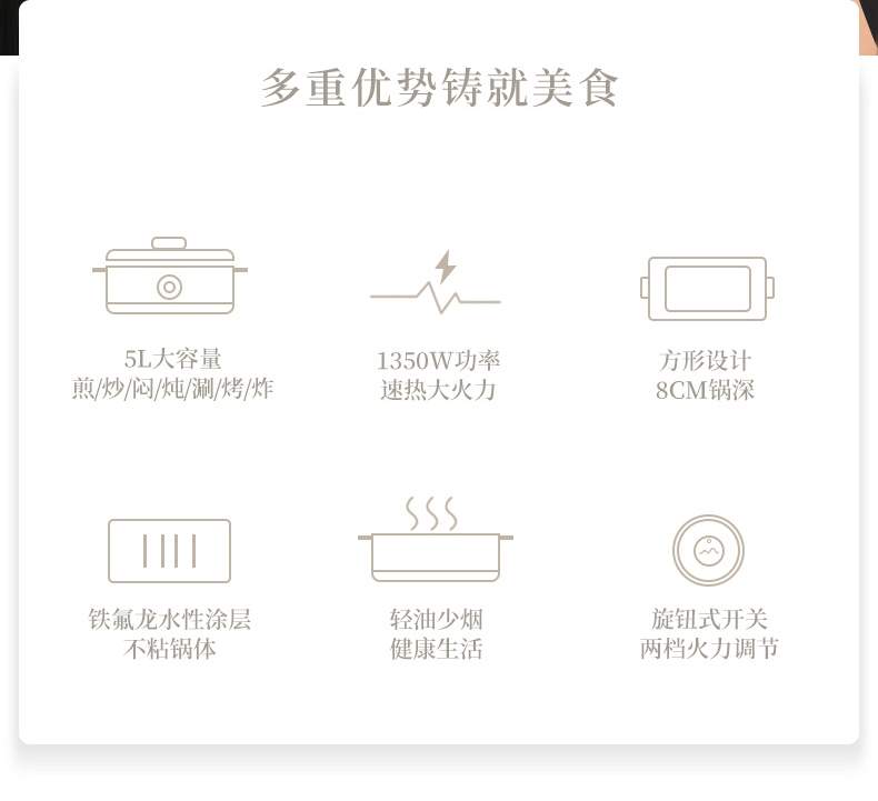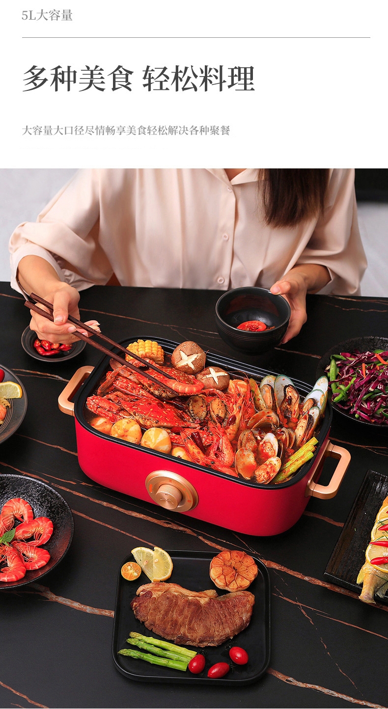 多种美食 轻松料理5L大容量大口径尽情畅享美食轻松;双档机械操控简易便捷 体面优雅随行;铁氟龙水性涂层不粘锅易清洗耐用不发热一冲一擦即净;一锅多用蒸/煎/炒/闷/炖/烤/涮/炸多餐美味;1350W大功率旋钮开关两档火力调温控制