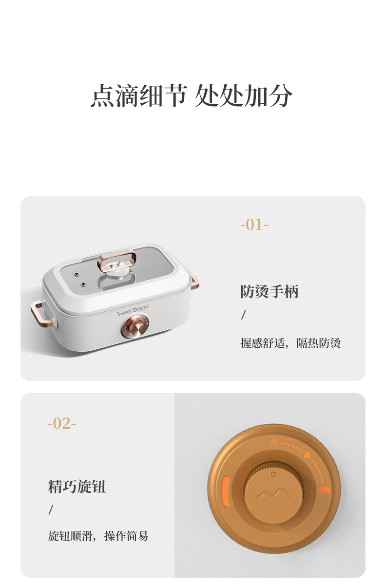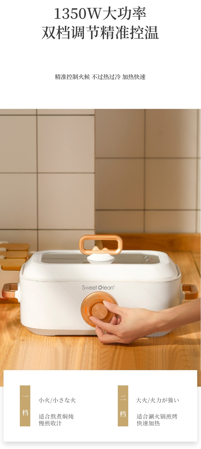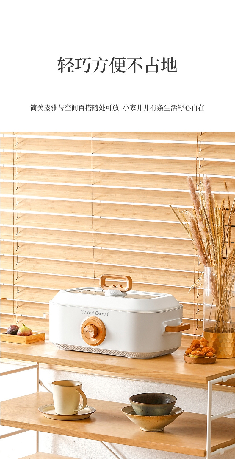 多种美食 轻松料理5L大容量大口径尽情畅享美食轻松;双档机械操控简易便捷 体面优雅随行;铁氟龙水性涂层不粘锅易清洗耐用不发热一冲一擦即净;一锅多用蒸/煎/炒/闷/炖/烤/涮/炸多餐美味;1350W大功率旋钮开关两档火力调温控制