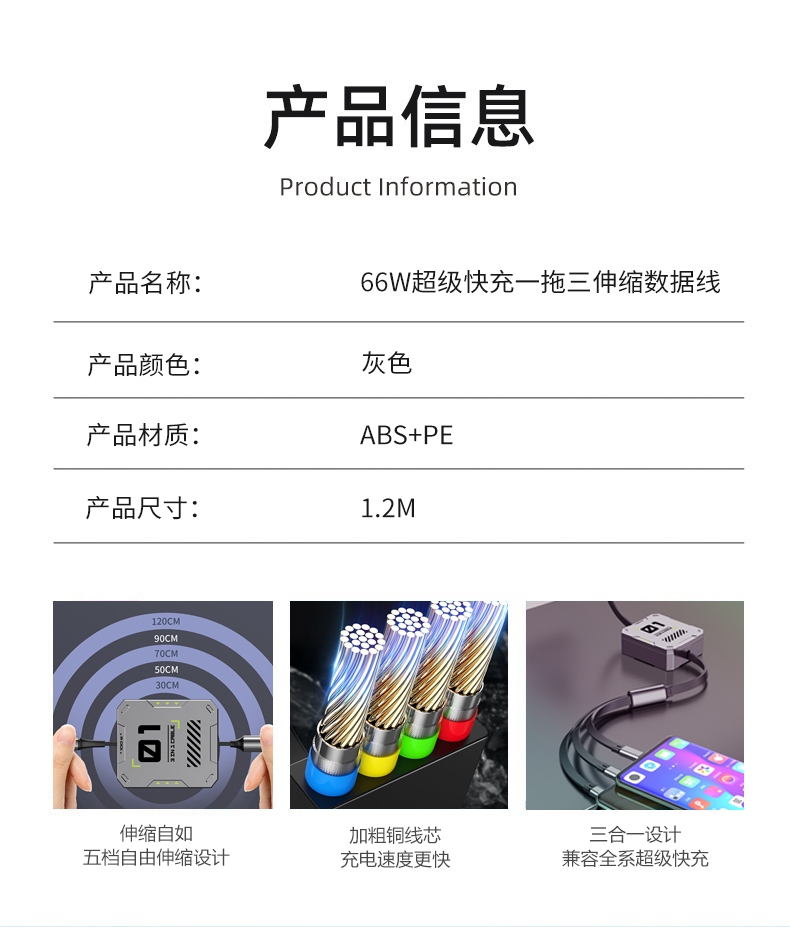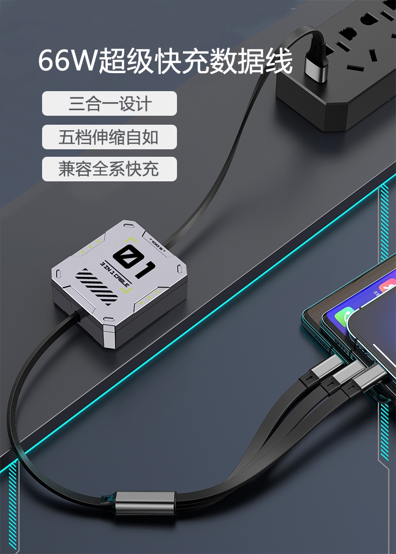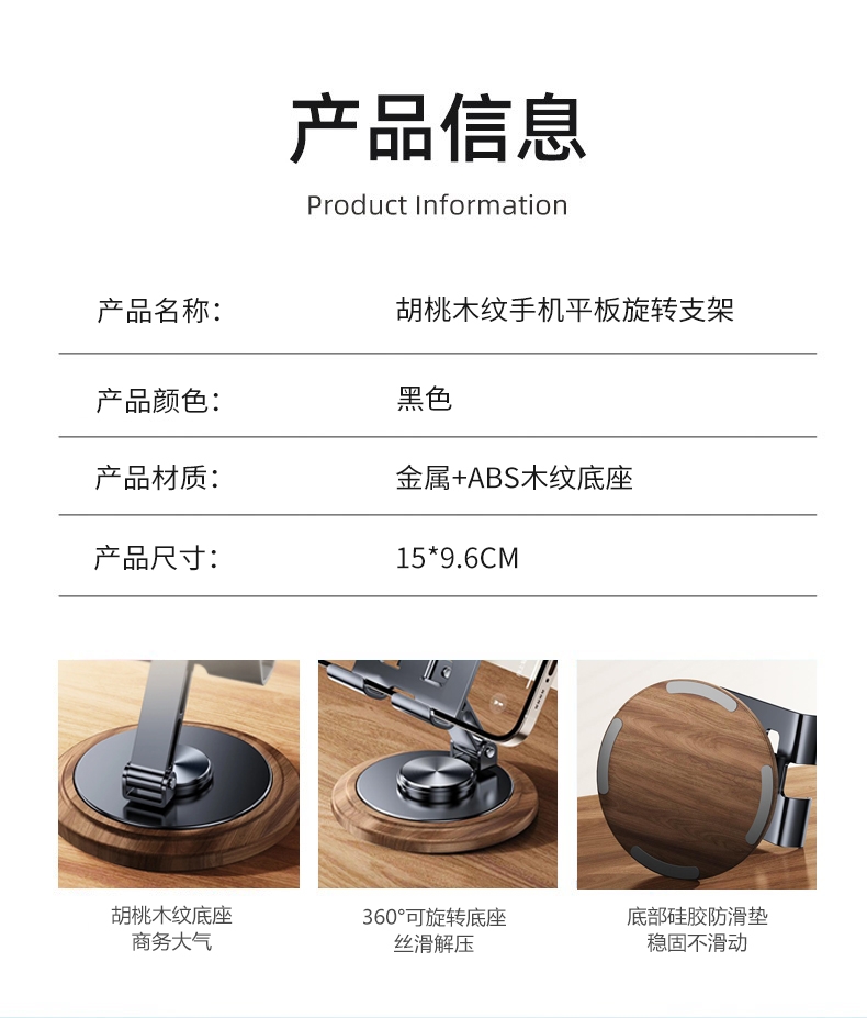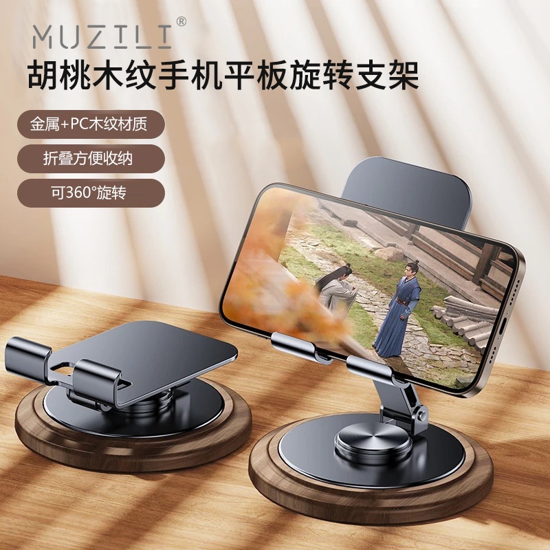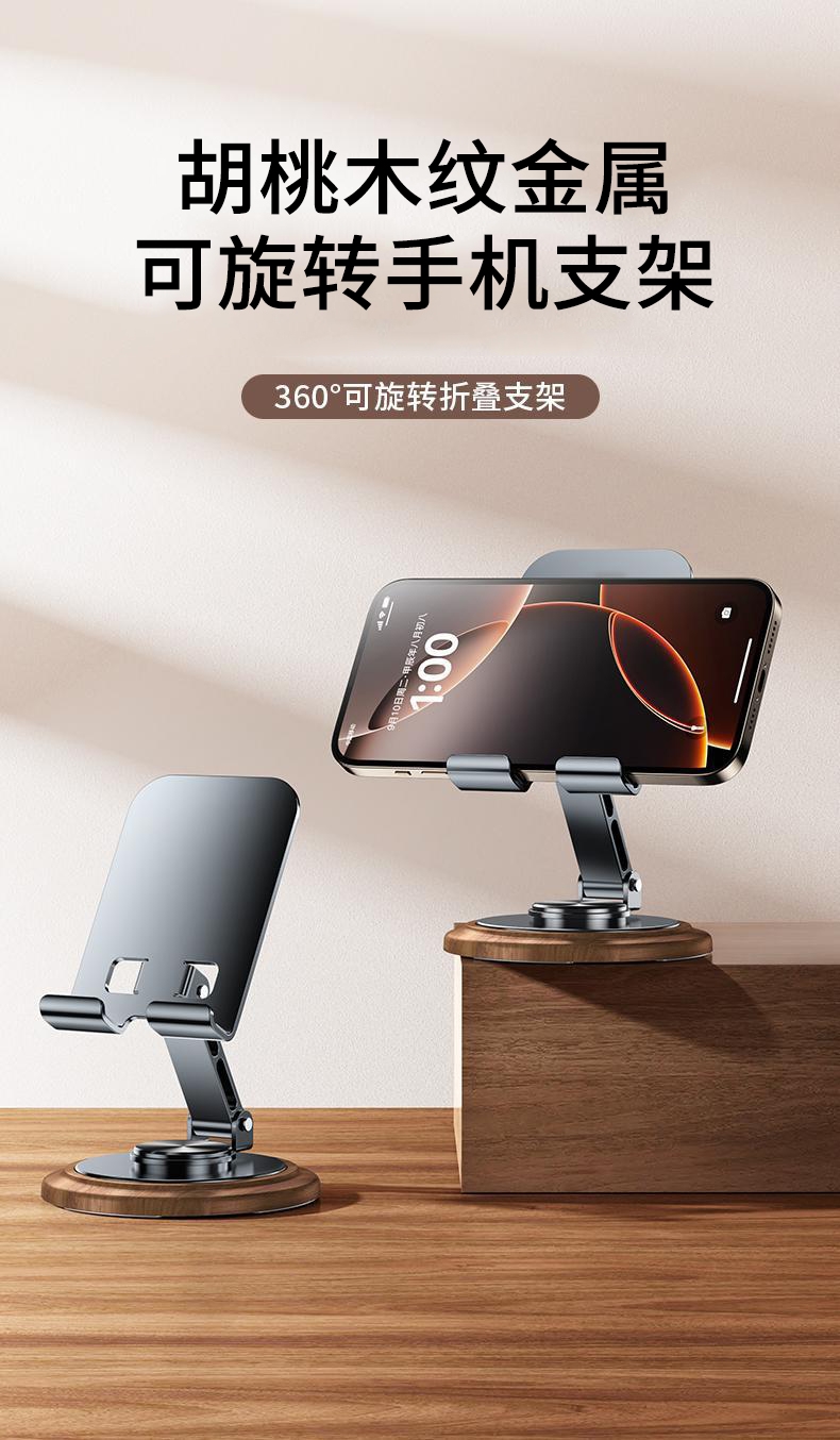 商务款手机平板桌面旋转支架 仿黑胡桃木纹商务大气;360°可旋转金属支架 支撑力强劲,预留充电口位;66W超级快充一拖三伸缩数据线 兼容苹果15系列 ;五档伸缩调节 1.2米长度设计 TPE材质经久耐用;三种充电接口满足各种手机