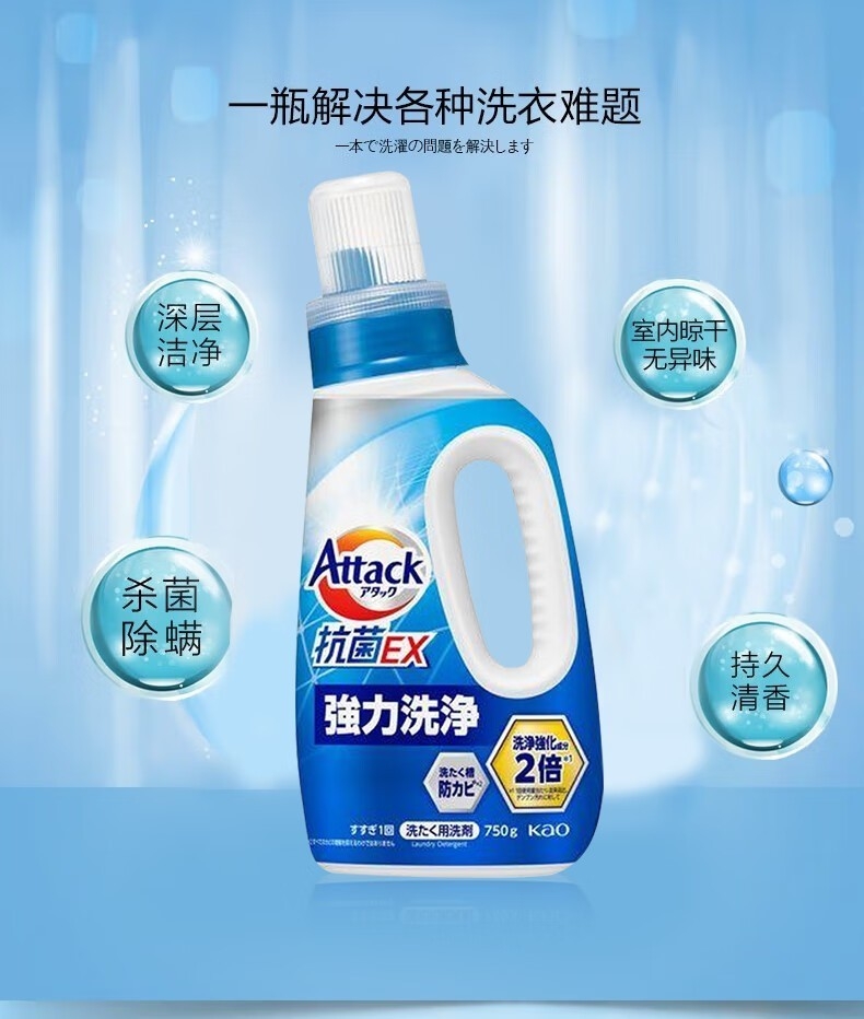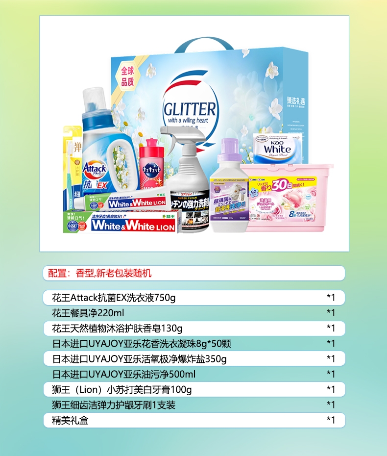 配置清单:配置明细:香型随机 花王Attack抗菌EX洗衣液750g*1 花王(KAO)餐具净220ml*1 花王(KAO)天然植物沐浴护肤香皂130g*1 日本UYAJOY亚乐花香洗衣凝珠8g*50颗*1 日本UYAJOY亚乐活氧极净爆炸盐350g*1 日本UYAJOY亚乐油污净500ml*1 狮王(Lion)小苏打美白牙膏100g*1 狮王(lion)细齿洁弹力护龈牙刷1支装*1 浅蓝臻选礼遇中彩盒ZS192*1