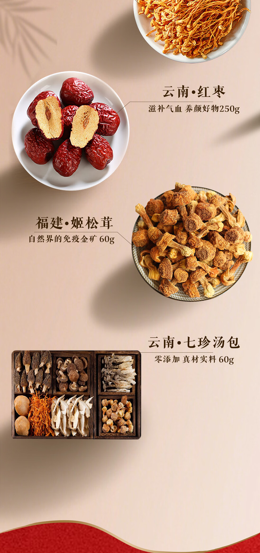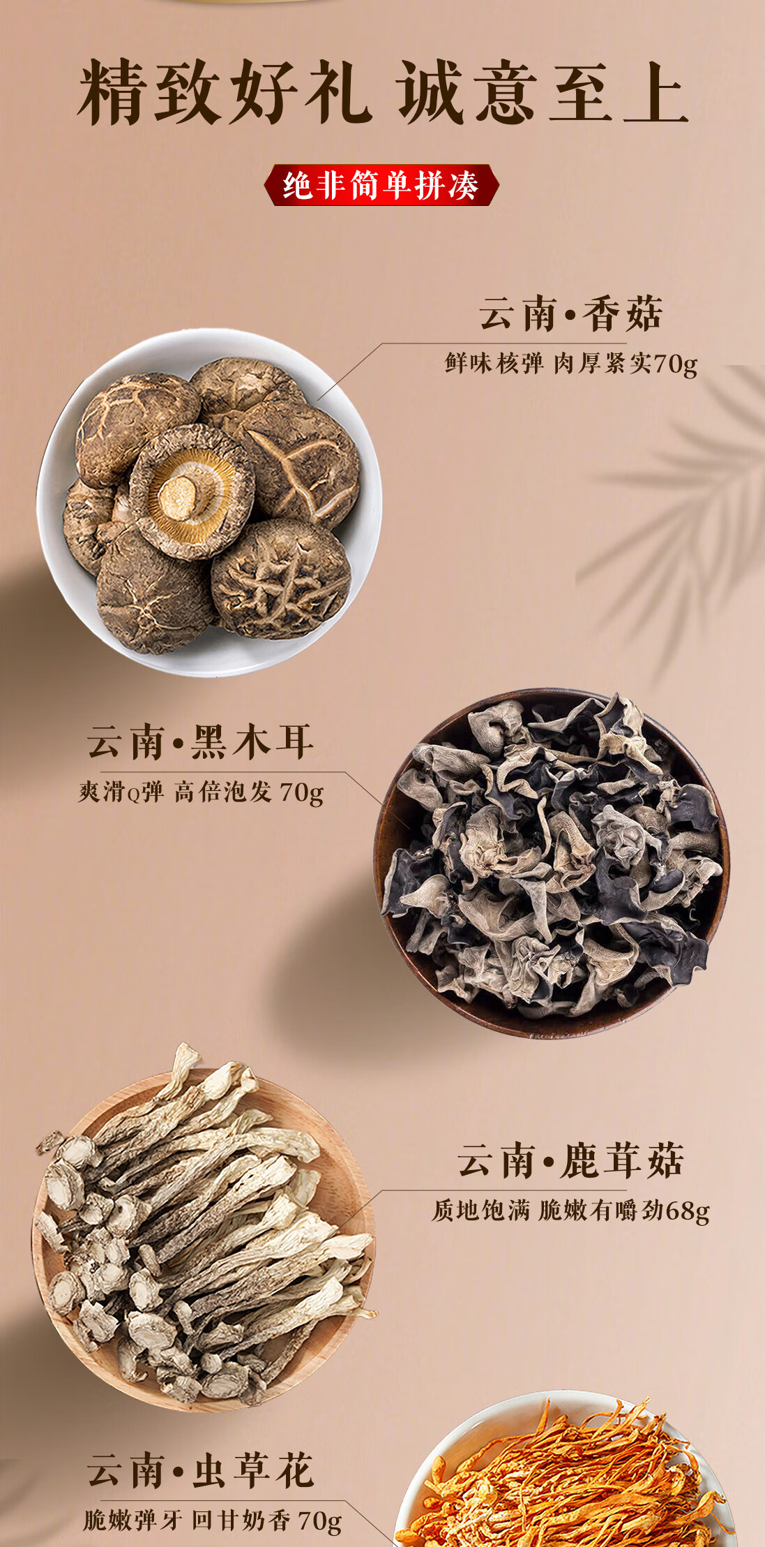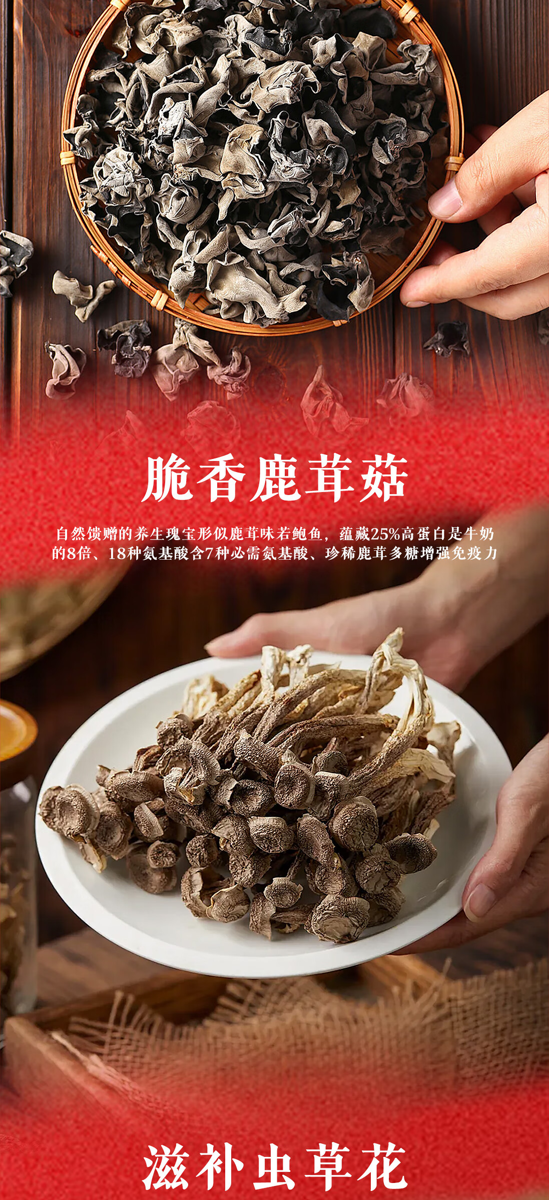 配置清单:姬松茸60g*1、香菇70g*1、黑木耳70g*1、鹿茸菇68g*1、虫草花70g*1、红枣250g*1、养生汤包60g*1