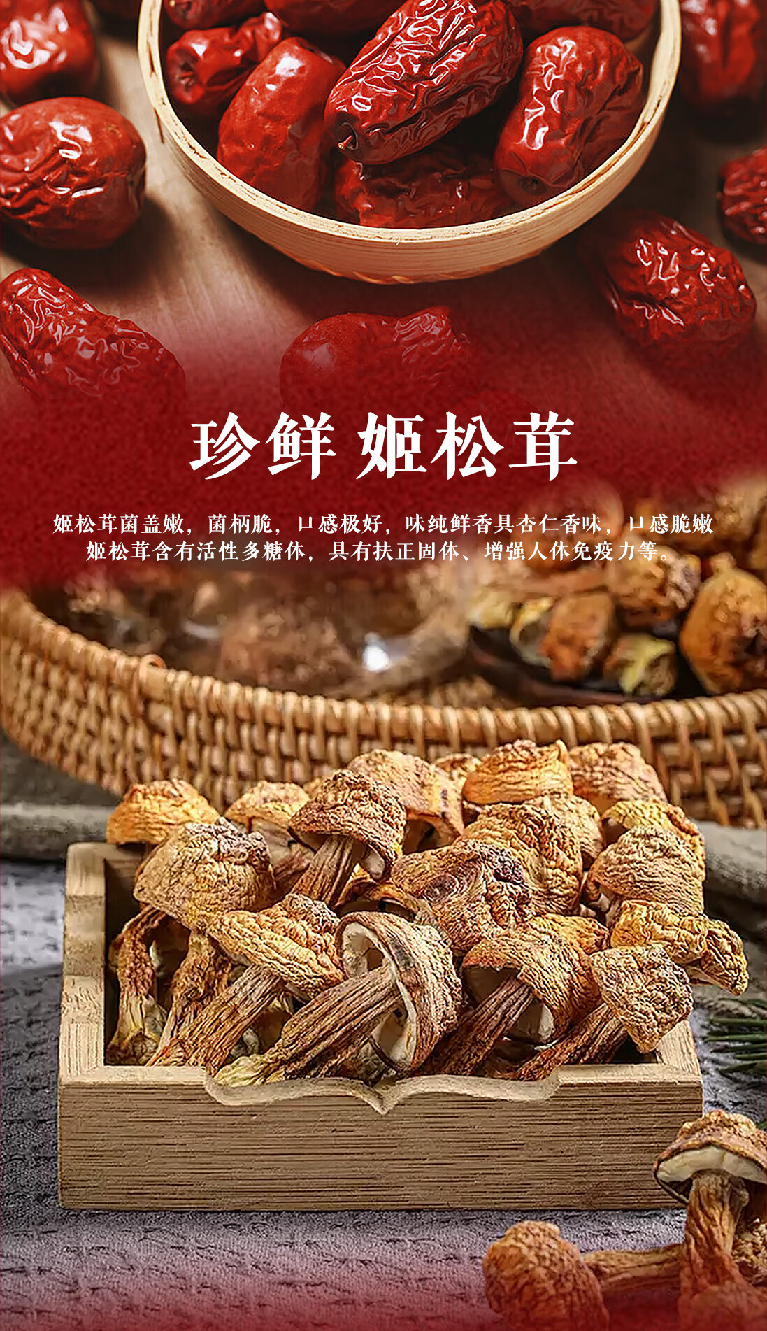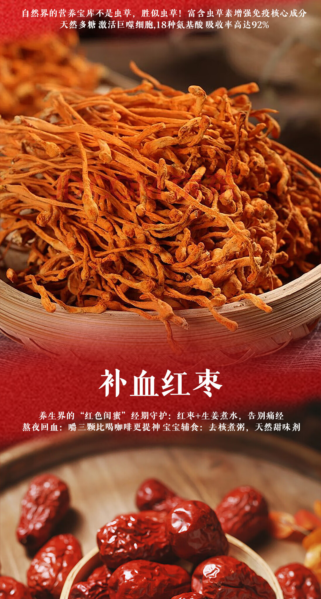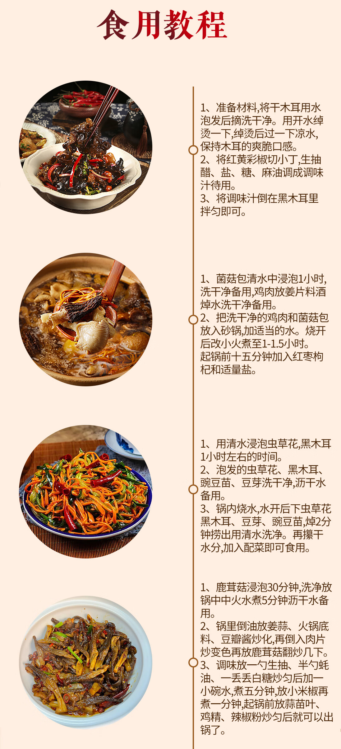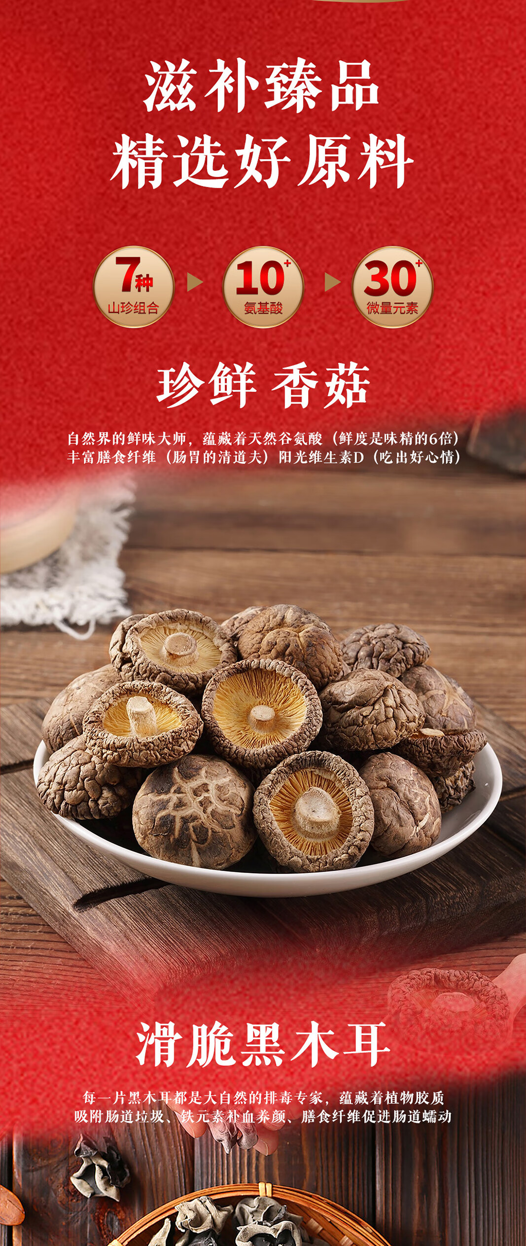配置清单:姬松茸60g*1、香菇70g*1、黑木耳70g*1、鹿茸菇68g*1、虫草花70g*1、红枣250g*1、养生汤包60g*1