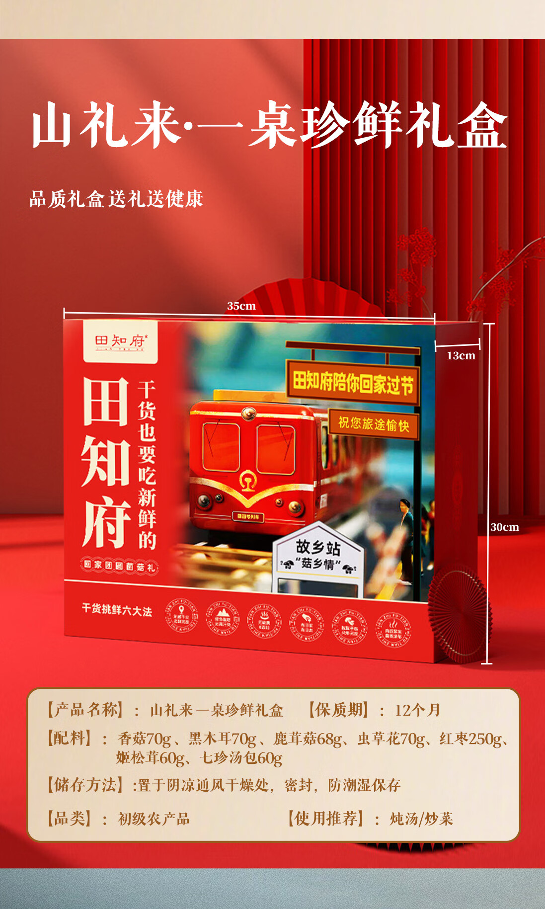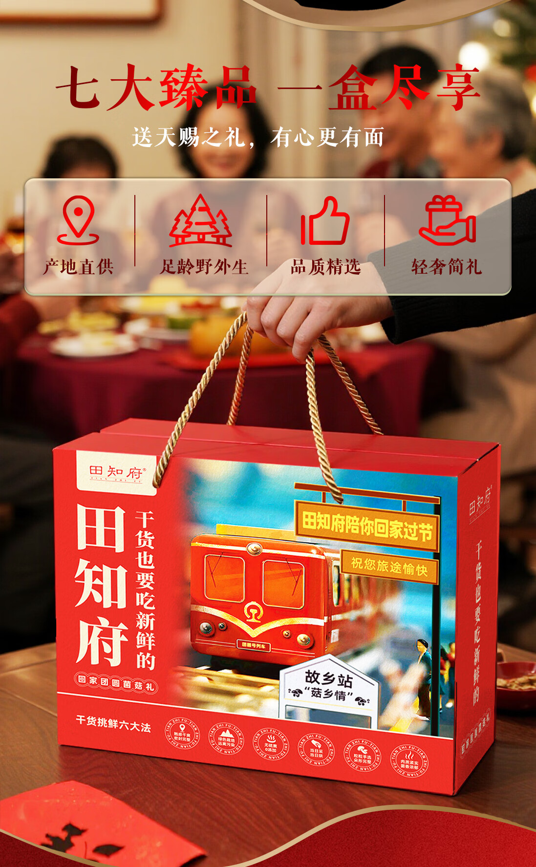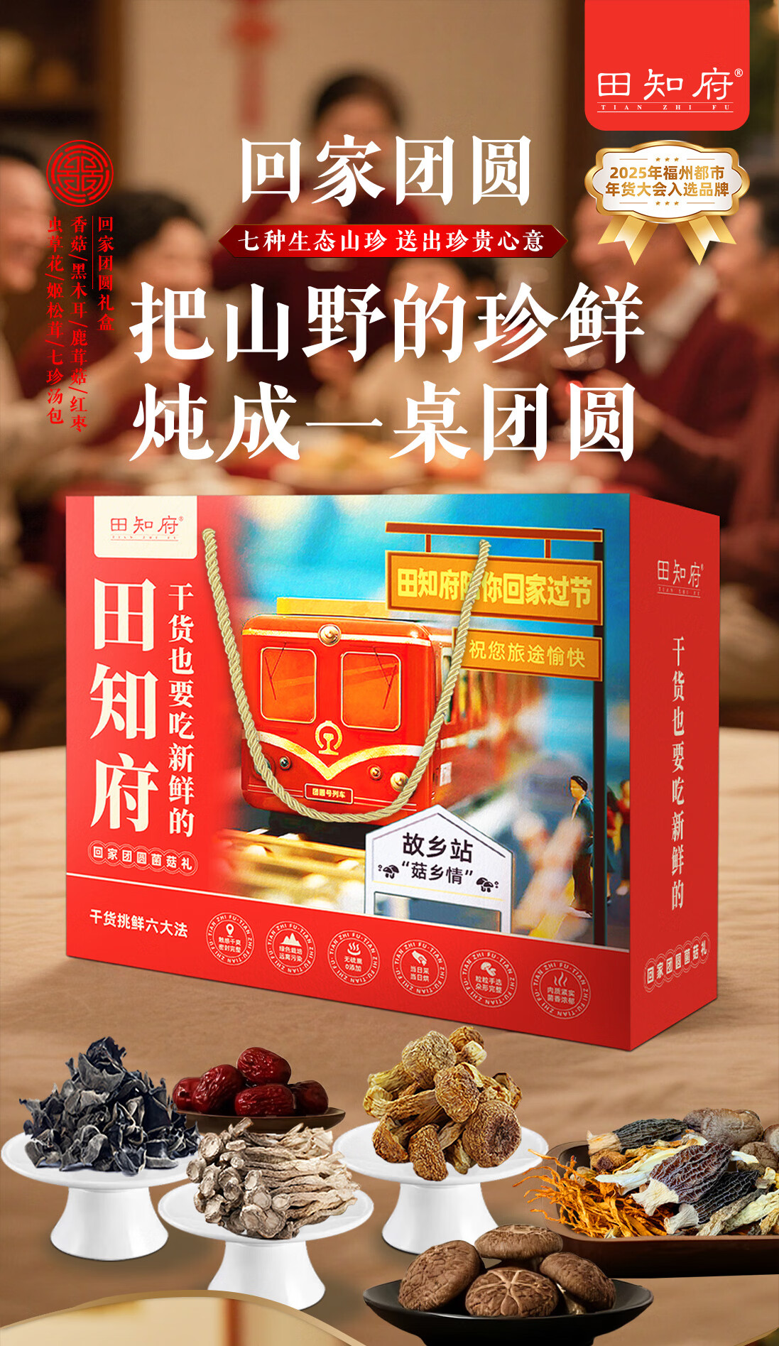 田知府品牌荣获国宾礼称号;京东自营评论1000+。;源头厂家,邮政上架,支持授权,项目保护,可定制;回家团圆套餐,七种食材汇聚,菌香枣甜汤韵浓