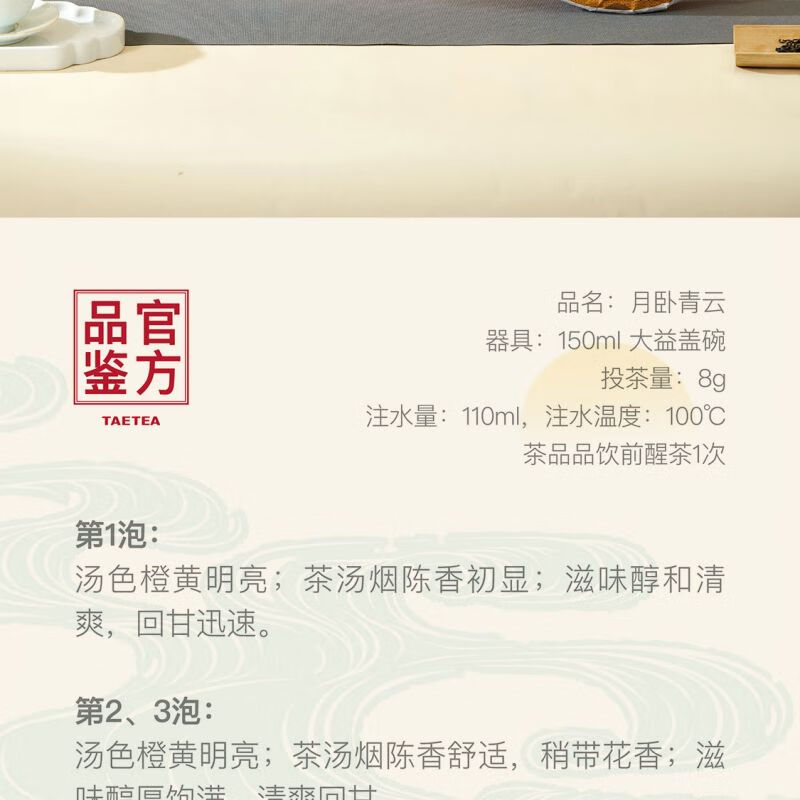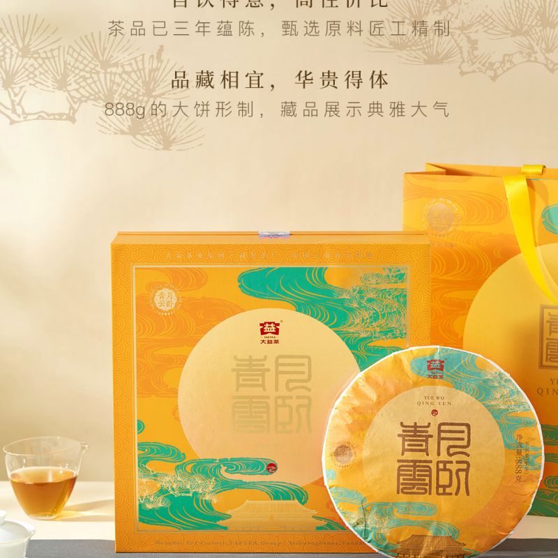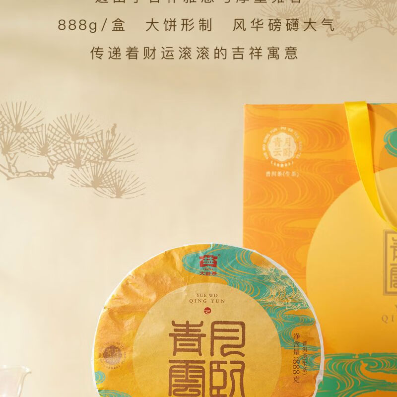 大益月卧青云以中秋团圆为核心主题,定位为高端节庆茶;选用云南普洱茶核心产区(勐海)的大叶种晒青毛茶;烟香与陈香协调交织,花香舒适,口感层次更丰富