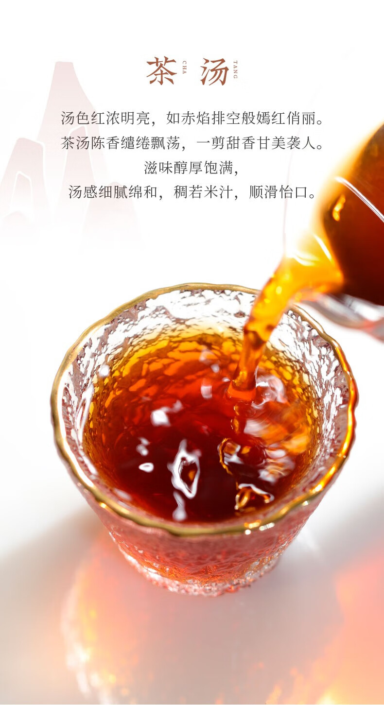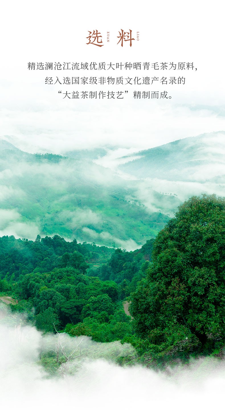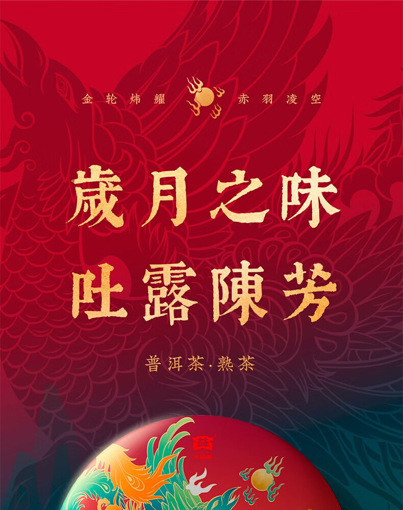 以“赤羽”象征茶叶条索紧结、色泽乌润如赤羽般艳丽夺;“金轮”寓意茶品品质如黄金珍贵;精选澜沧江流域优质大叶种晒青毛茶为原料